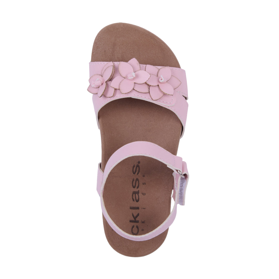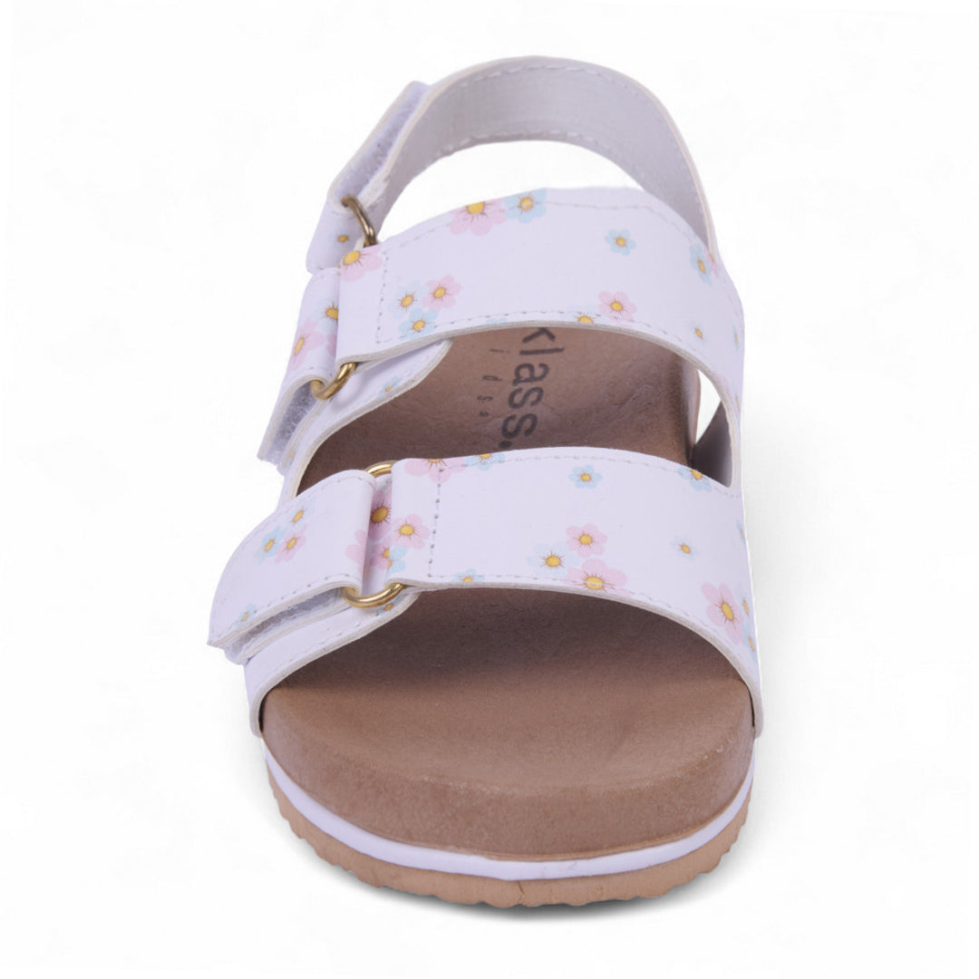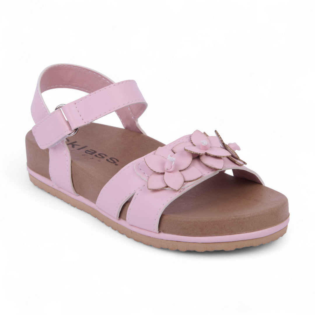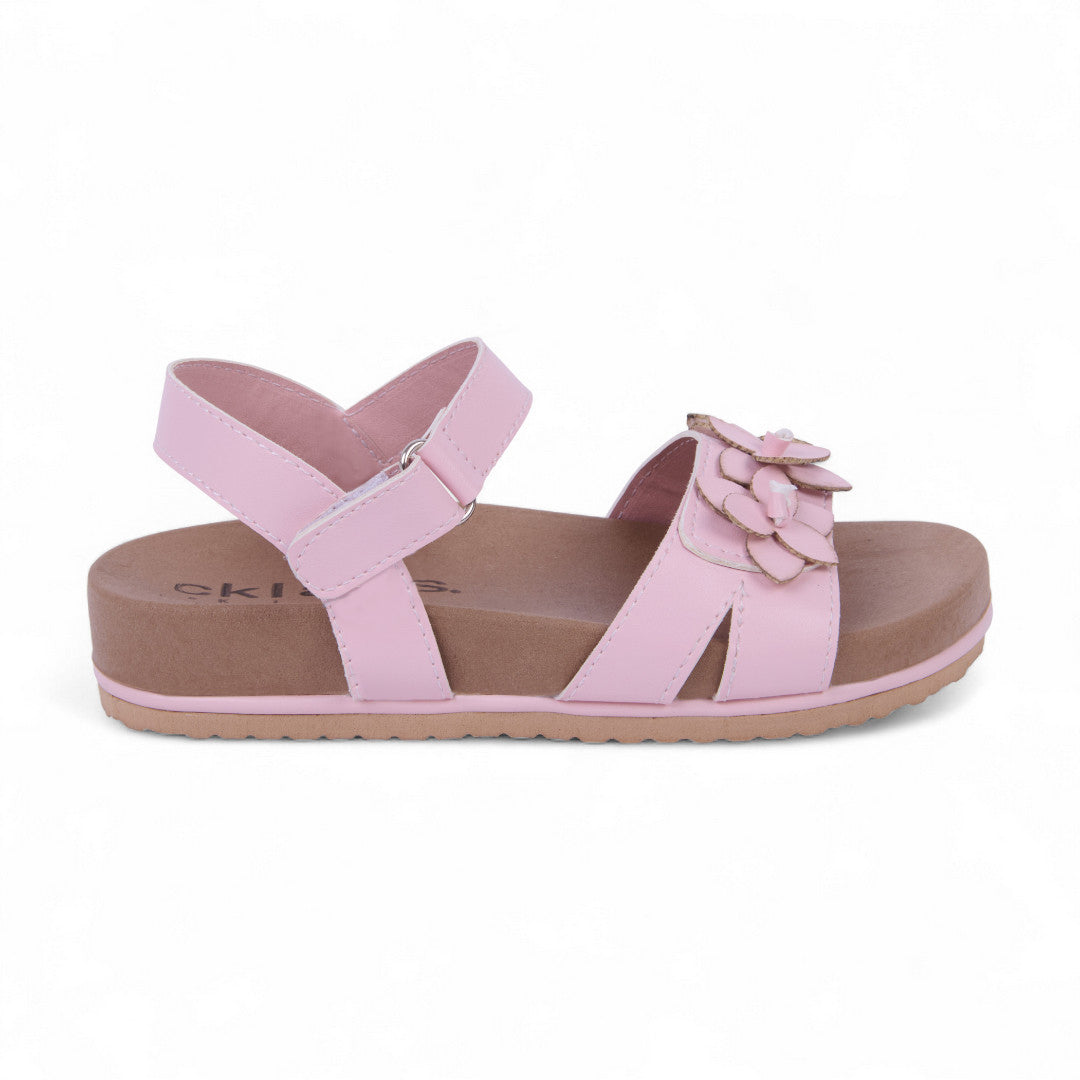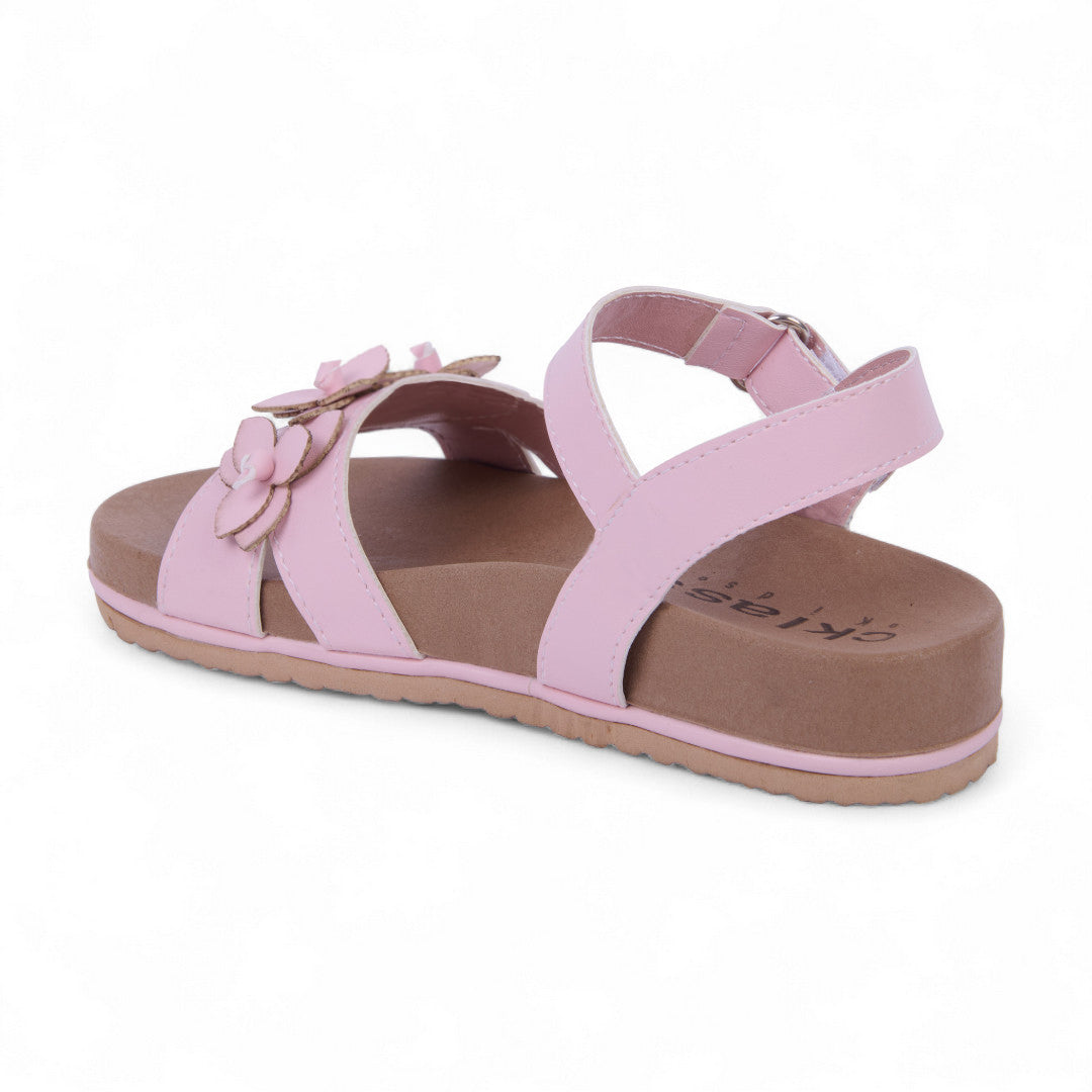 Dúo de sandalias de piso en rosa y blanco con detalle floral, látigos y pulseras ajustables con contactel; ligeras, cómodas y perfectas para uso diario infantil.