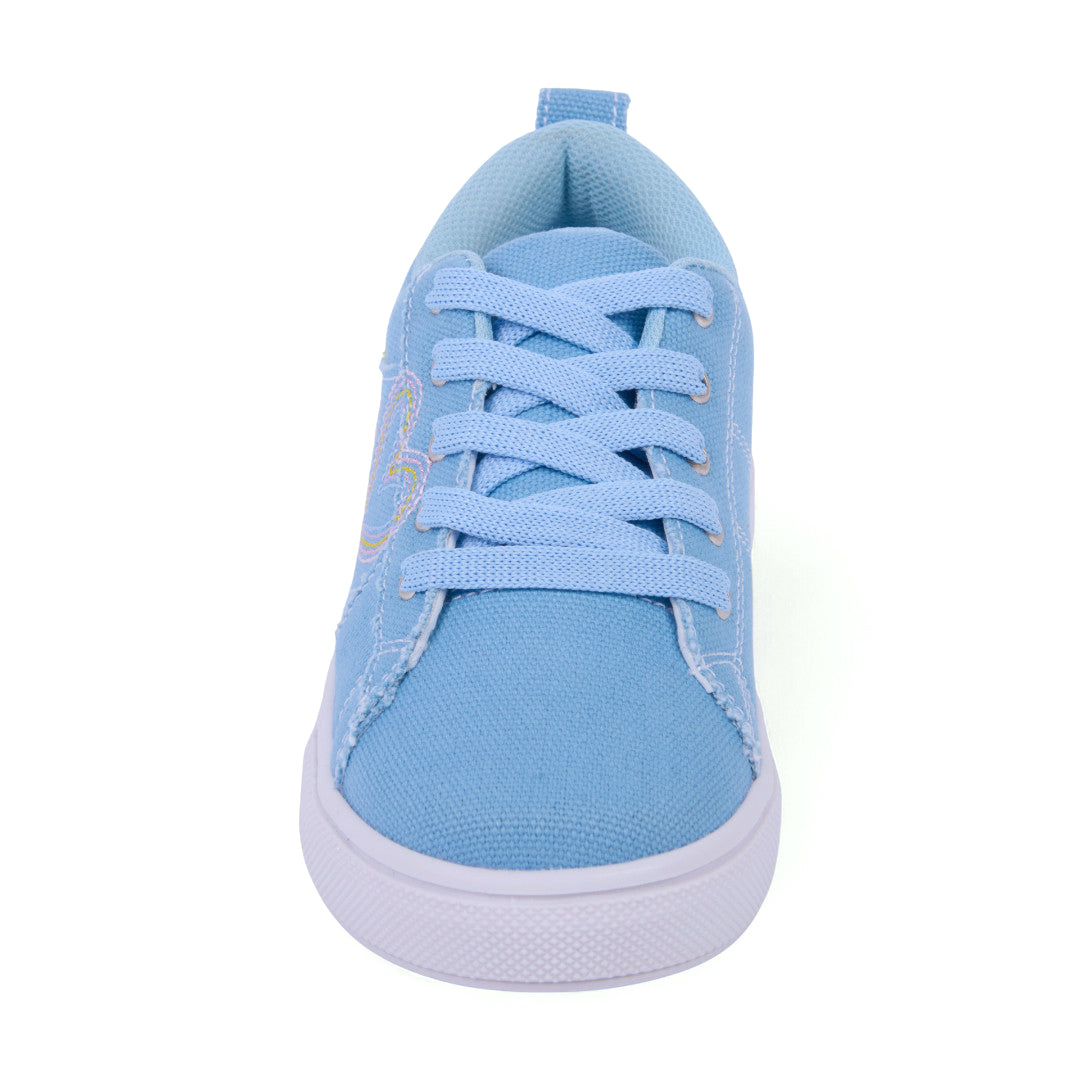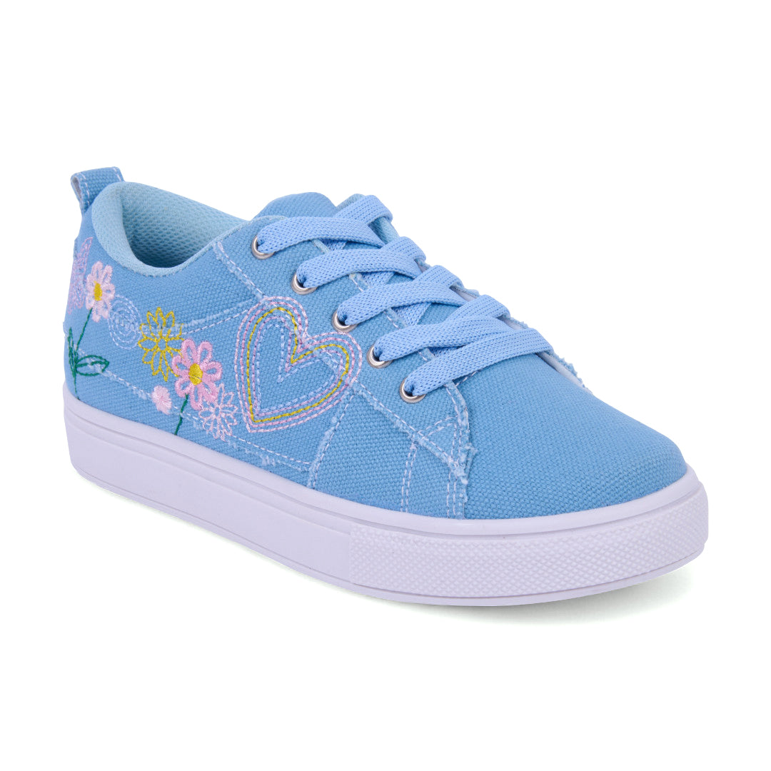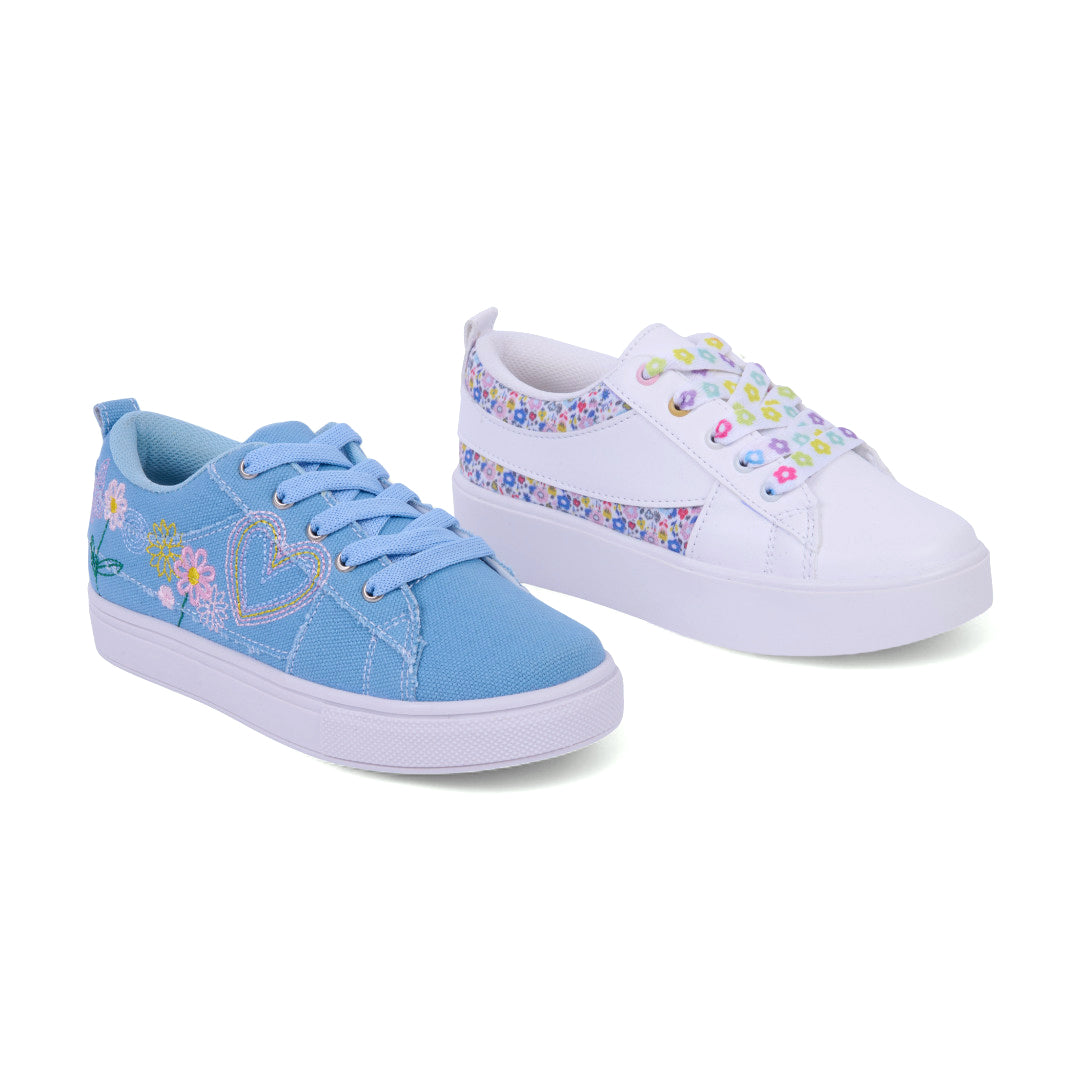 Dúo de tenis casuales en tonos azul y blanco: modelo azul con bordados florales y modelo blanco con estampado lateral y cintas decorativas. Plantilla textil ligera y materiales sintéticos y textiles combinados.