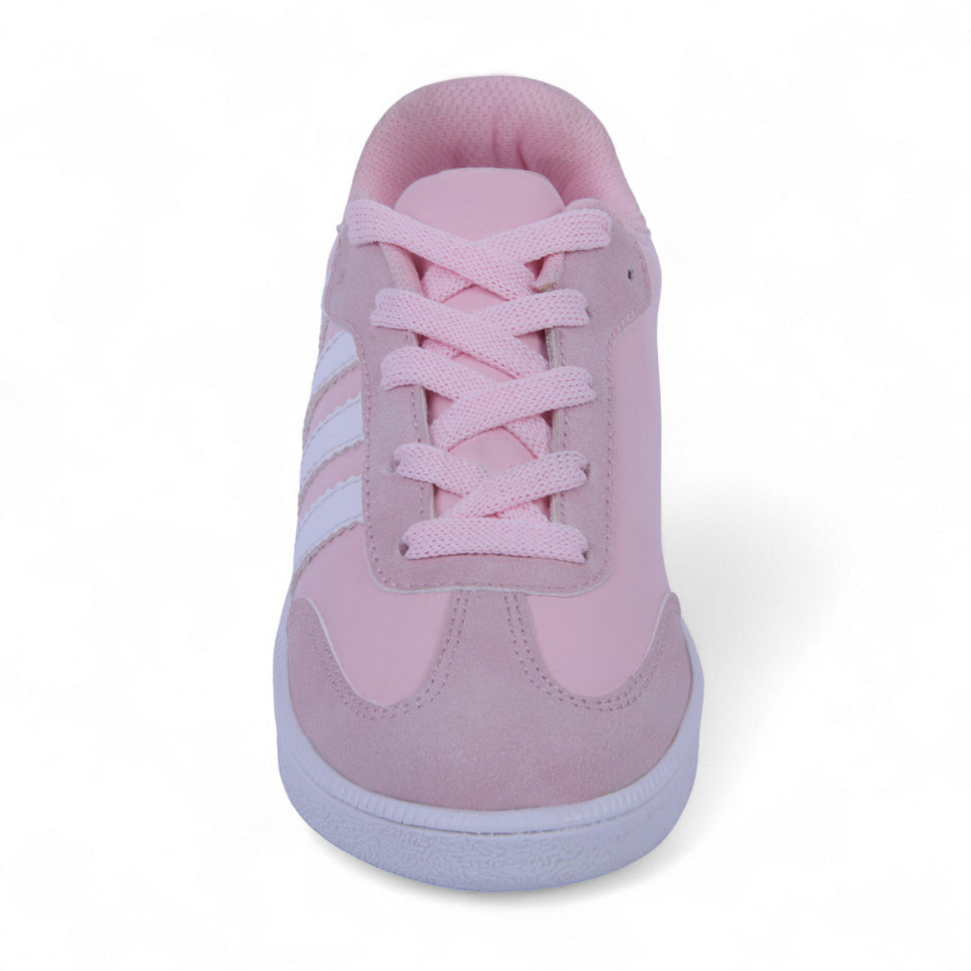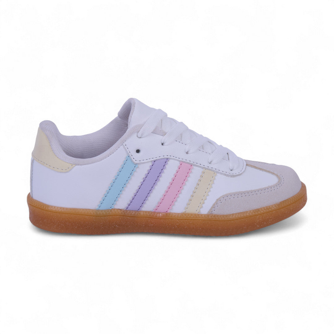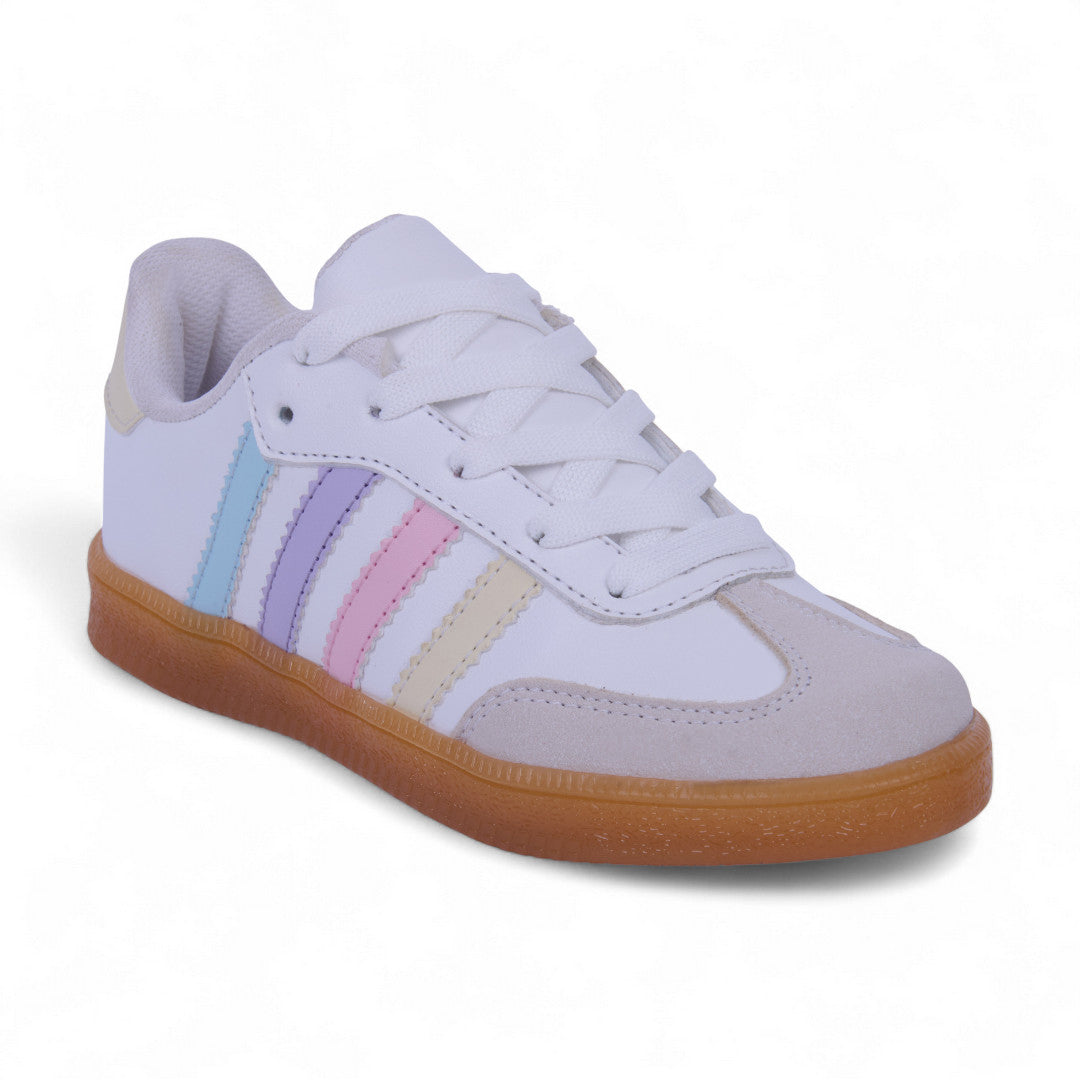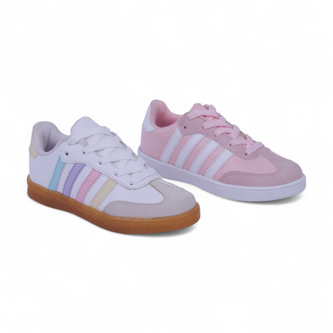 Dúo de tenis casual en colores rosa y multicolor, con cintas y diseño ligero ideal para uso diario, looks urbanos o combinaciones juveniles.