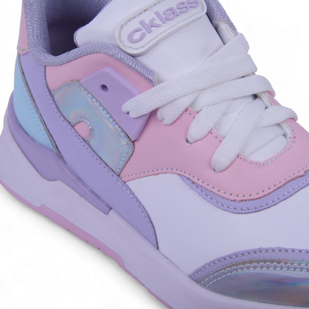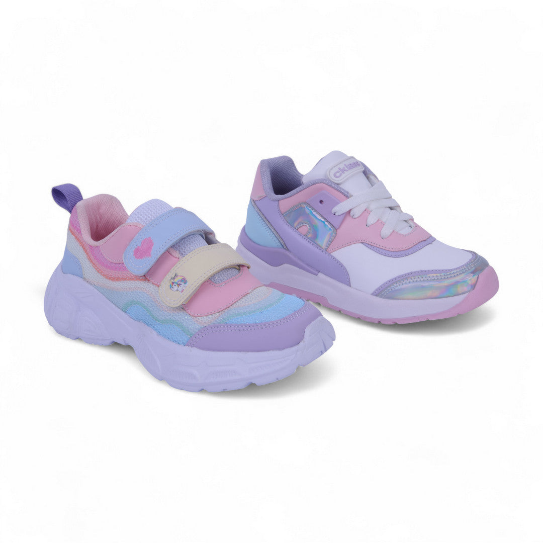 Dúo de tenis casuales para mujer que combina un modelo blanco con detalles en contraste y cintas, y un modelo multicolor con látigos ajustables de contactel. Elaborados en material sintético con plantilla textil cómoda, ideales para looks urbanos, uso diario y máxima versatilidad.
