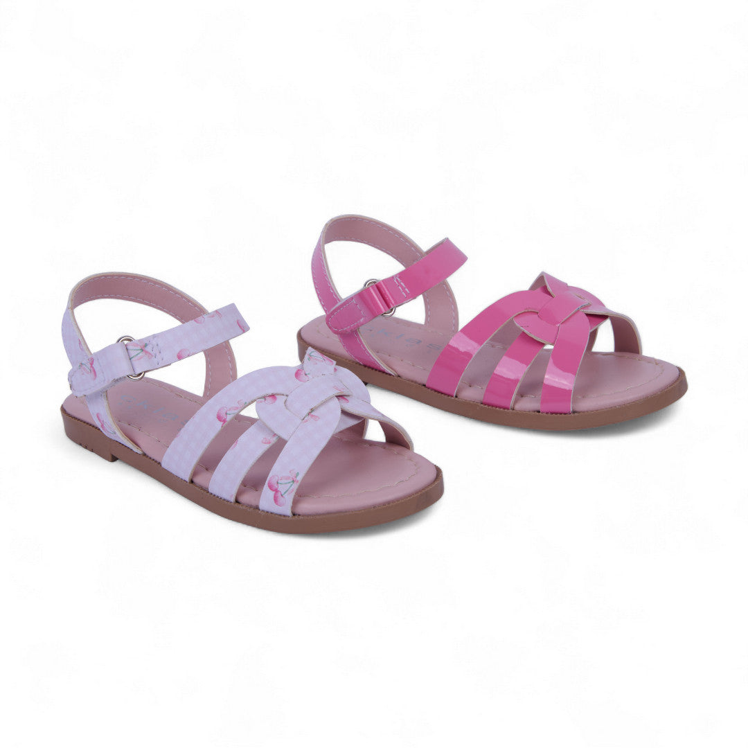 Dúo de sandalias de piso en rosa y multicolor con látigos trenzados y pulseras ajustables. Ligeras, cómodas y perfectas para looks frescos y versátiles.