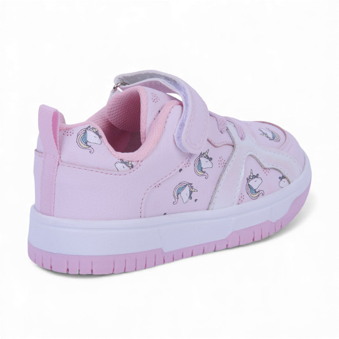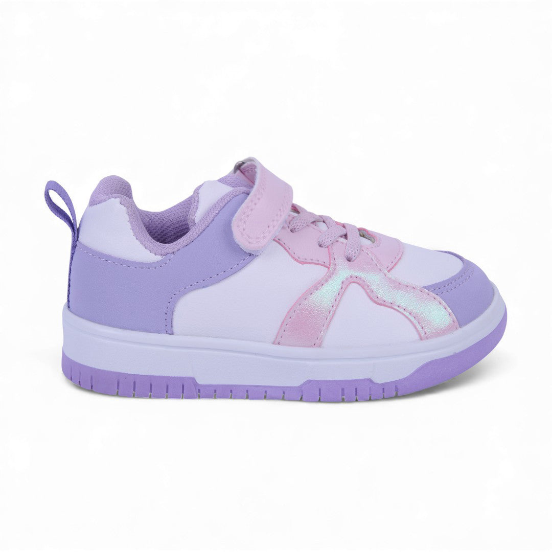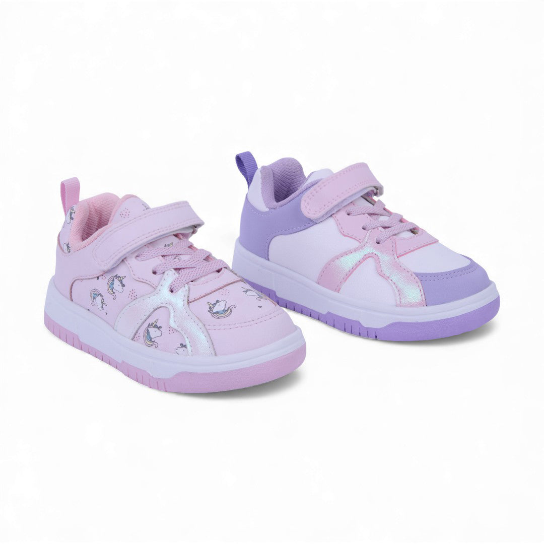Dúo de tenis casual rosa y lila con detalles en contraste; modelo rosa estampado con cintas elásticas y velcro, modelo lila con diseño moderno y plantilla textil. Estilo fresco, juvenil y cómodo.