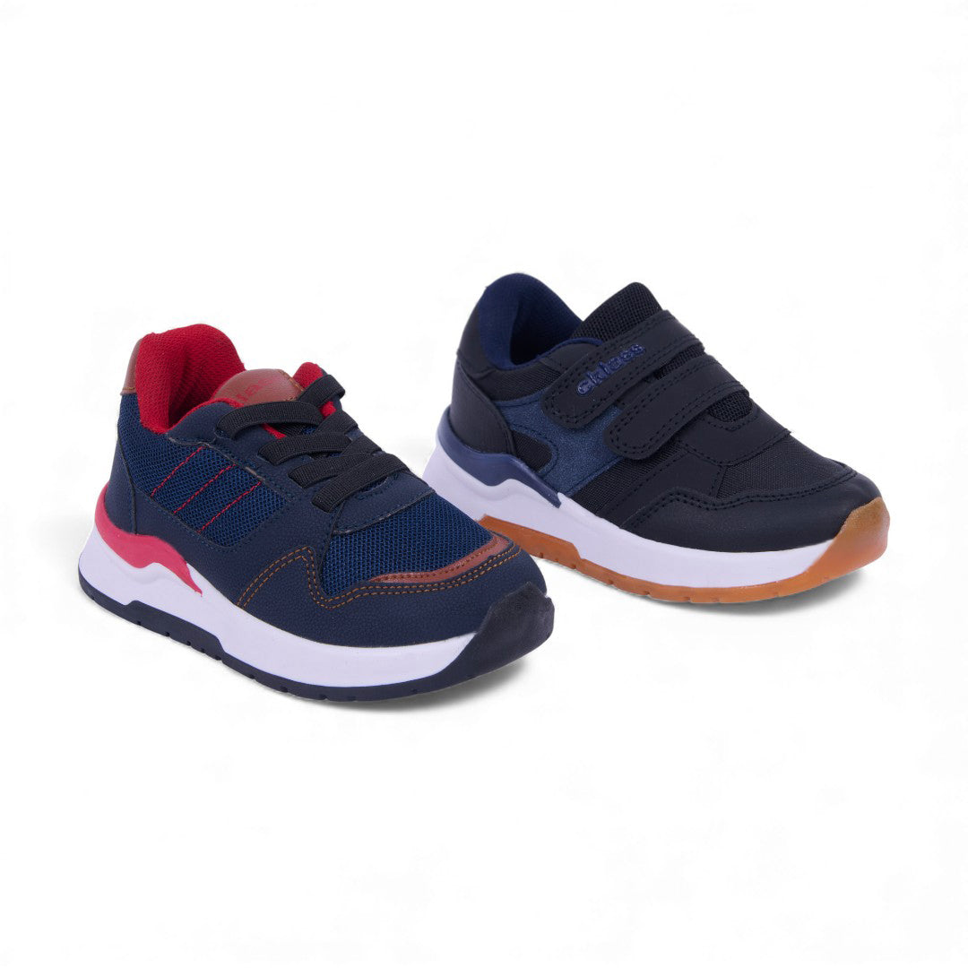Dúo de tenis casual multicolor y negro con detalles en malla, cintas y modelo negro con contactel; combinación cómoda, moderna y versátil con plantilla textil.
