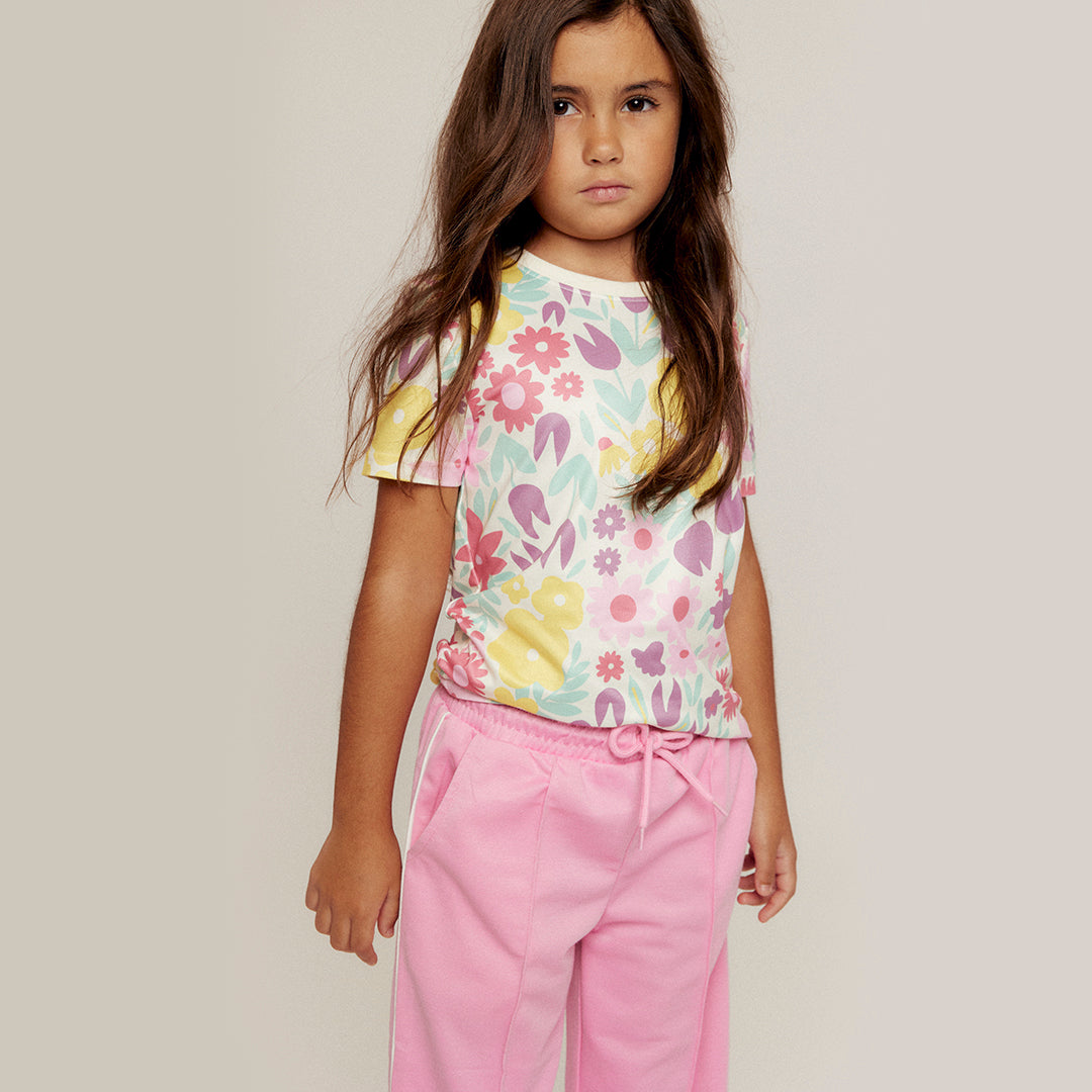 Playera multicolor de tacto suave con cuello redondo y manga corta, estampado floral vibrante y corte cómodo ideal para uso diario.