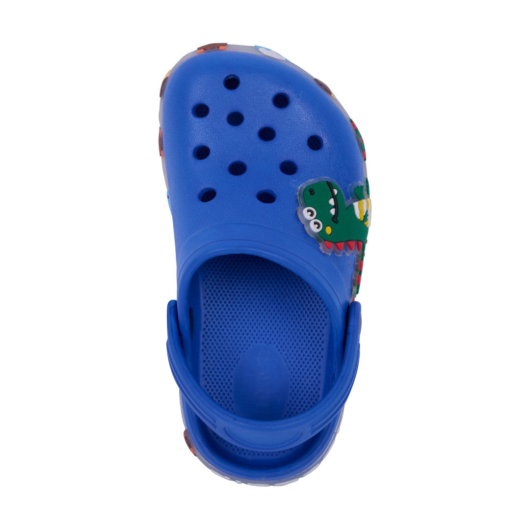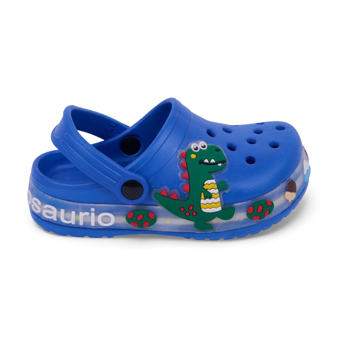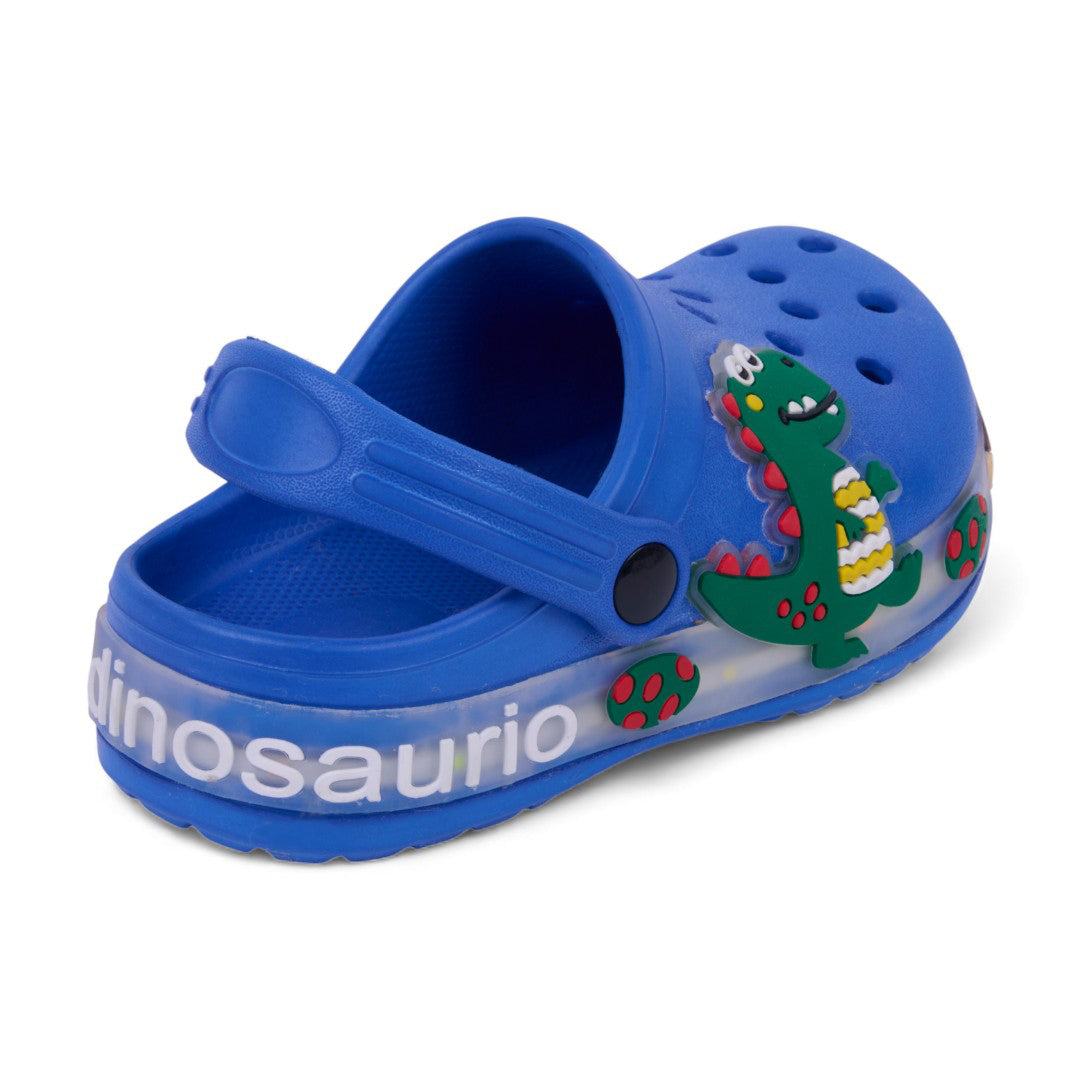 Sandalia azul con adorno de dinosaurio, suela con luces y pulsera; divertida, cómoda y perfecta para niños.