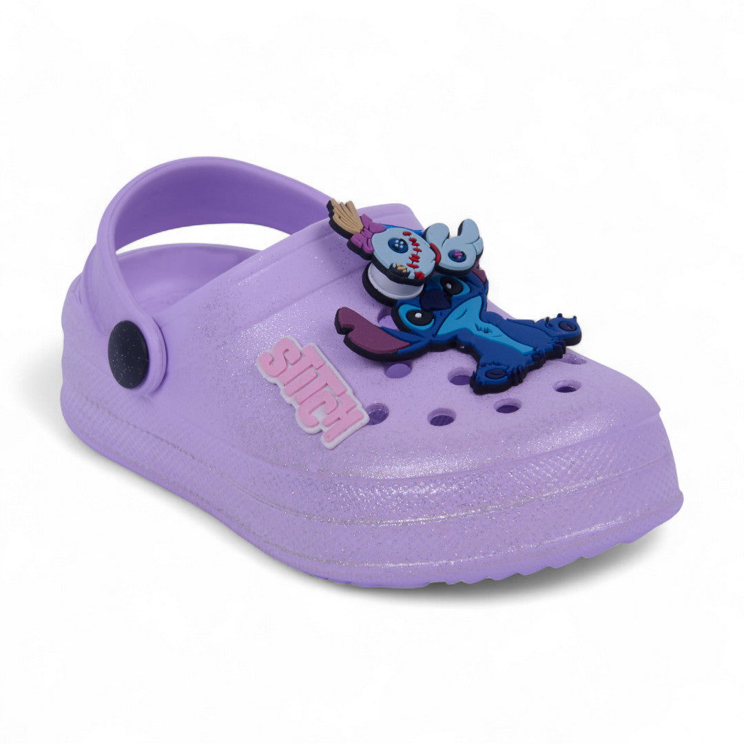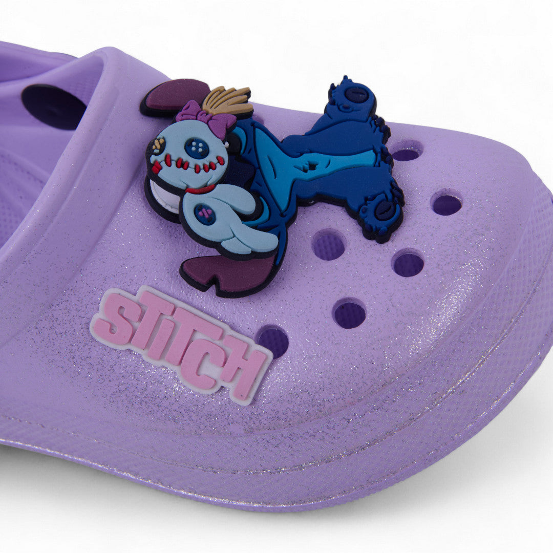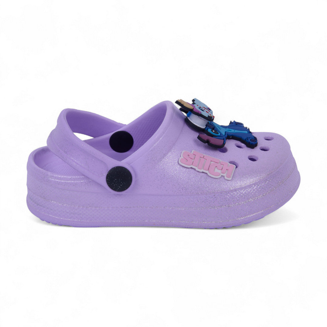Sandalia casual lila con glitter, detalle de Stitch en el empeine y pulsera ajustable. Ligera, cómoda y perfecta para looks infantiles tiernos y divertidos.
