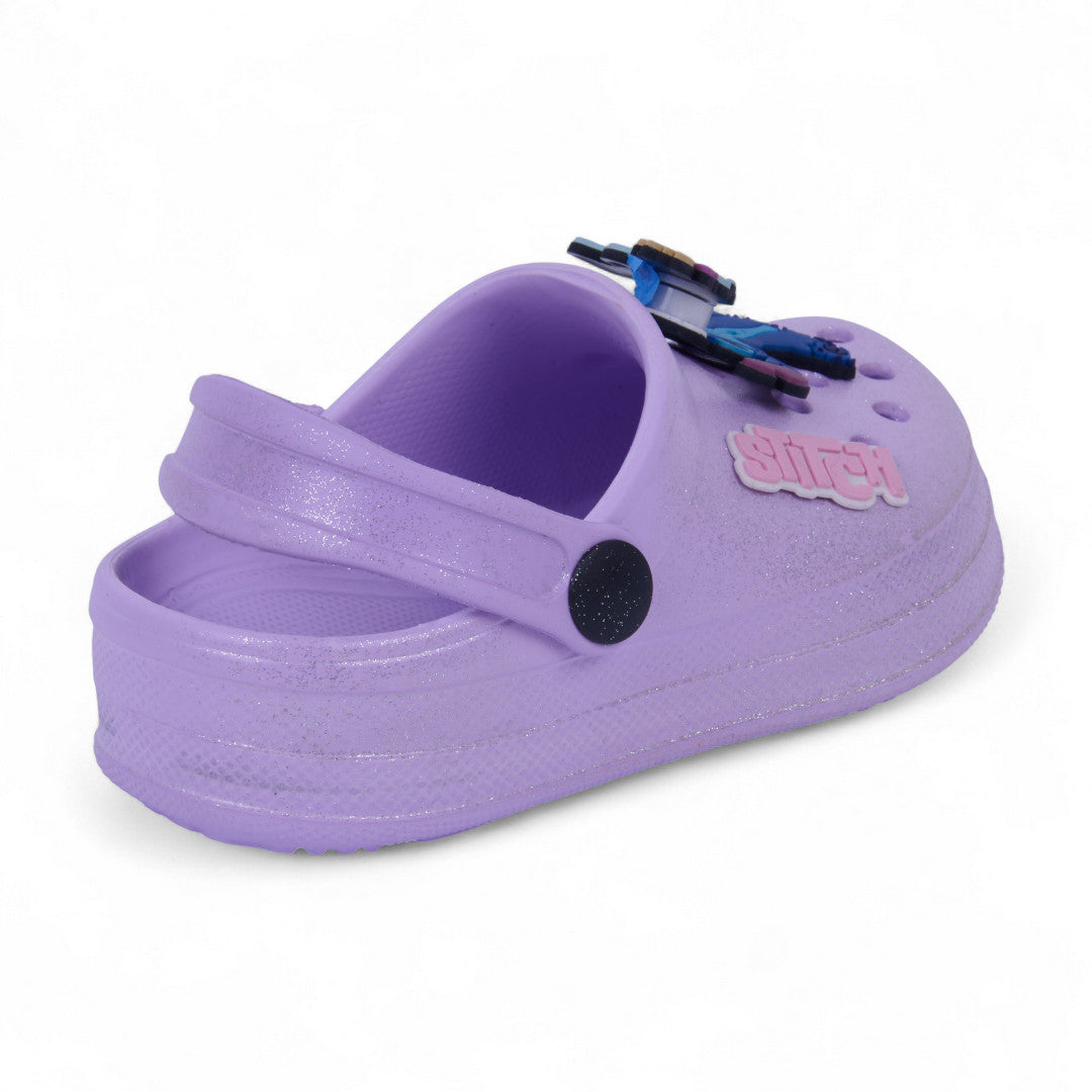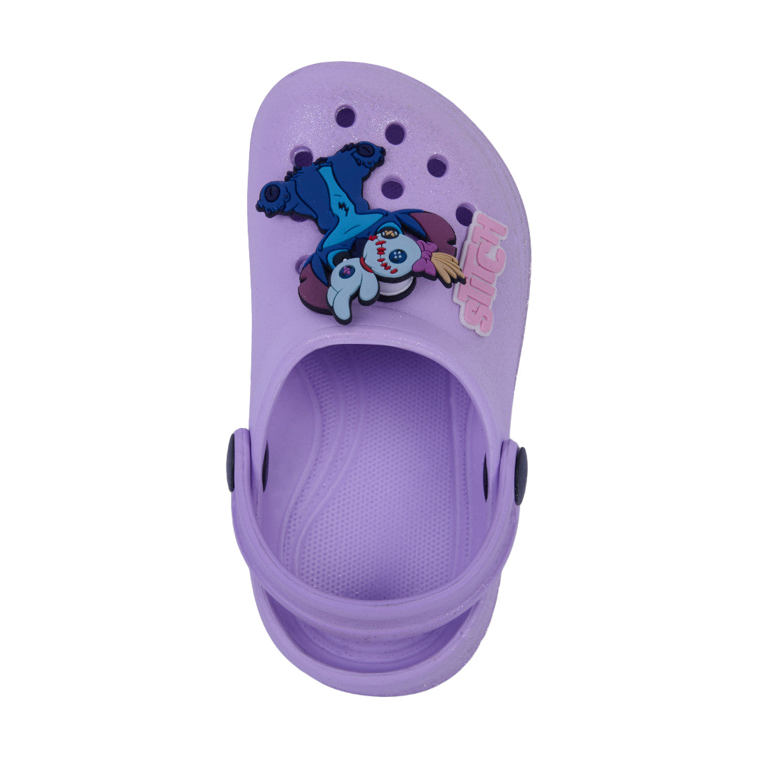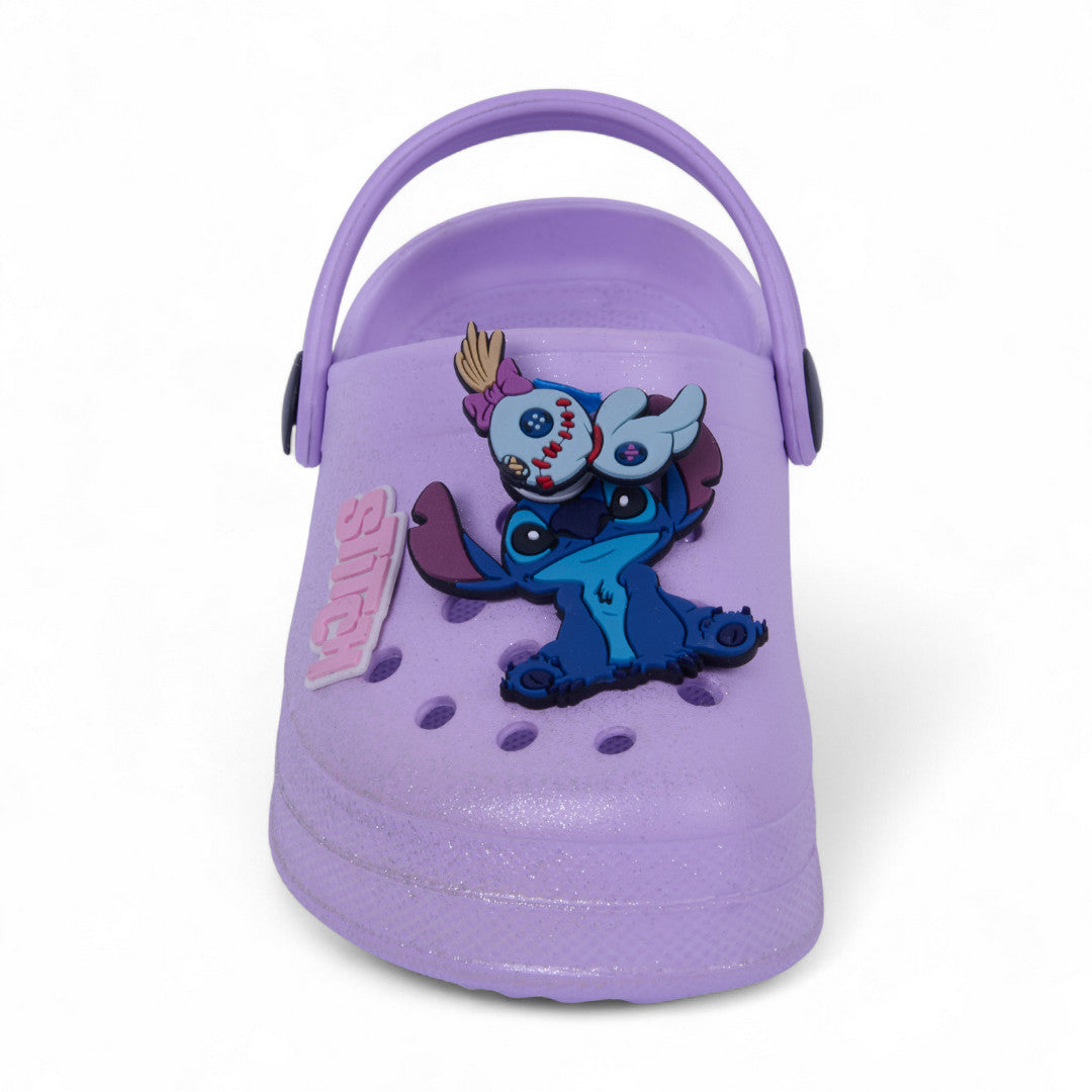 Sandalia casual lila con glitter, detalle de Stitch en el empeine y pulsera ajustable. Ligera, cómoda y perfecta para looks infantiles tiernos y divertidos.