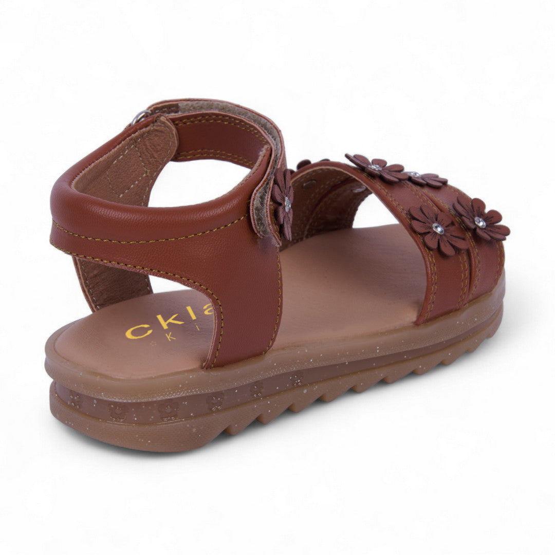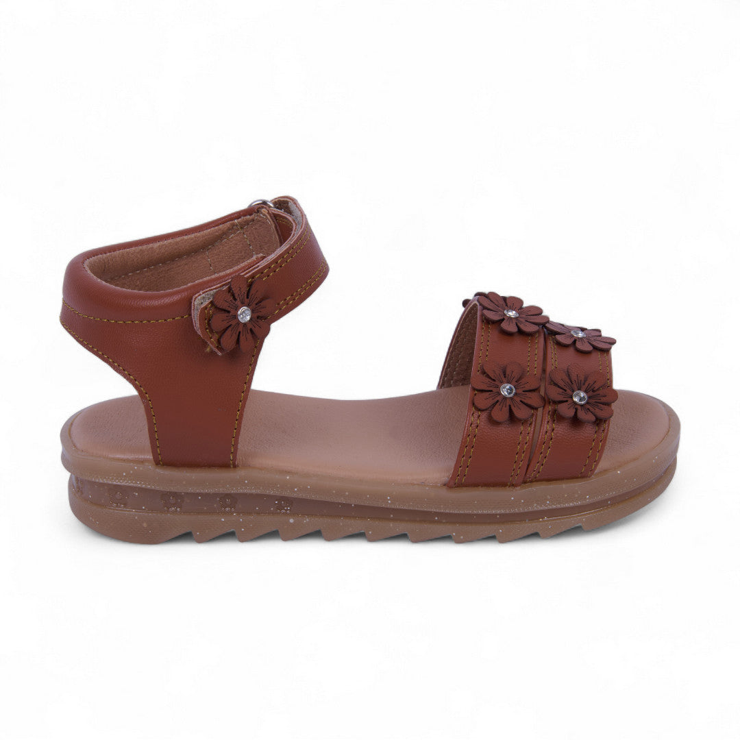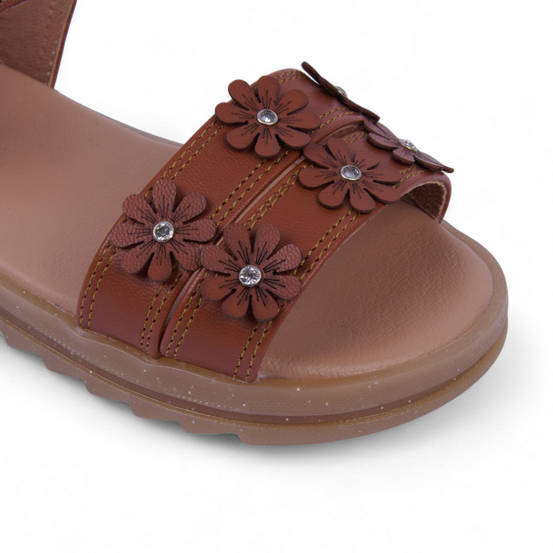 Sandalia de piso color miel con aplicaciones decorativas y pulsera con velcro; ligera, cómoda y perfecta para uso diario o looks casuales.