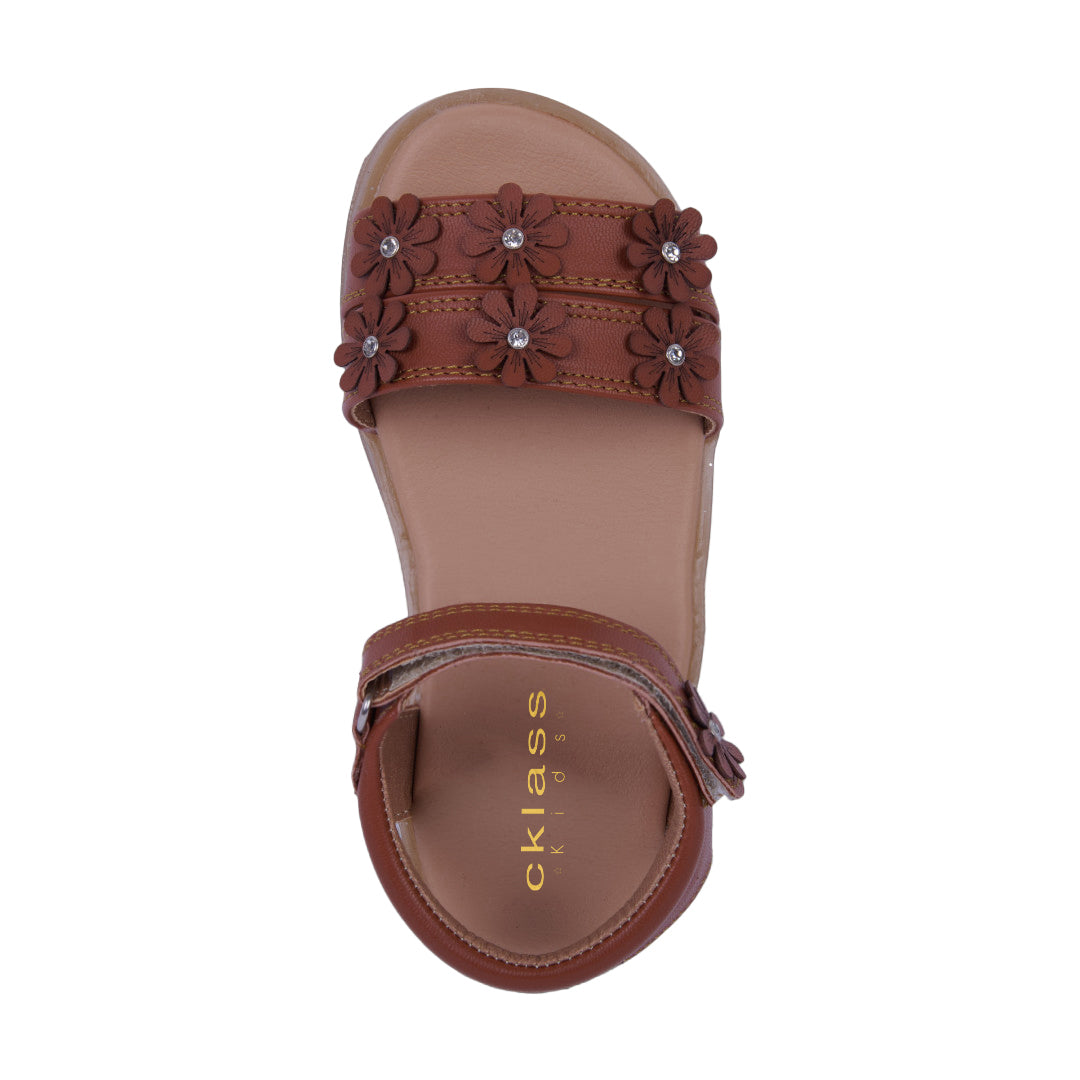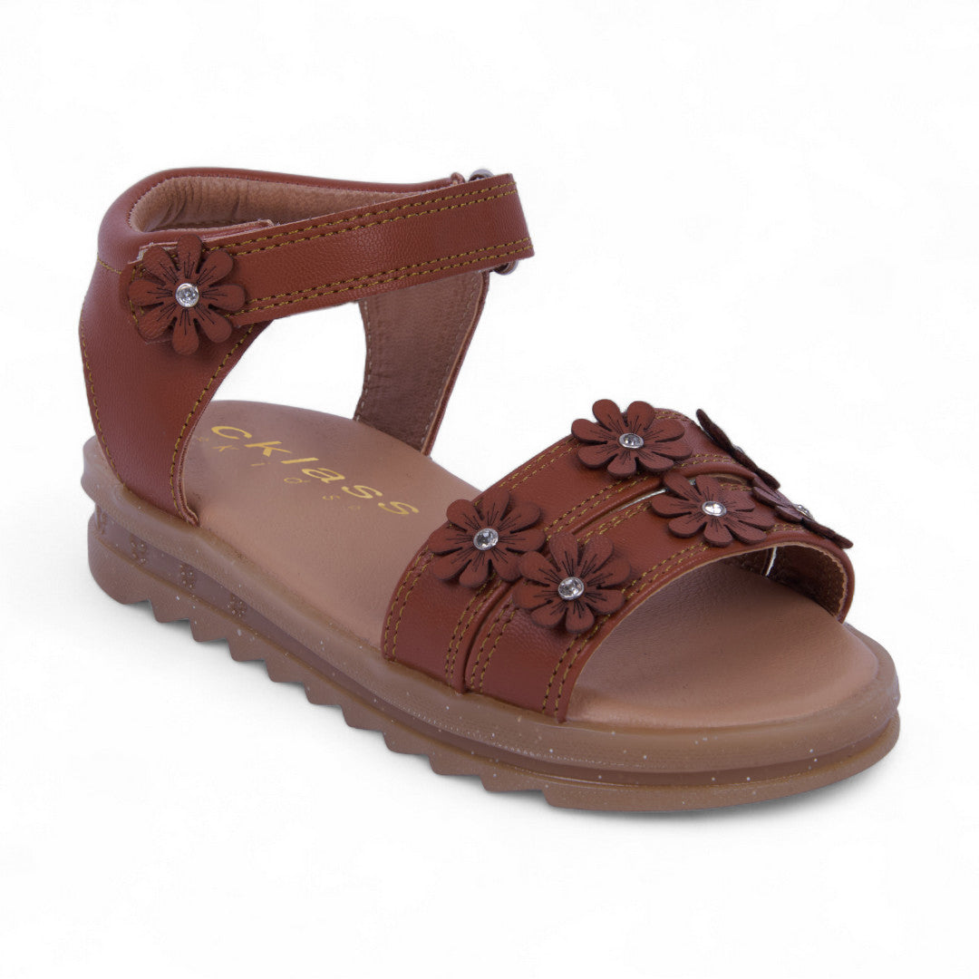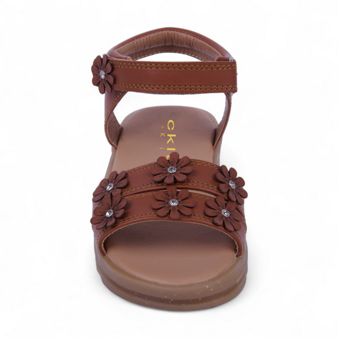Sandalia de piso color miel con aplicaciones decorativas y pulsera con velcro; ligera, cómoda y perfecta para uso diario o looks casuales.