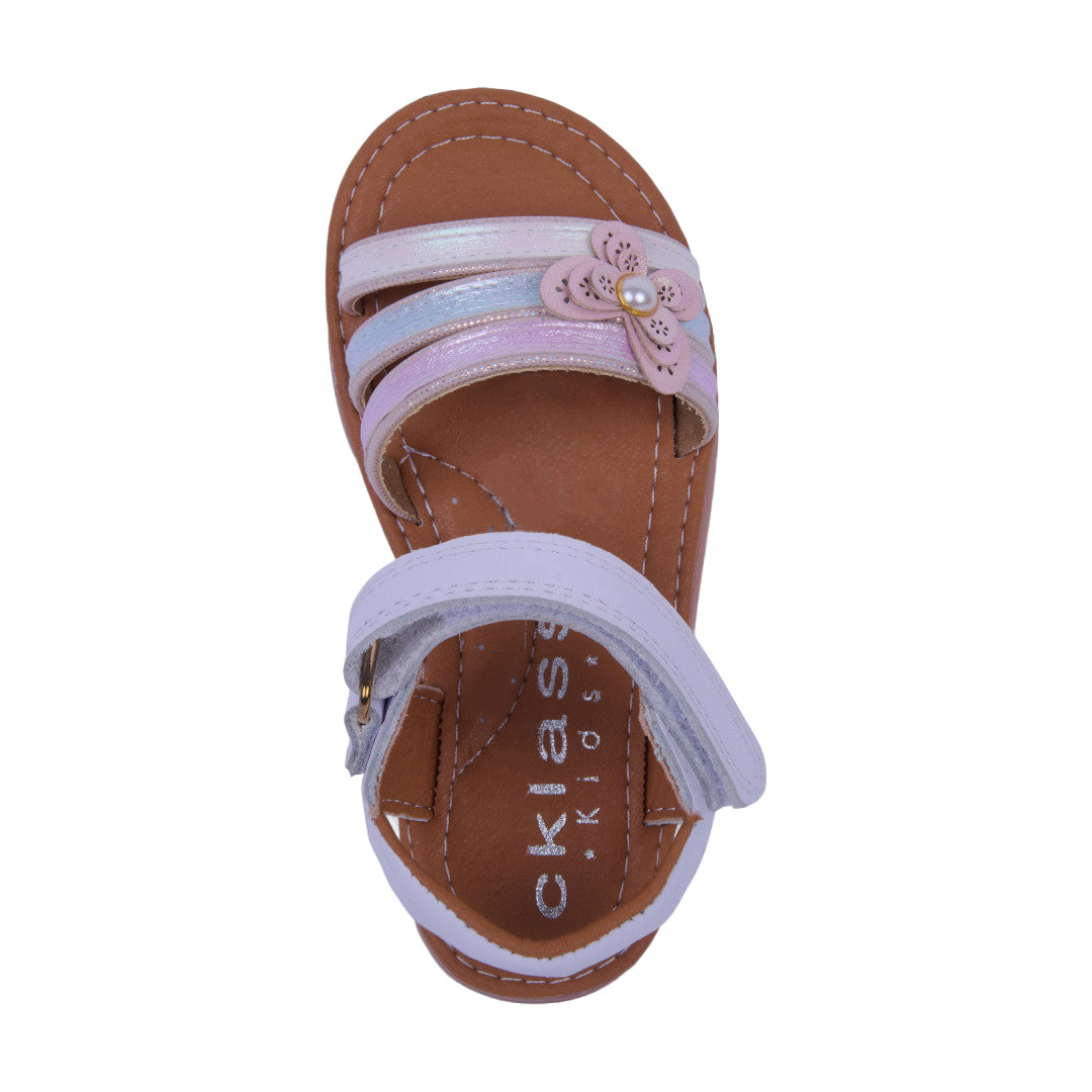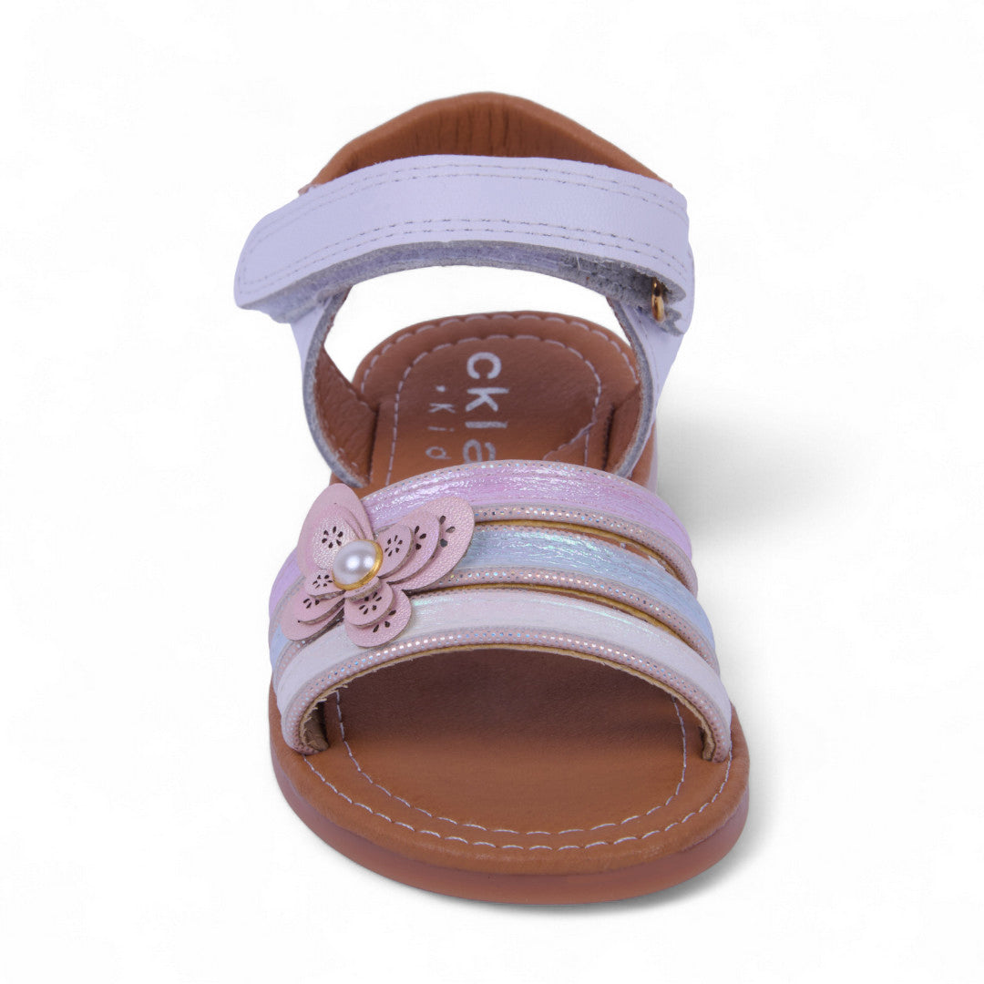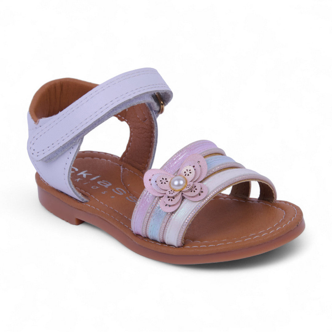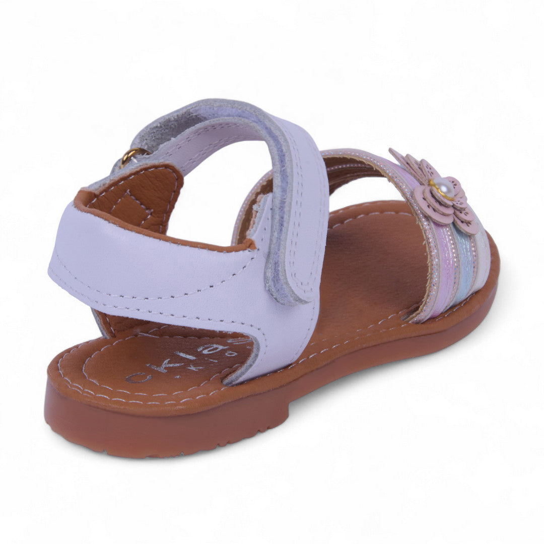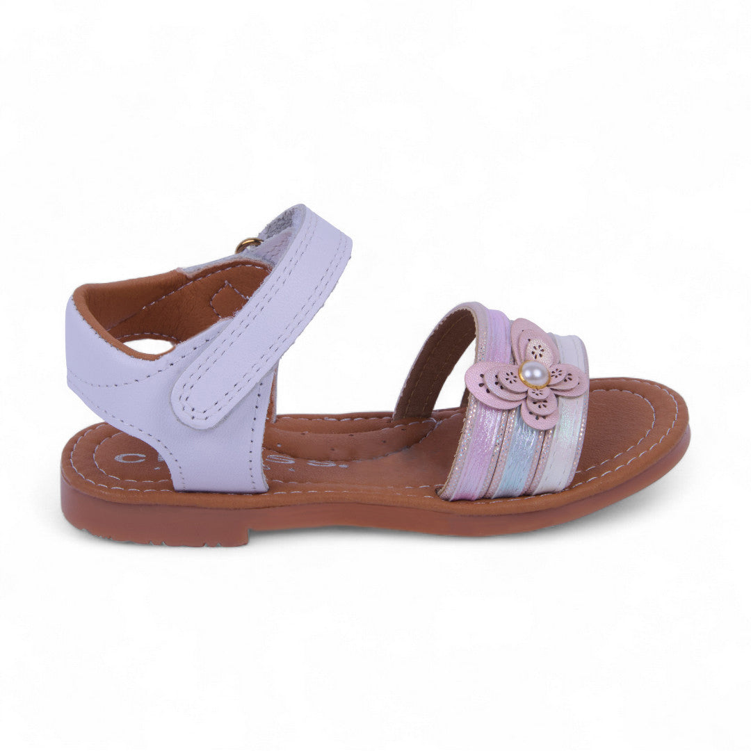 Sandalia de piso multicolor con aplicaciones decorativas y cierre con contactel. Suave, flexible y perfecta para looks frescos, divertidos y llenos de color.