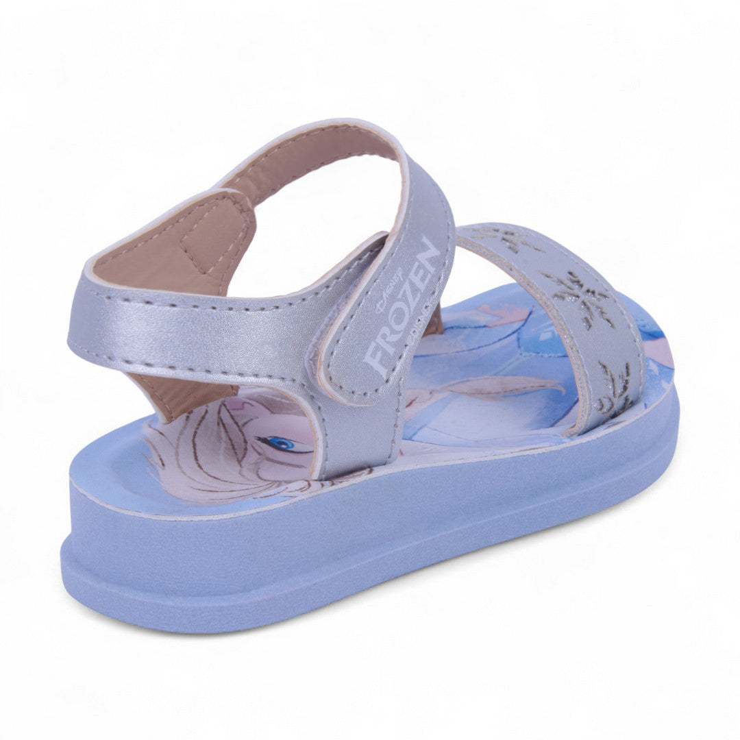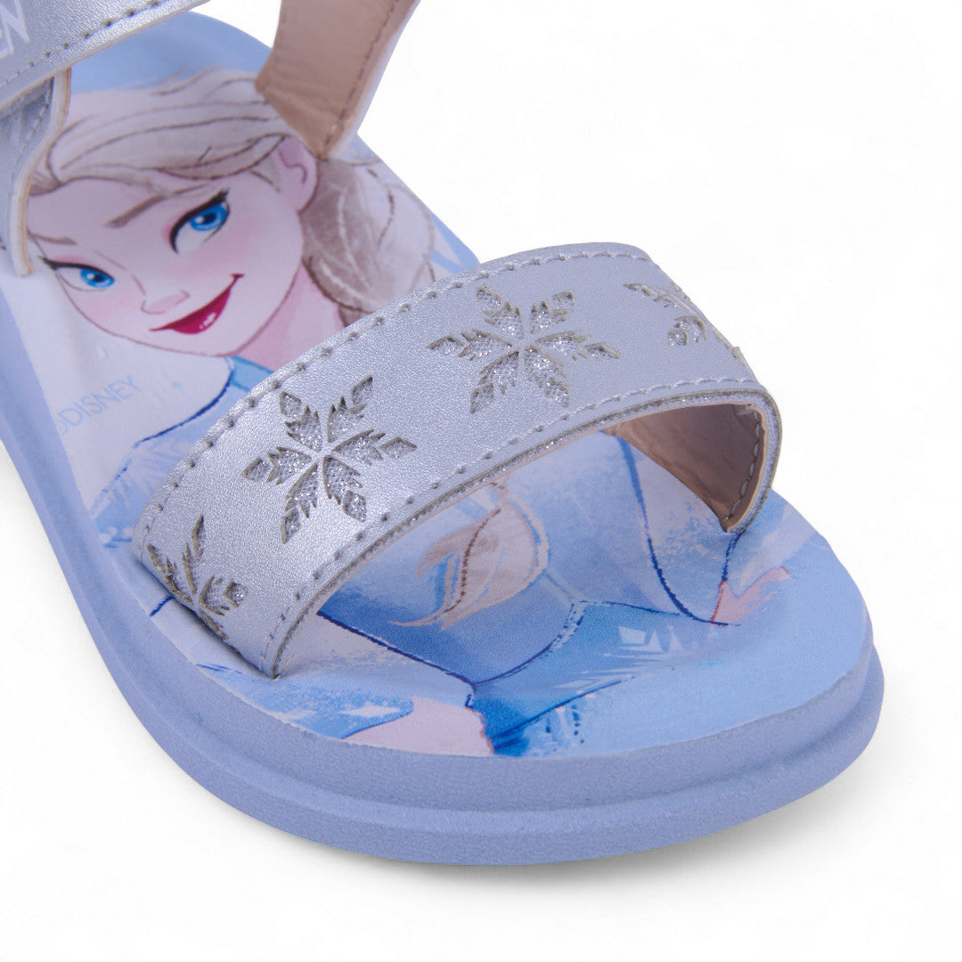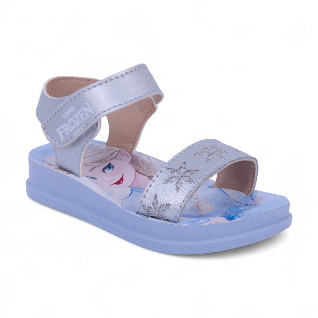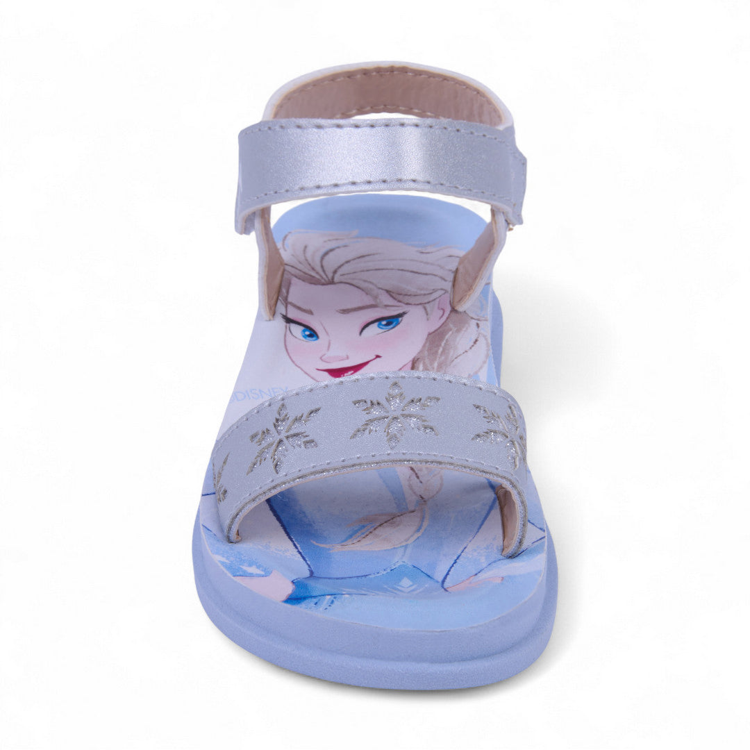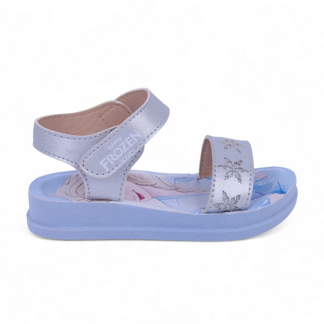 Sandalia de piso color plata inspirada en Elsa, con suela impresa y látigos con delicados grabados. Cuenta con pulsera ajustable con cierre de contactel para un calce cómodo y seguro. Fabricada en material sintético con plantilla suave para mayor confort. Ideal para niñas que aman la magia, el brillo y la comodidad en cada paso.