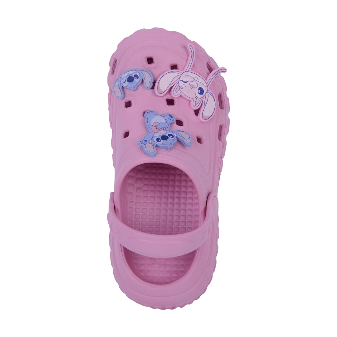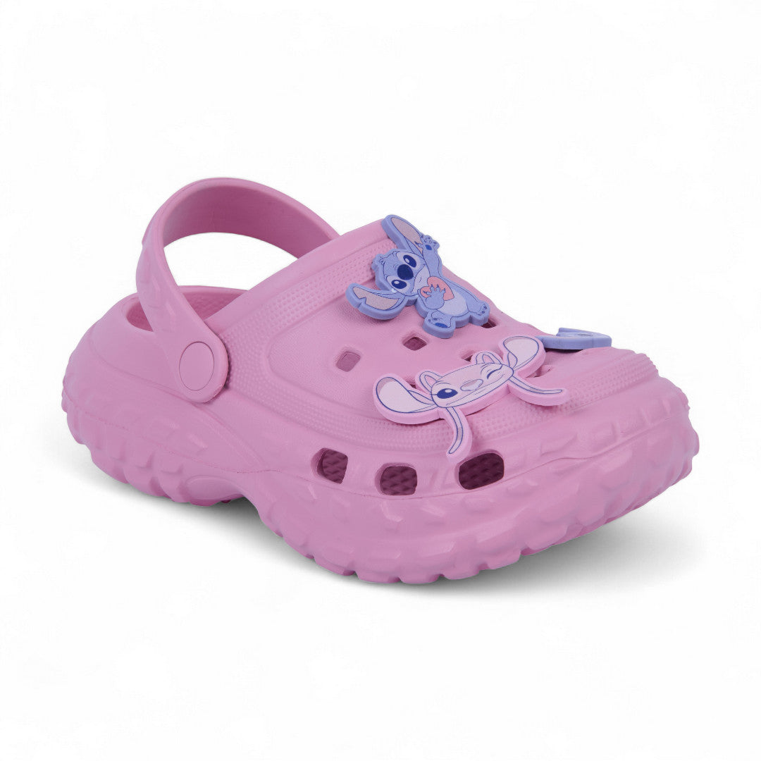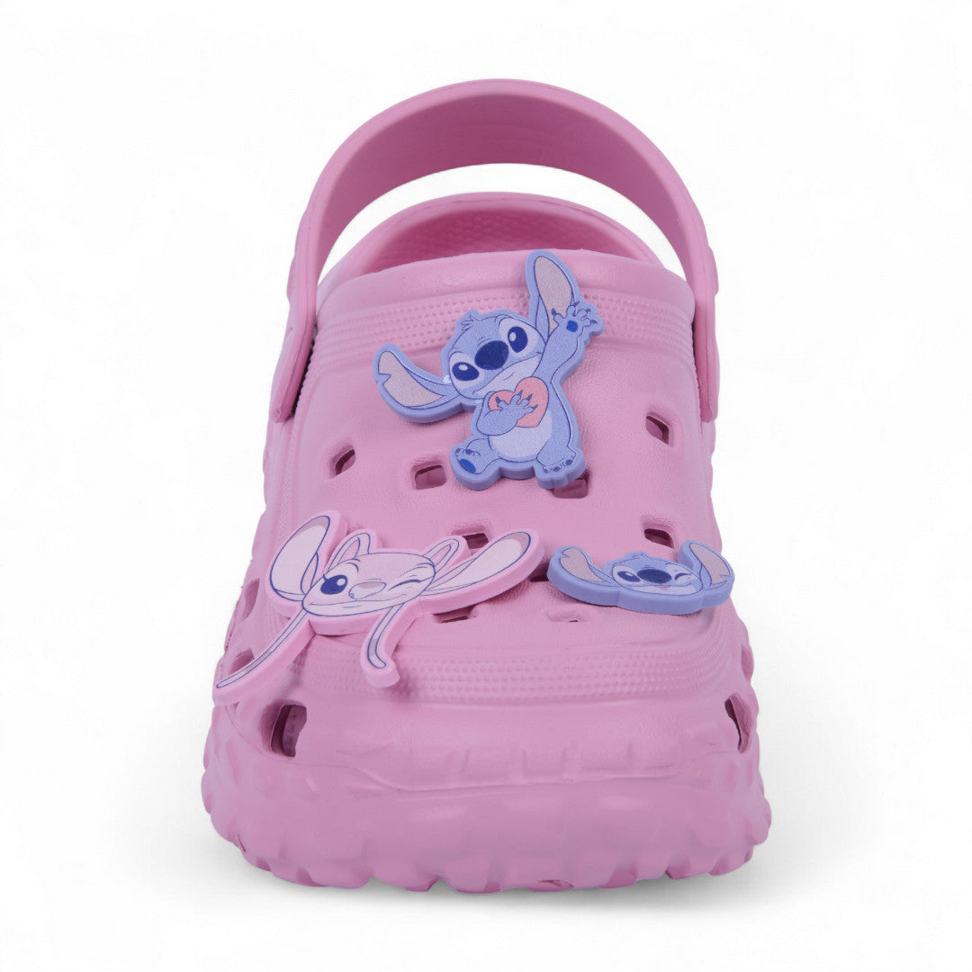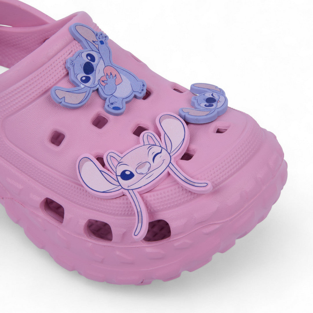 Sandalia de piso color rosa con divertidos charms inspirados en Stitch. Elaborada en material sintético con plantilla suave que brinda confort y ligereza. Su diseño tierno y moderno es ideal para niñas que aman los personajes animados y el estilo casual con un toque adorable. Perfecta para uso diario o looks relajados y divertidos.