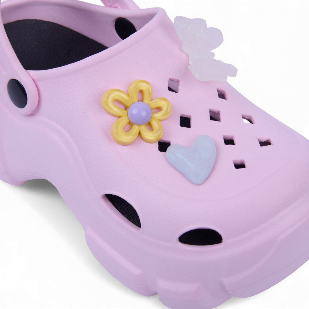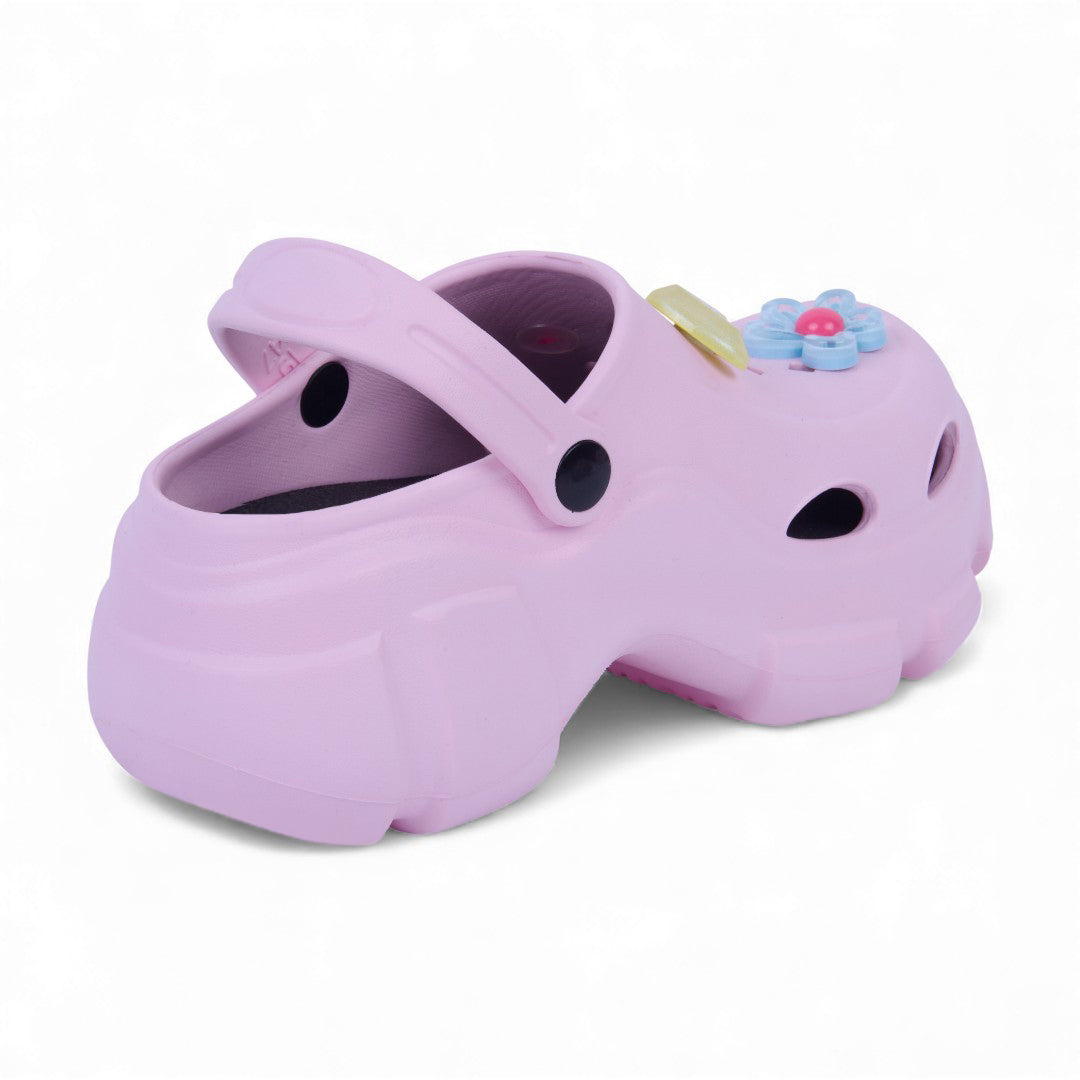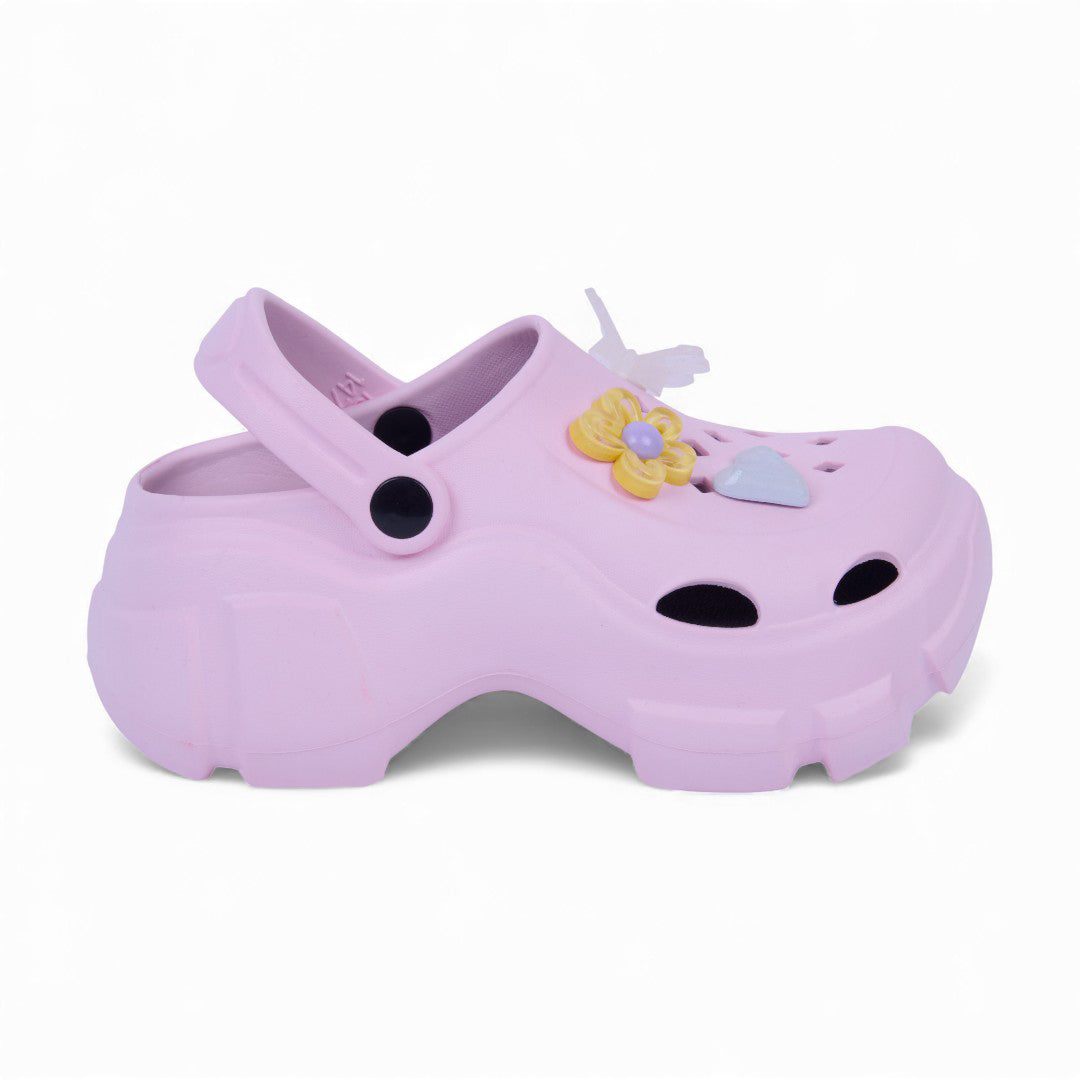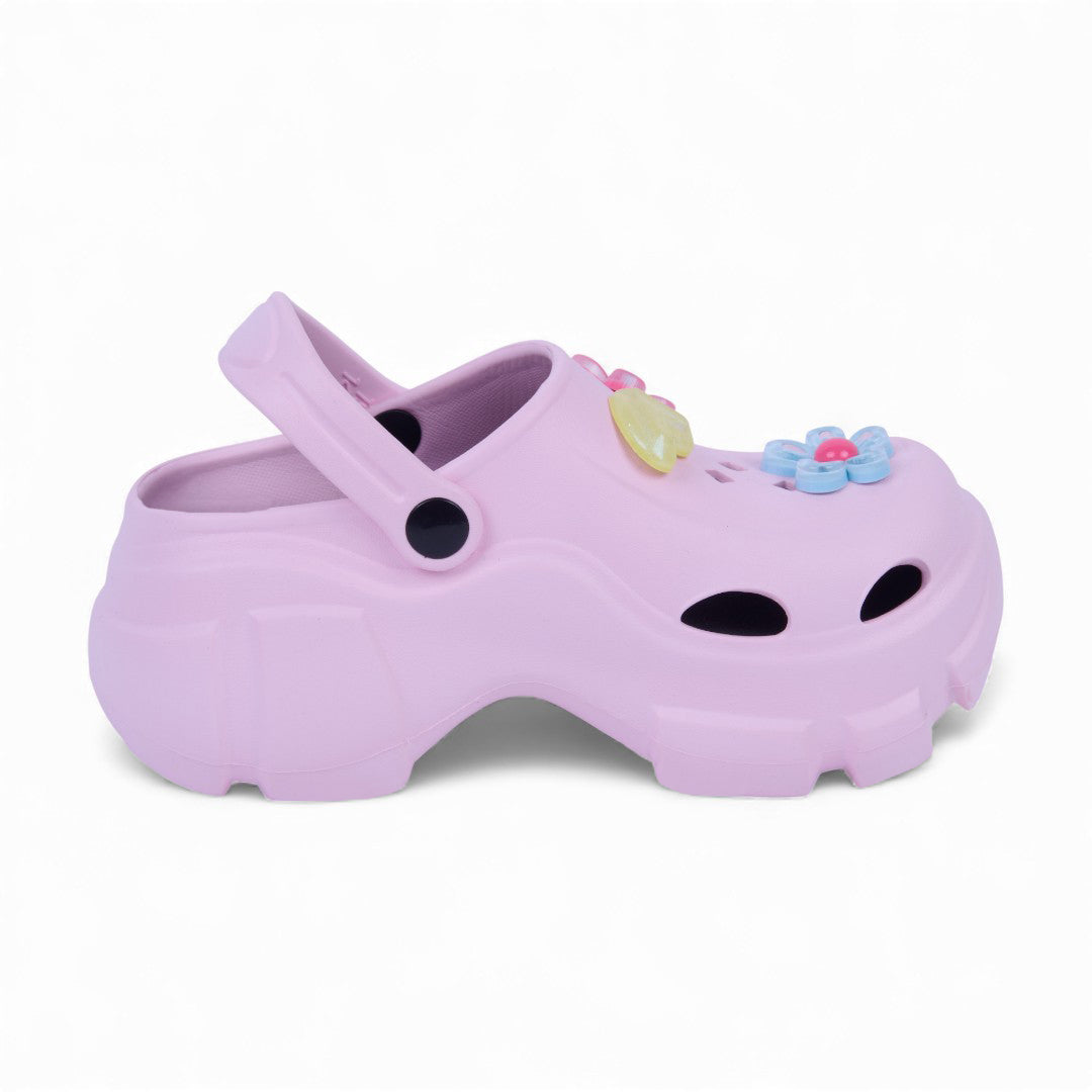 Sandalia chunky rosa de piso con flores decorativas y plantilla sintética; moderna, cómoda y ligera.