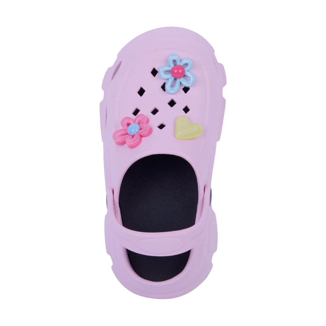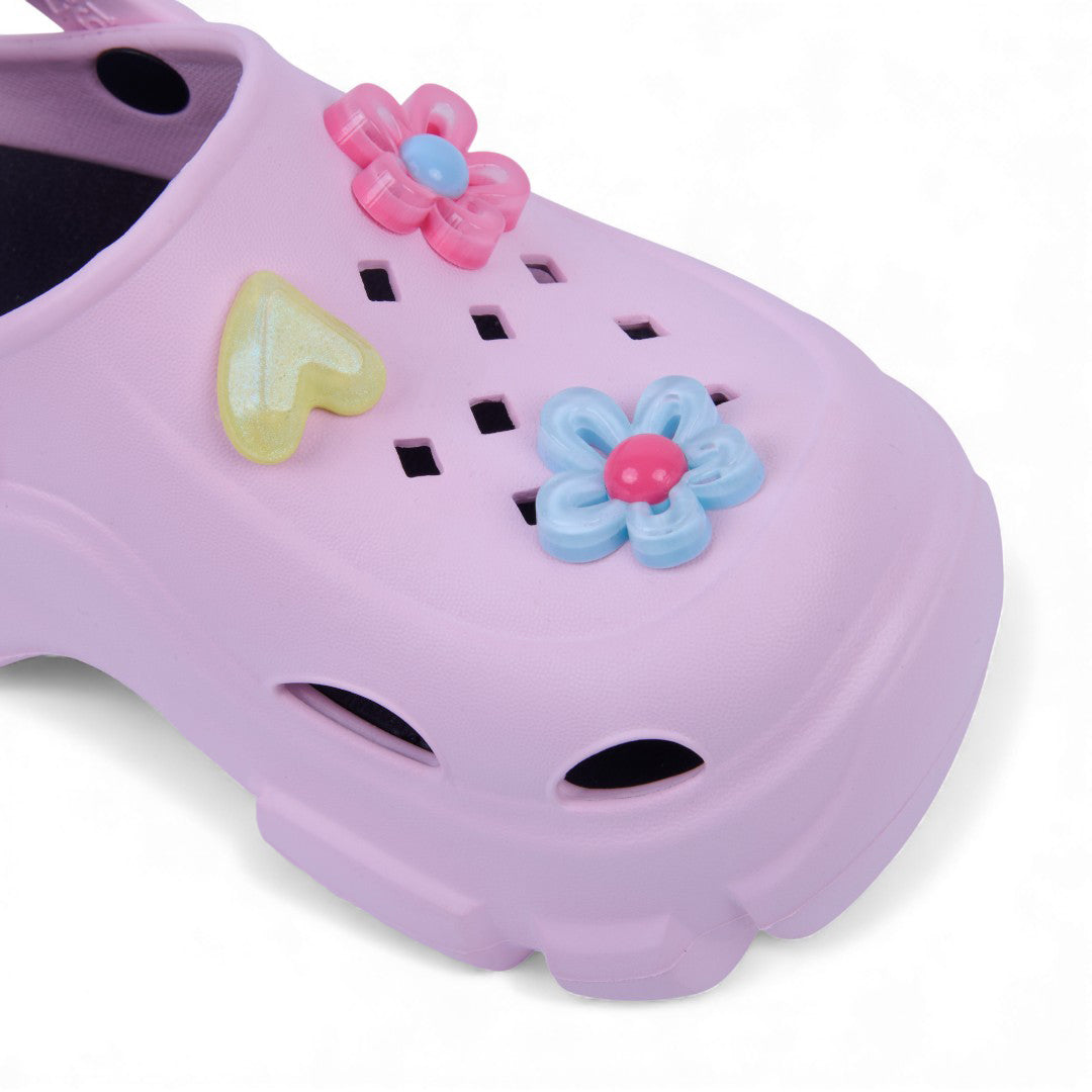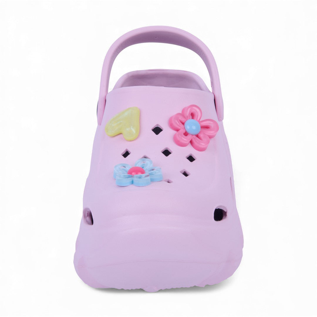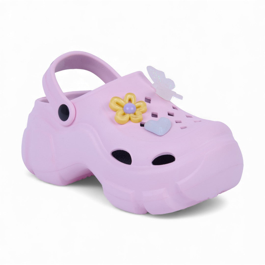 Sandalia chunky rosa de piso con flores decorativas y plantilla sintética; moderna, cómoda y ligera.