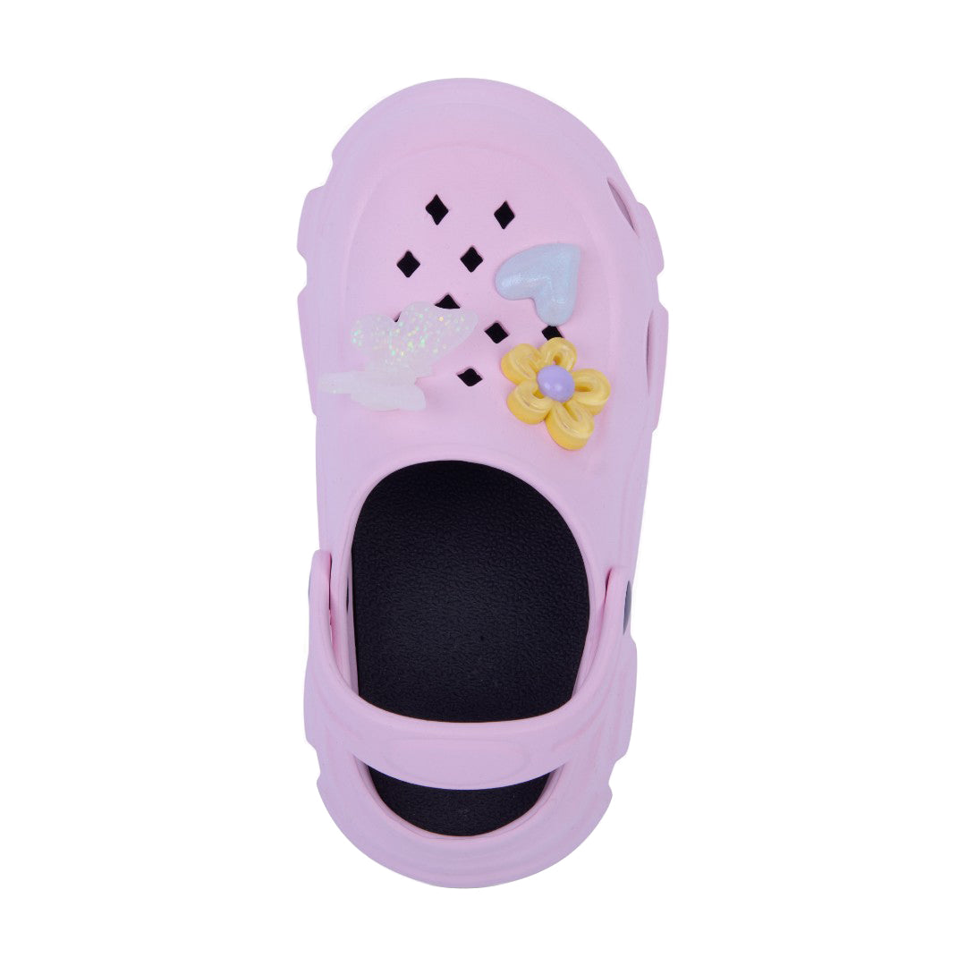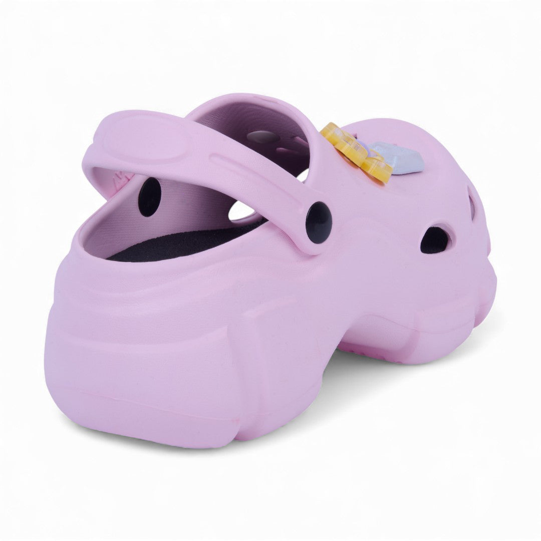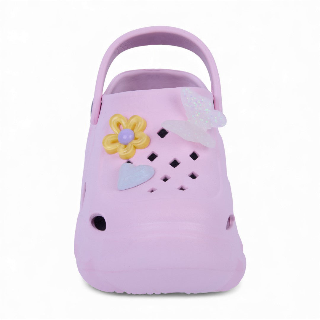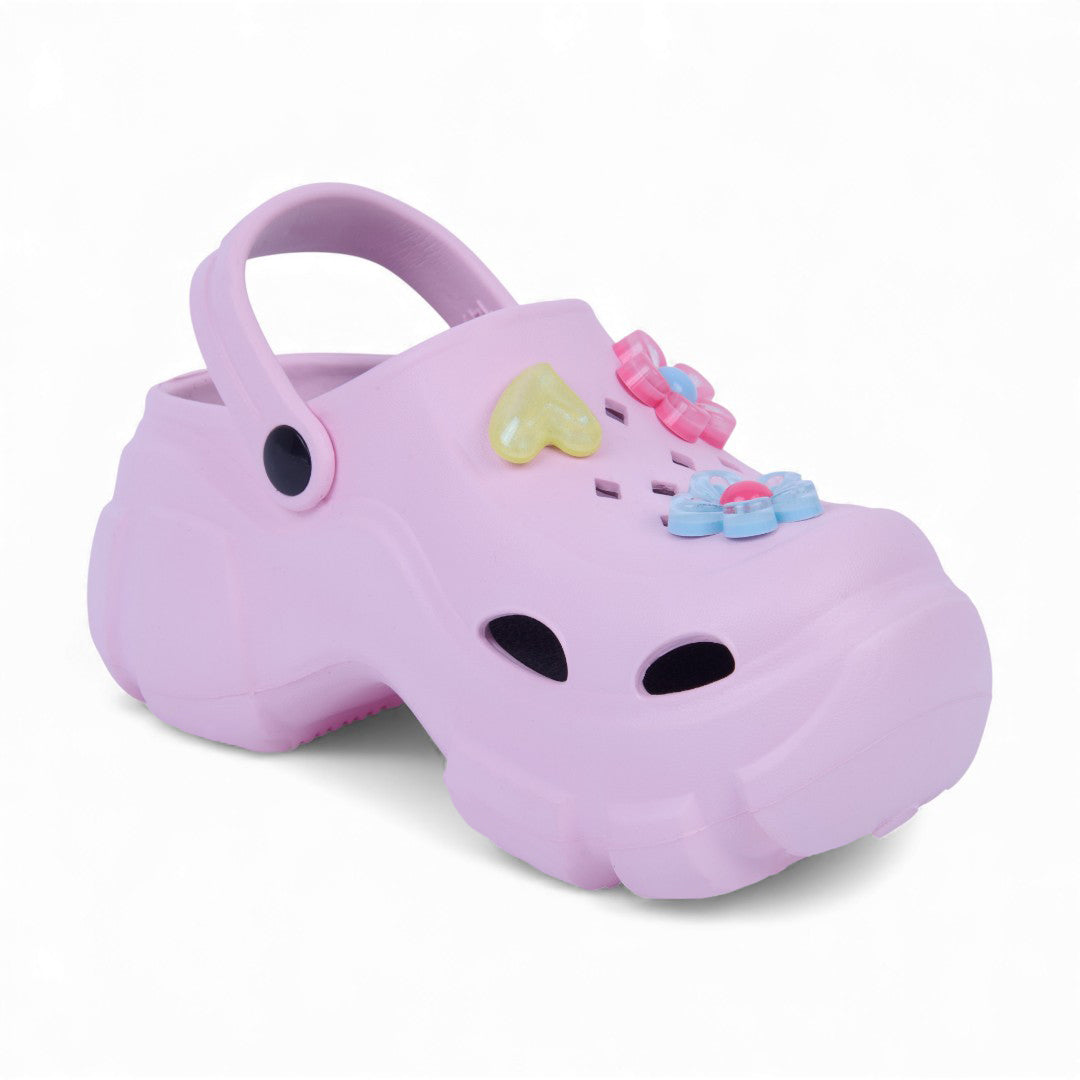Sandalia chunky rosa de piso con flores decorativas y plantilla sintética; moderna, cómoda y ligera.