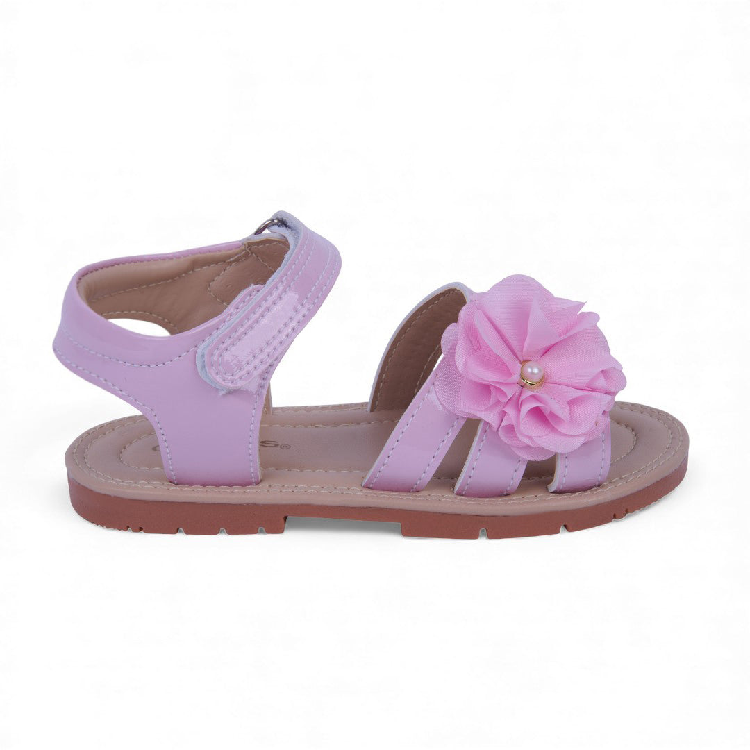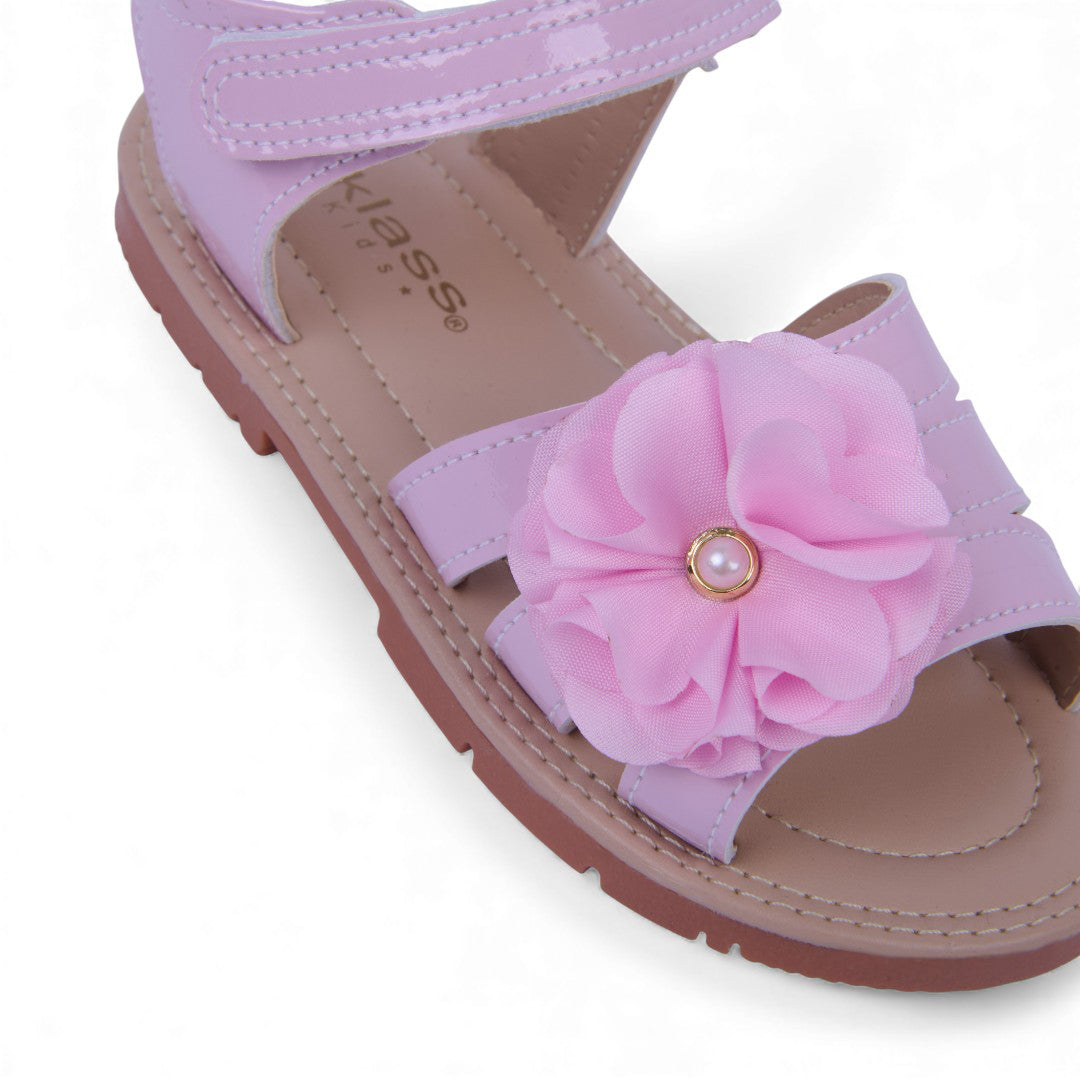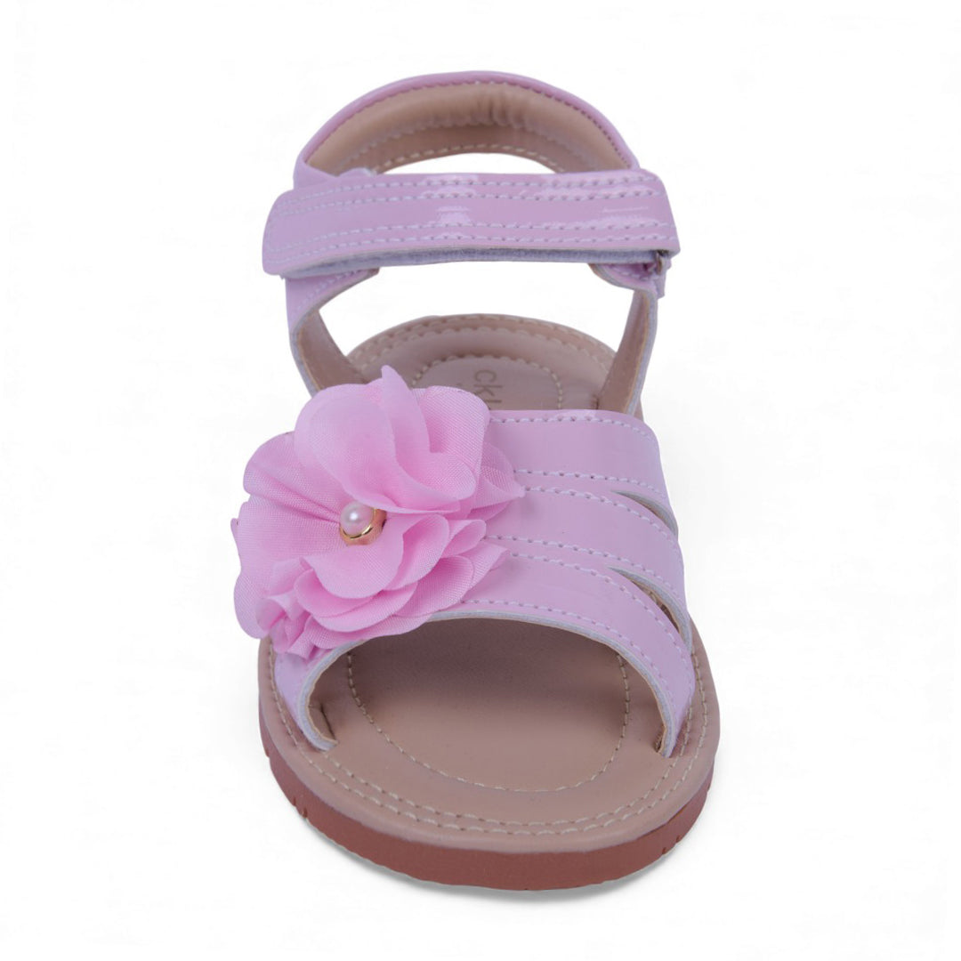 Sandalia de piso rosa con adorno floral y cierre con contactel; diseño femenino, cómodo y ligero con plantilla sintética.