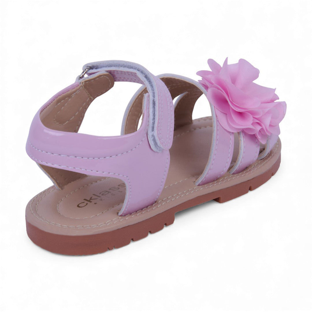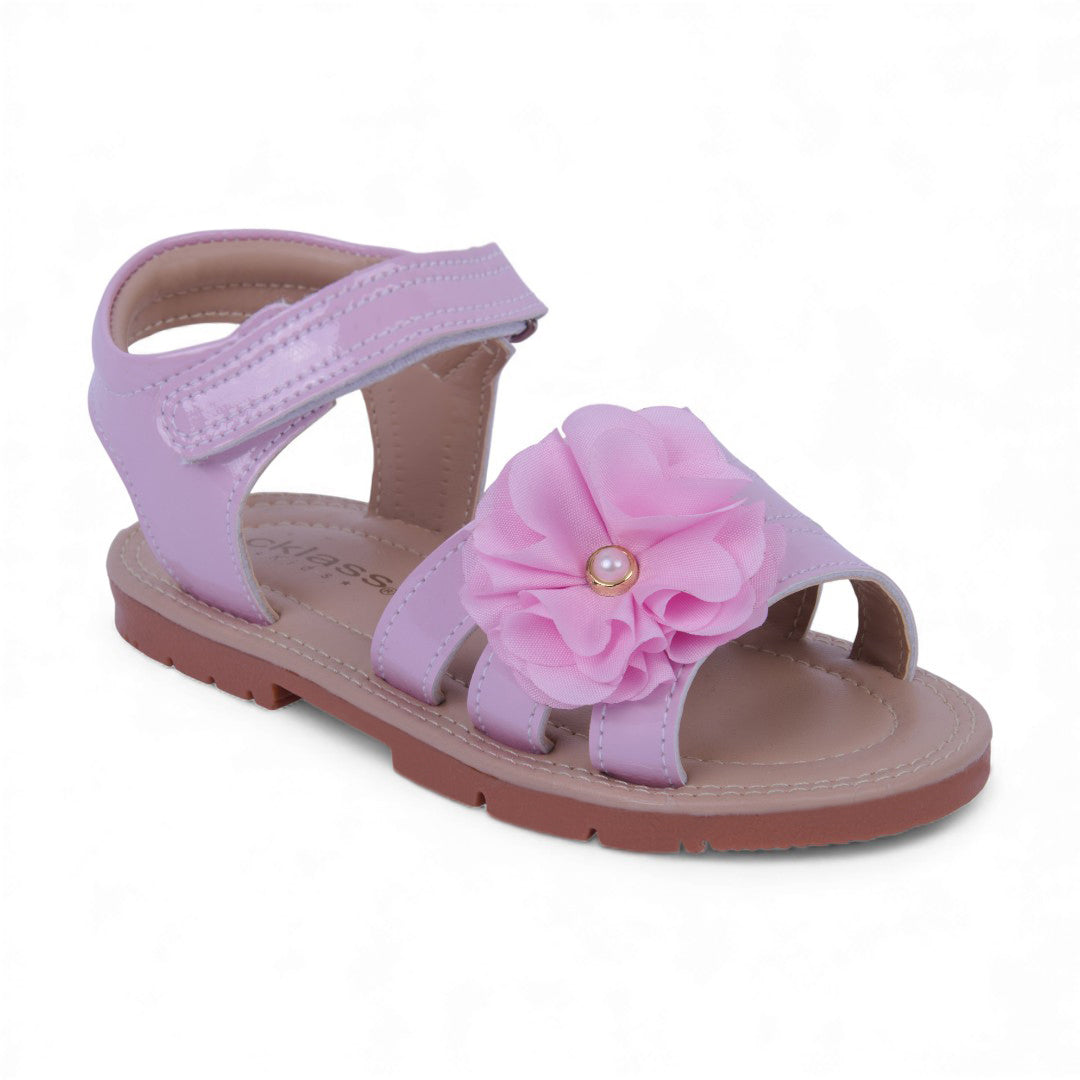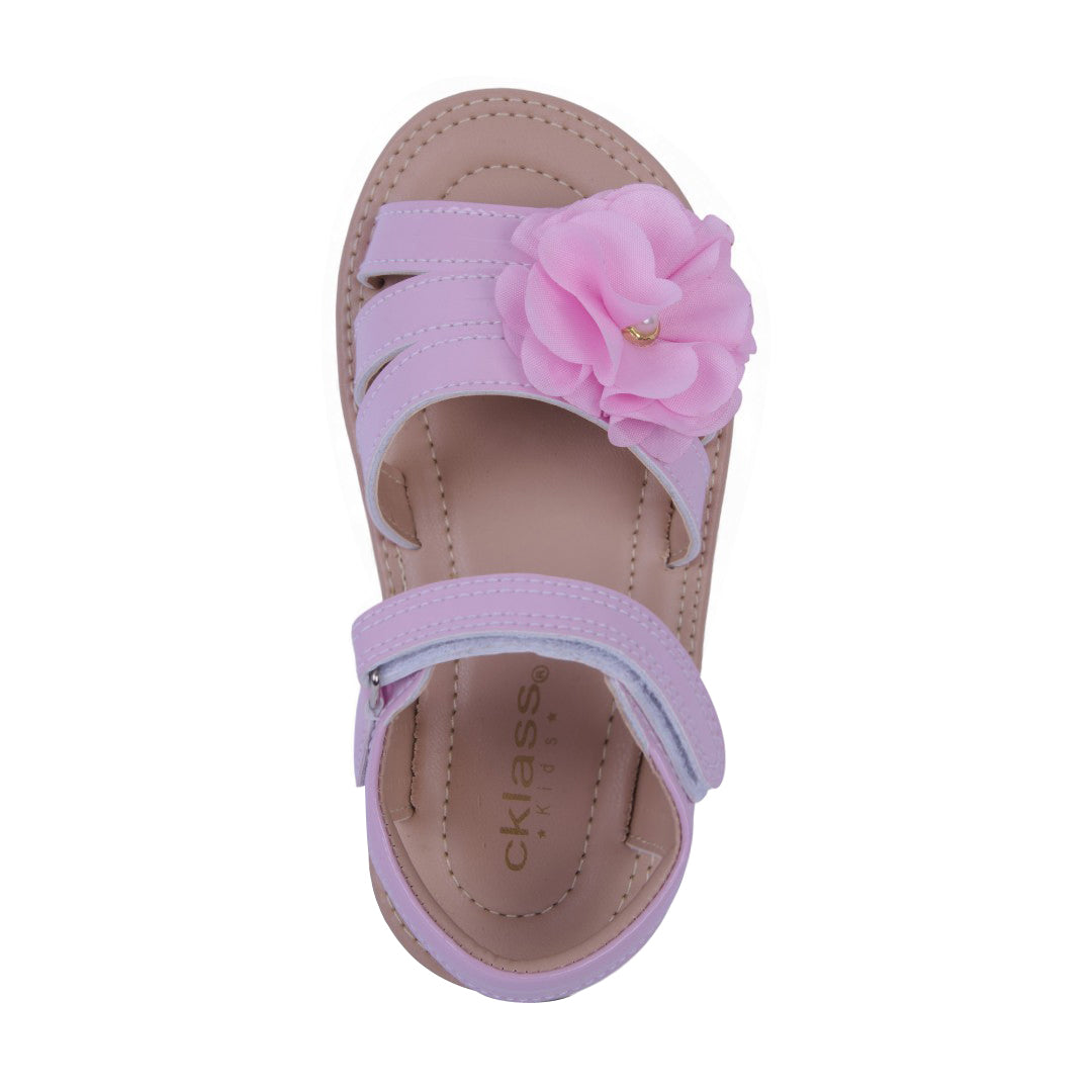 Sandalia de piso rosa con adorno floral y cierre con contactel; diseño femenino, cómodo y ligero con plantilla sintética.