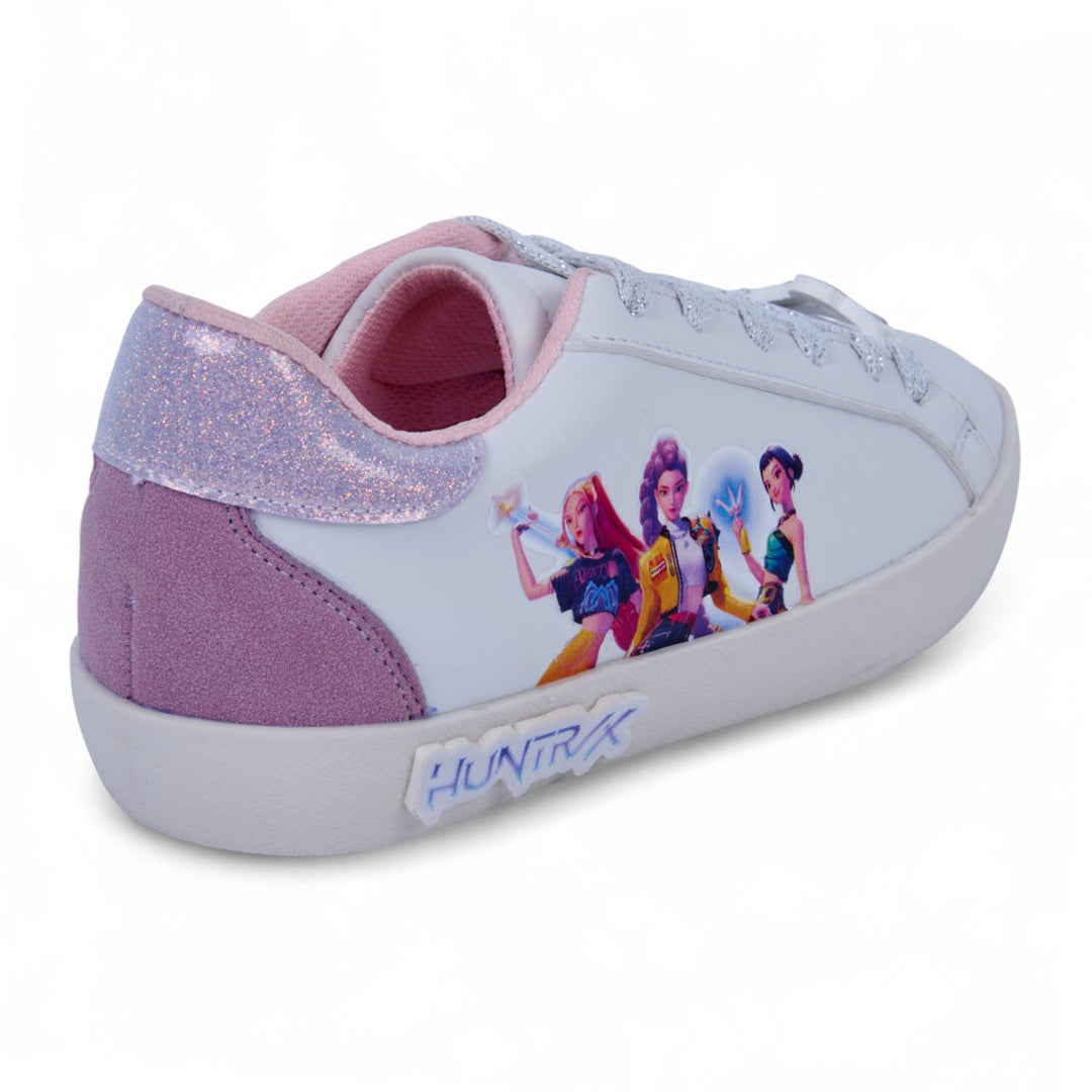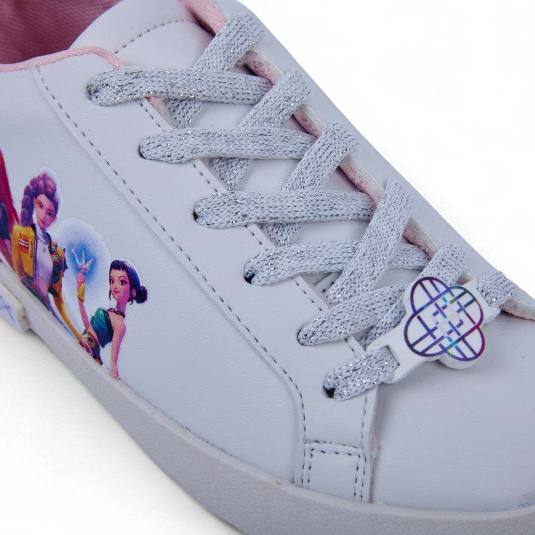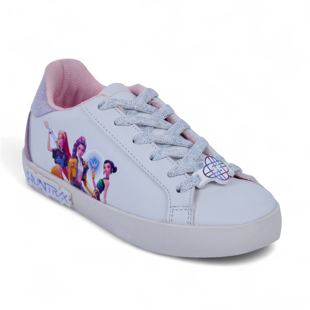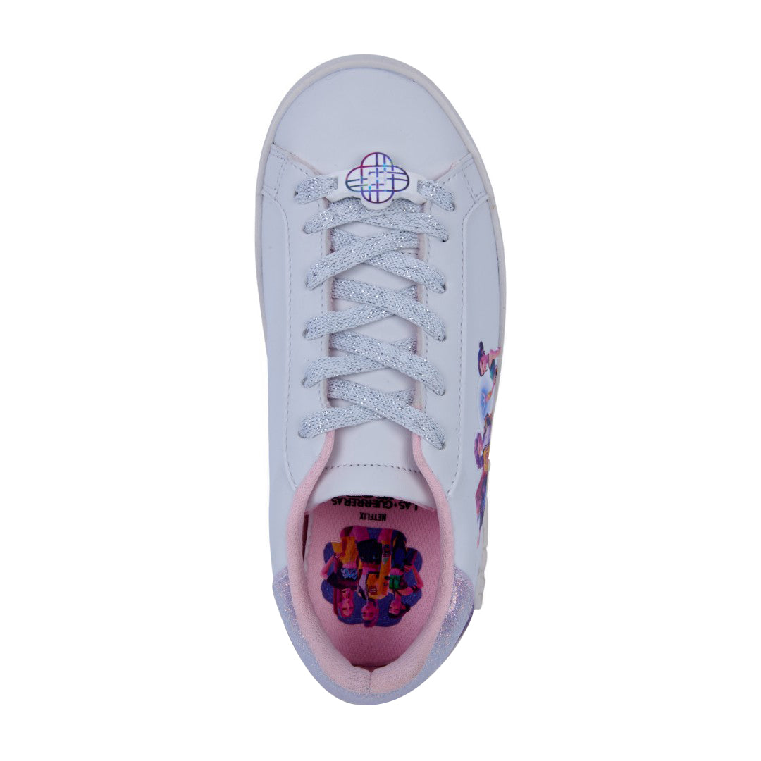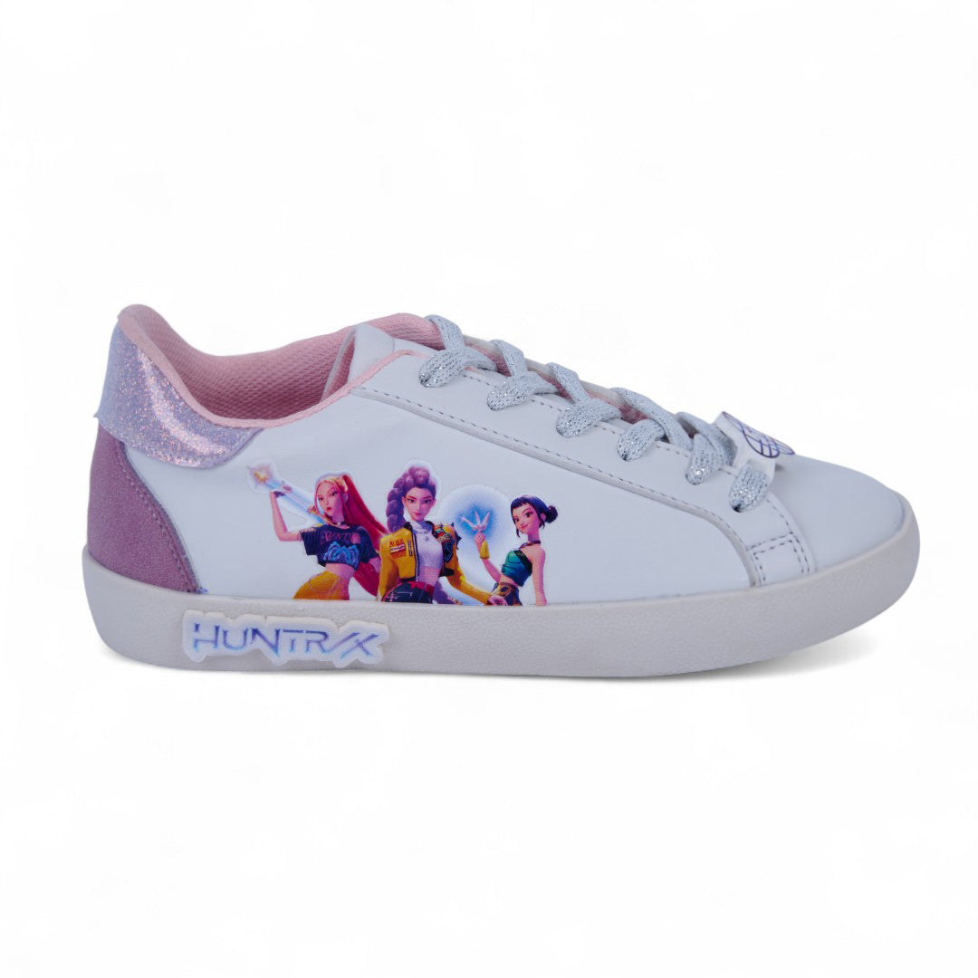 Tenis casual blanco con estampado en el costado y cintas; ligero, fresco y perfecto para looks casuales o uso diario.