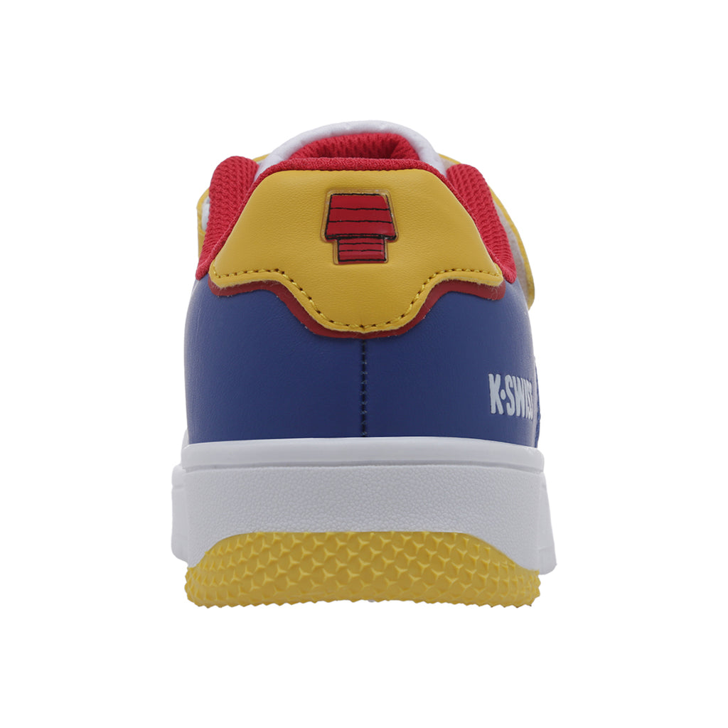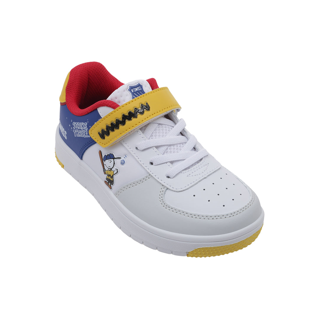 Tenis K-Swiss clásico casual de color blanco licencia Snoopy con contactel y cordones ajustables; detalles de color al contraste. Material: Vacuno.