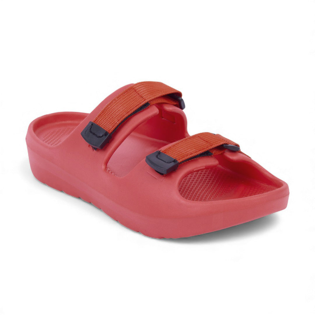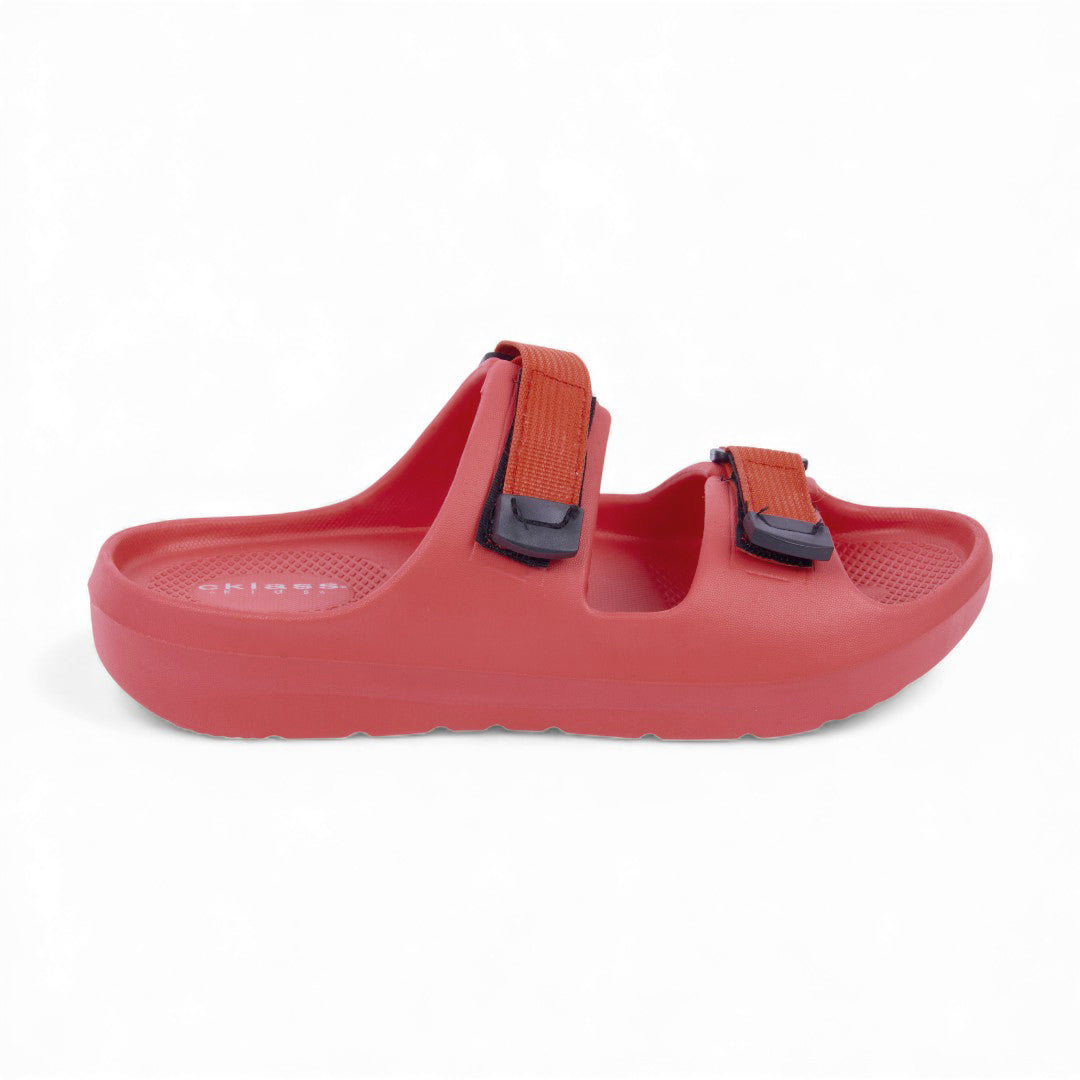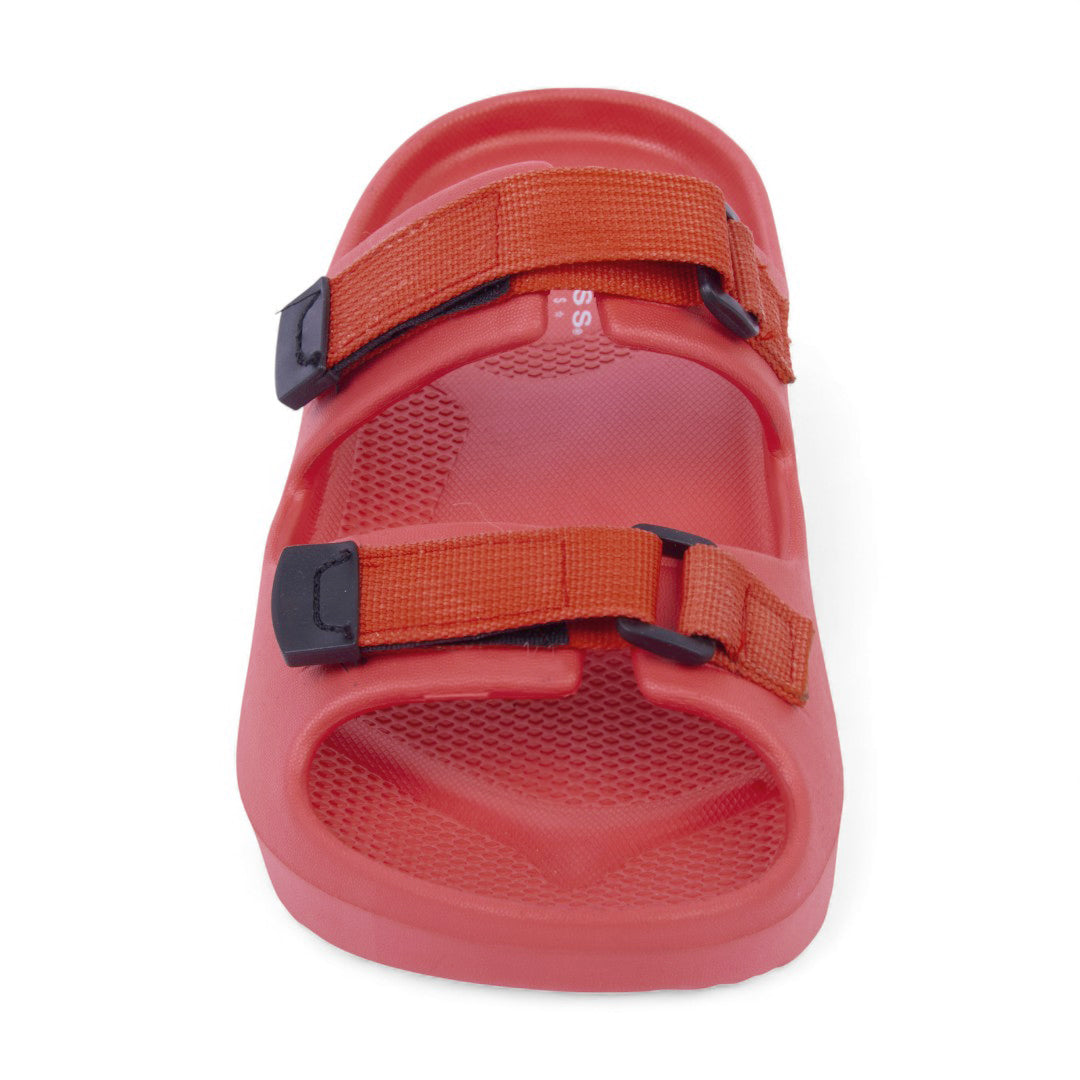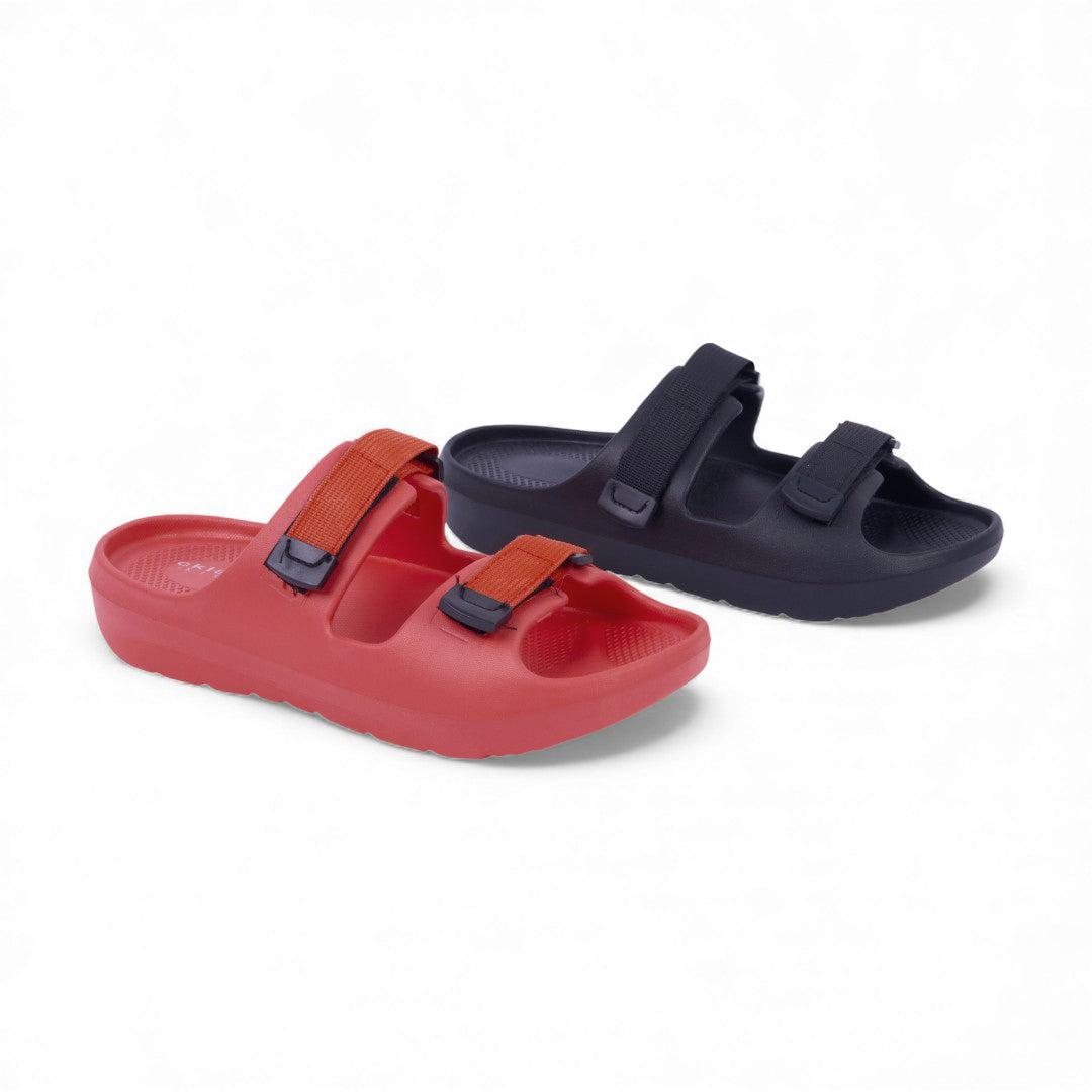 Dúo de sandalias deportivas negro y rojo con látigos ajustables y plantilla sintética; diseño cómodo, resistente y versátil.