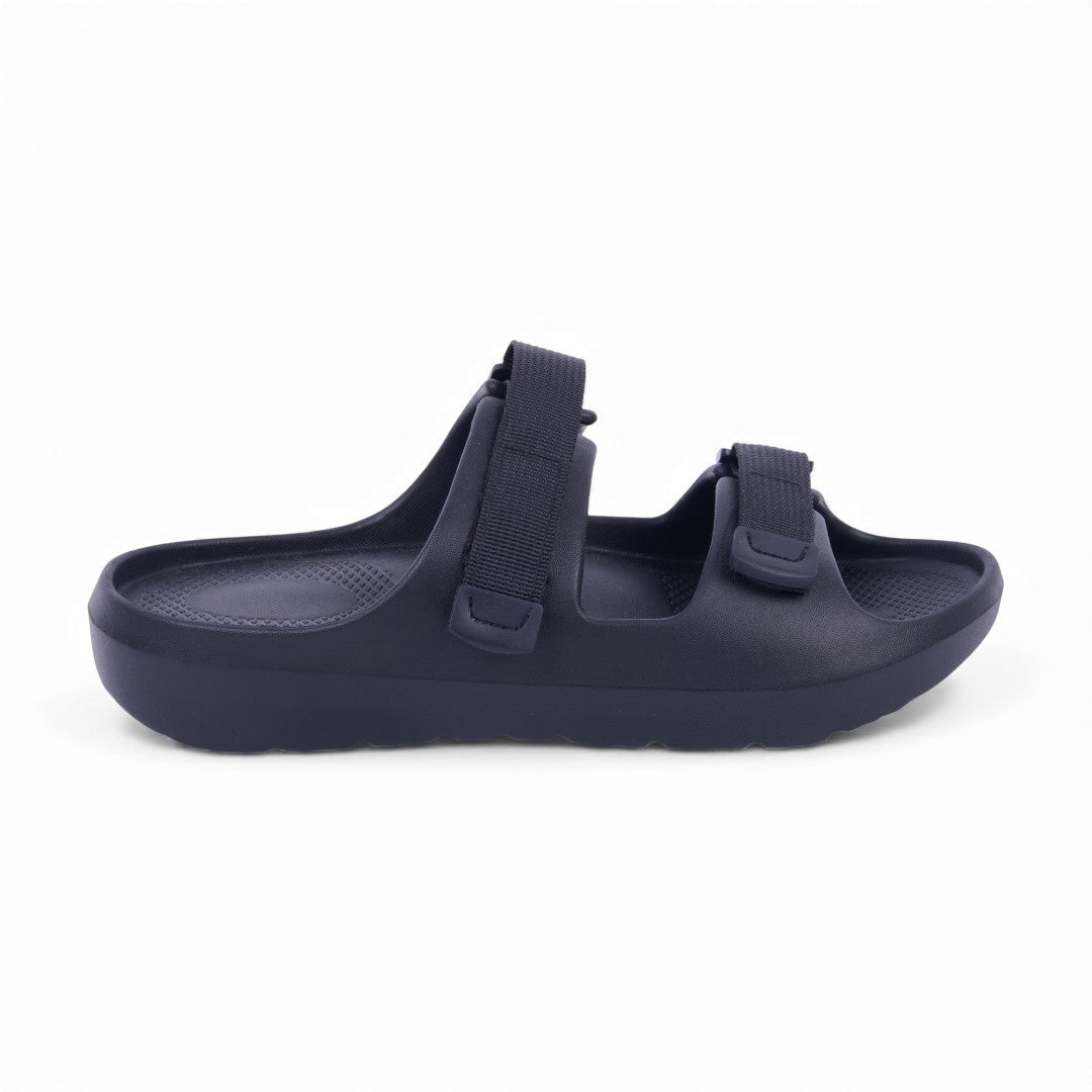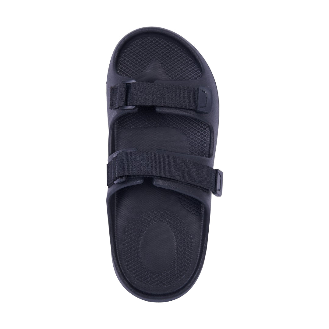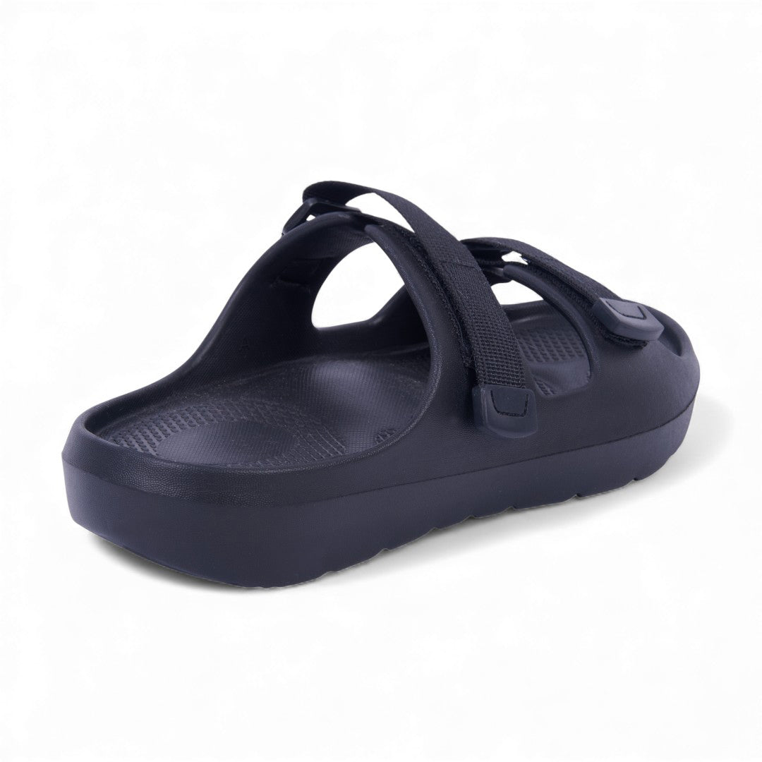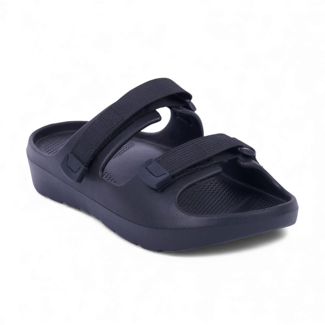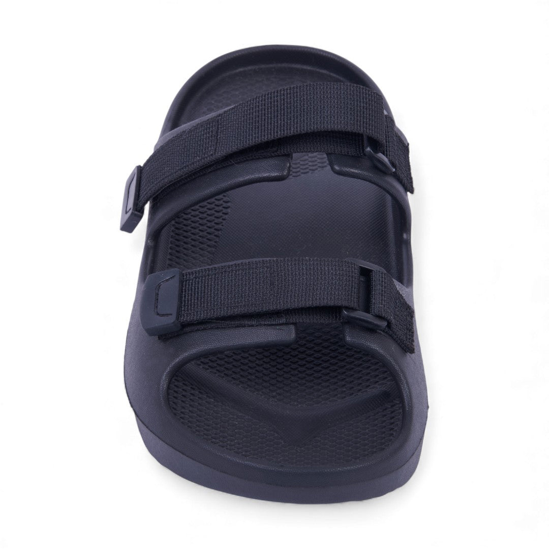Dúo de sandalias deportivas negro y rojo con látigos ajustables y plantilla sintética; diseño cómodo, resistente y versátil.