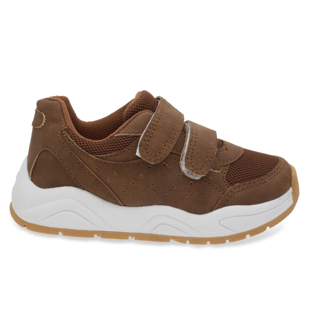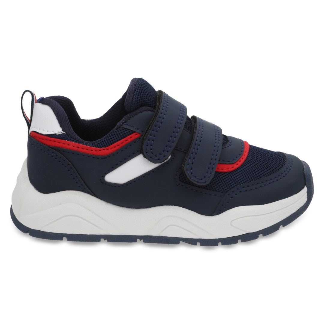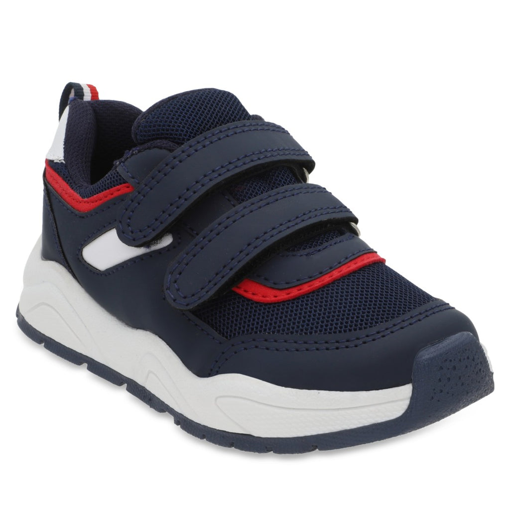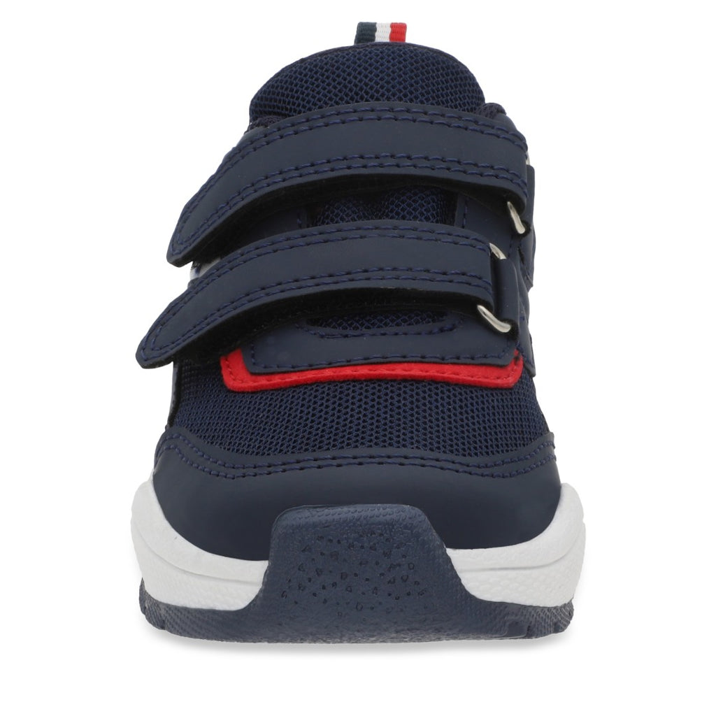Dúo tenis deportivo con detalle lateral y contactel, plantilla textil, color marino y miel. Material: Sintético y textil.