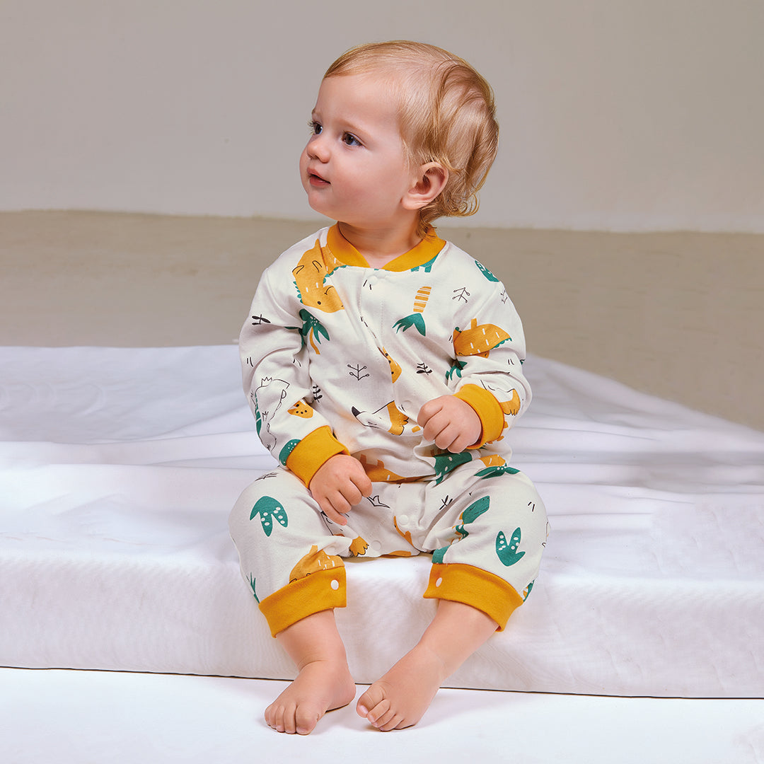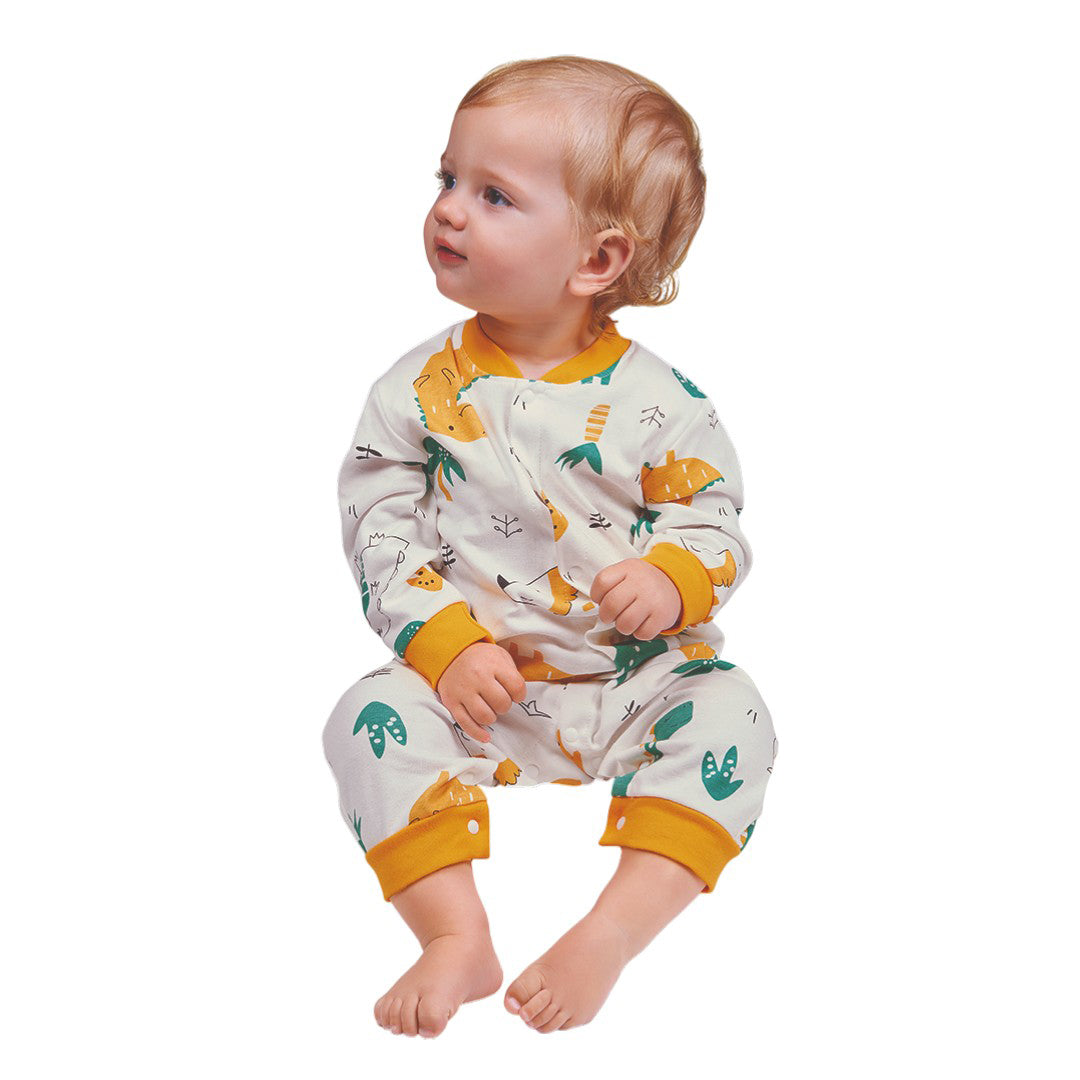 Mameluco multicolor para bebé con divertido estampado de dinosaurios, confeccionado en algodón suave. Diseño con manga y piernas con puños amarillos y botones de presión frontales y en piernas. Cómodo, práctico y adorable para uso diario.