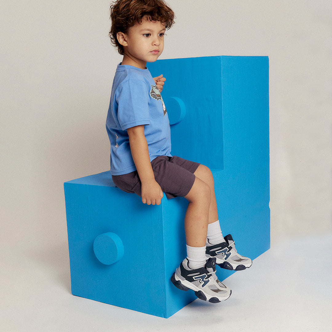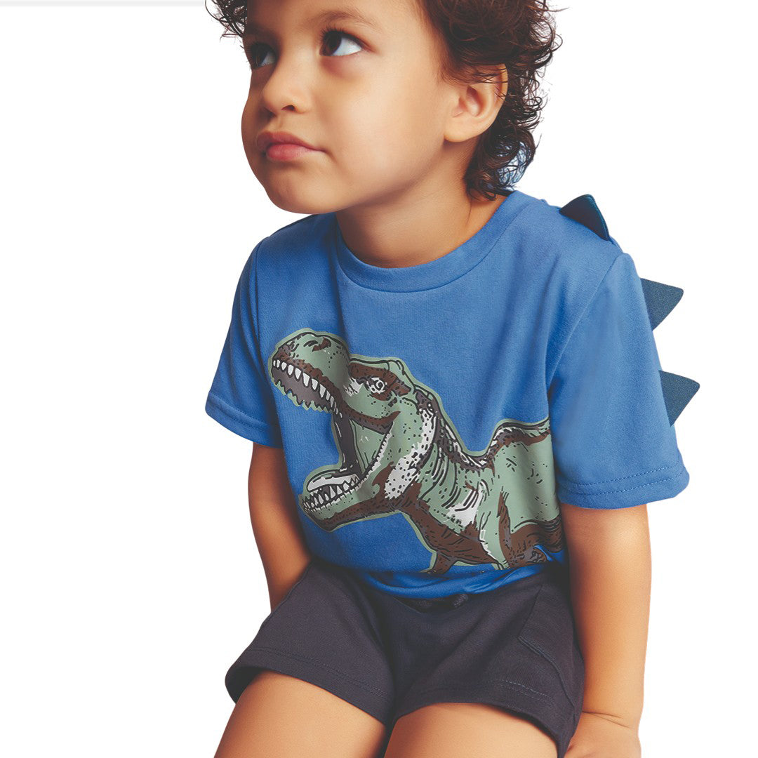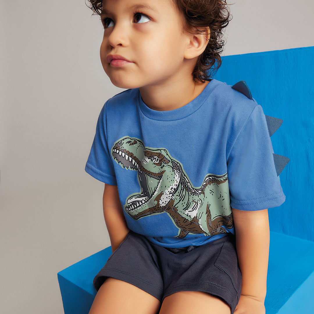 Playera azul infantil con cuello redondo y manga corta, corte regular y detalle de dinosaurio con parches tridimensionales; divertida, suave y perfecta para el día a día.