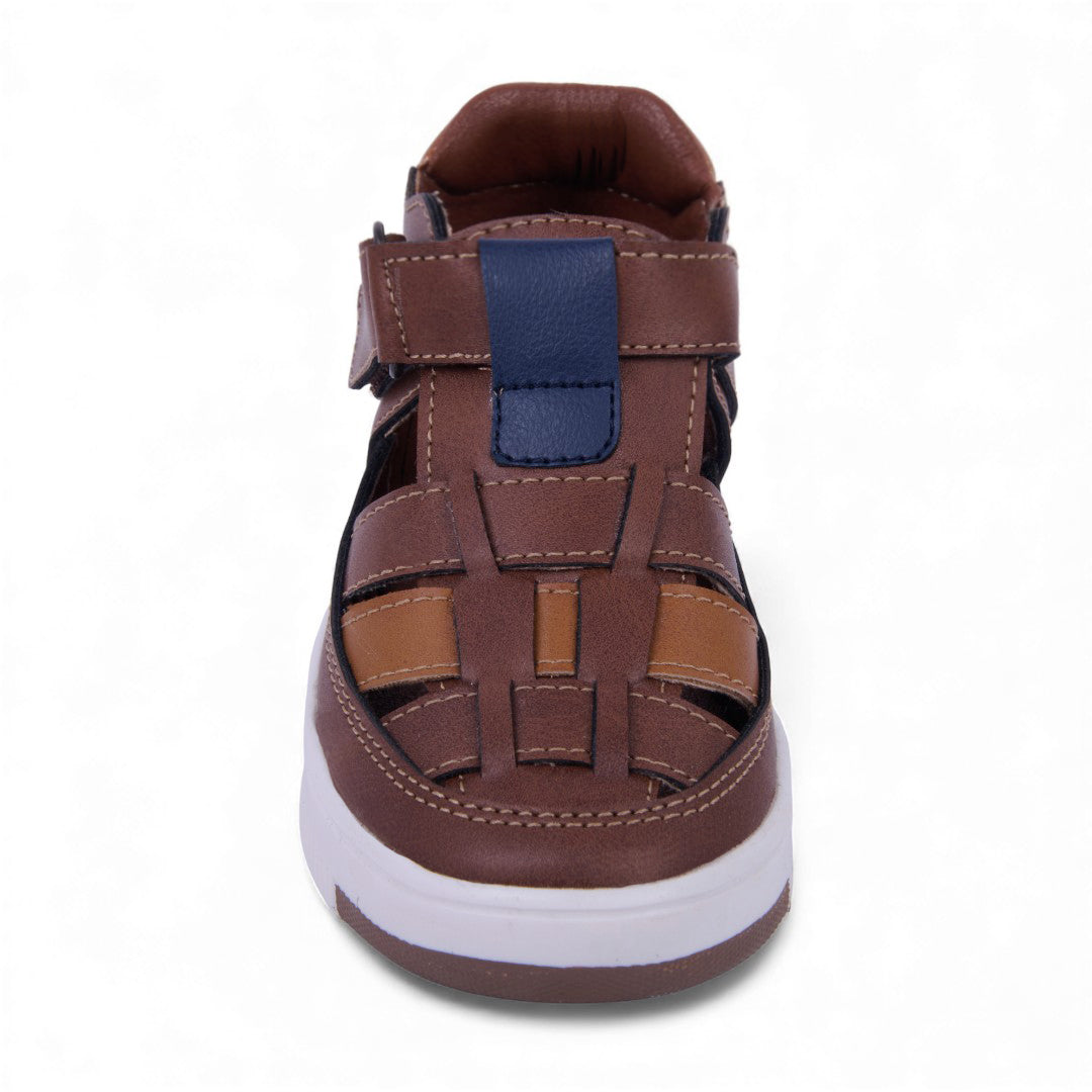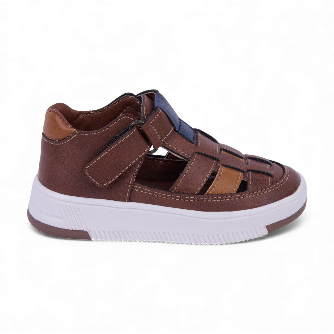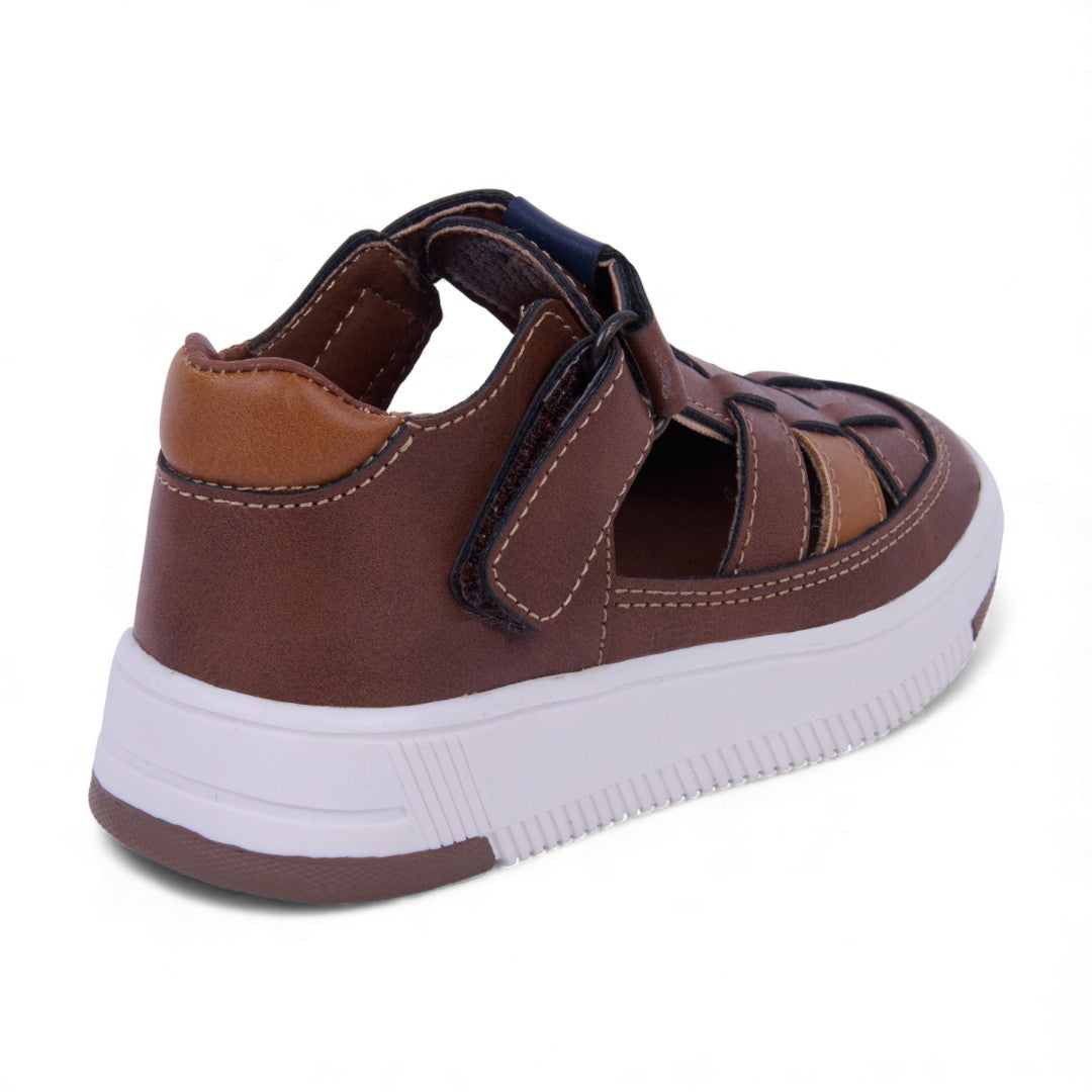 Sandalia casual color café con diseño cerrado, detalles bordados y cierre con contactel. Cómoda, ligera y perfecta para looks frescos y prácticos del día a día.