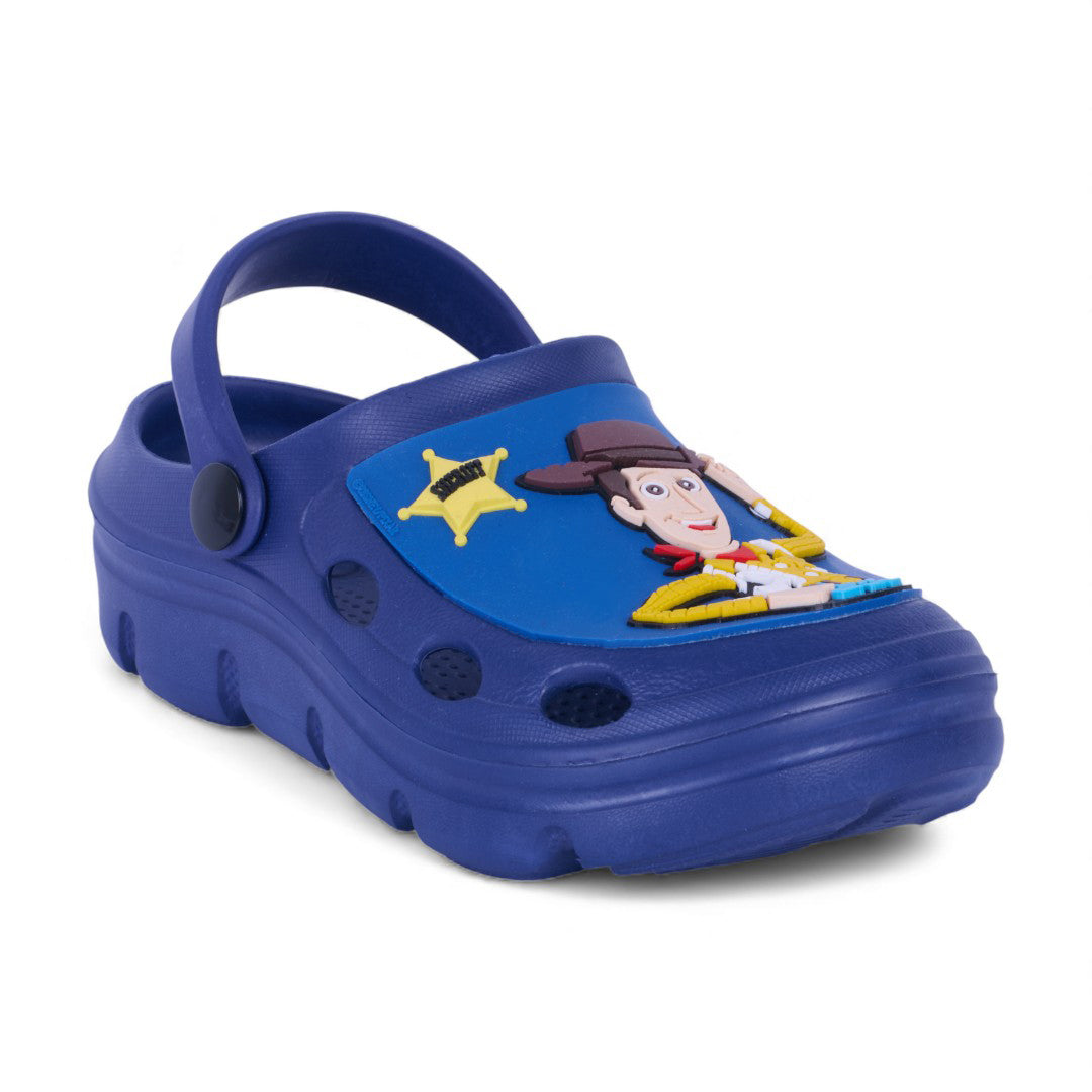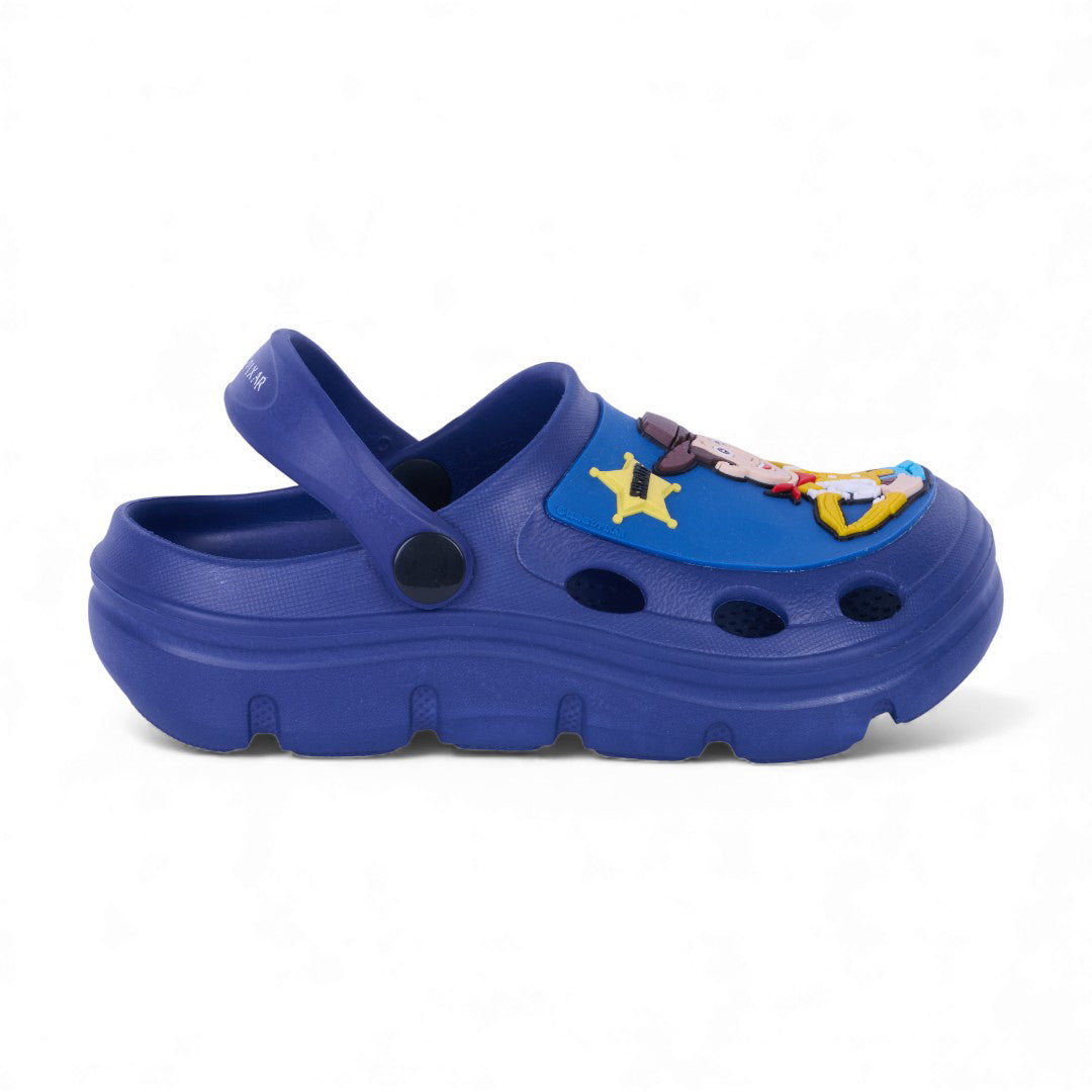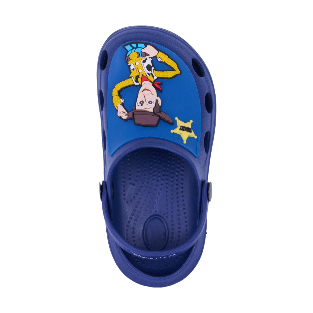 Sandalia casual de piso color marino con estampado gráfico decorativo y pulsera ajustable. Plantilla sintética ligera y diseño cómodo para uso diario.