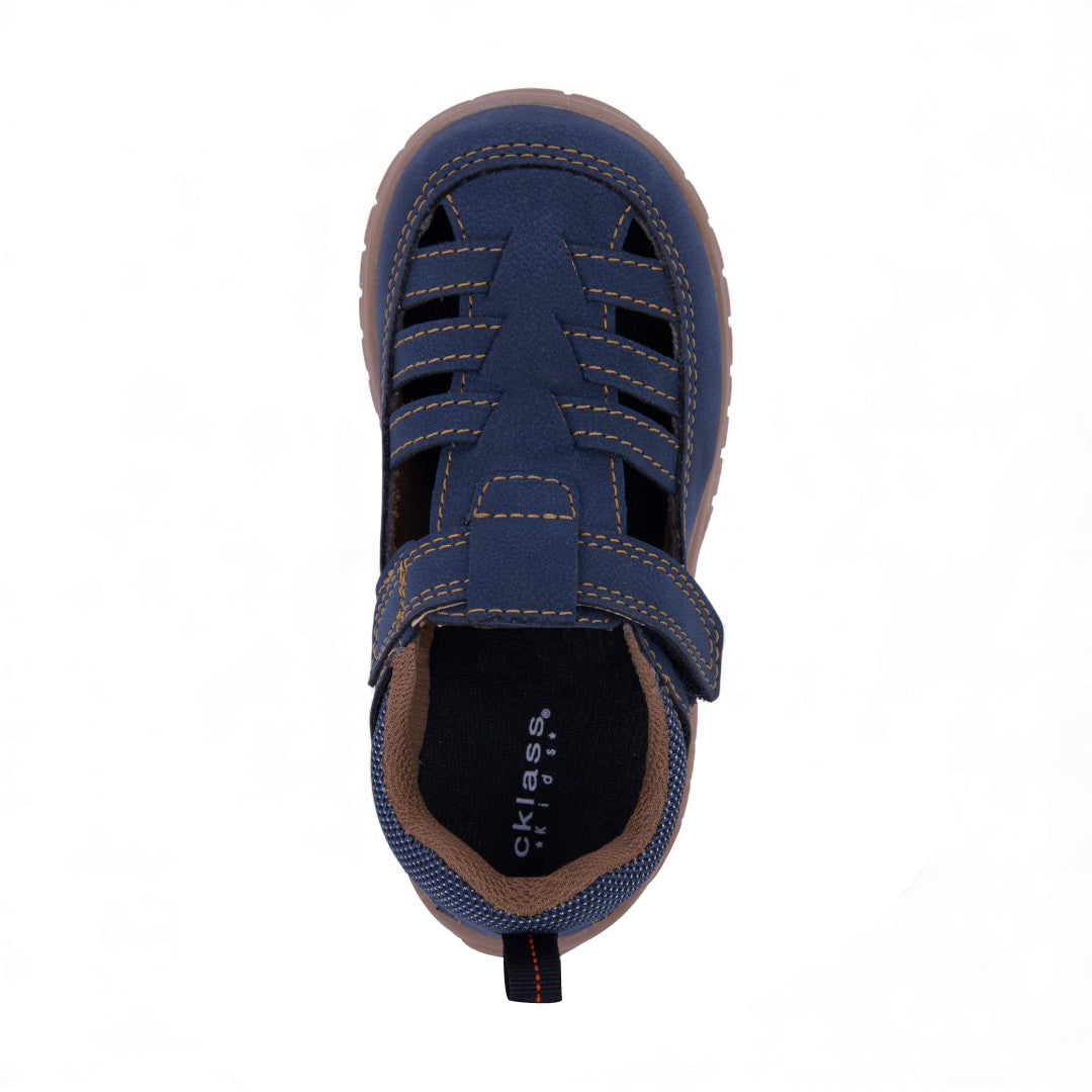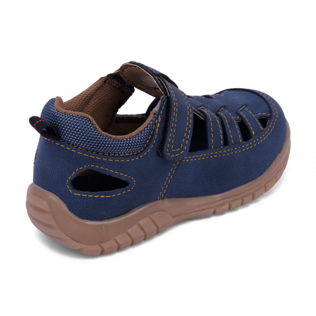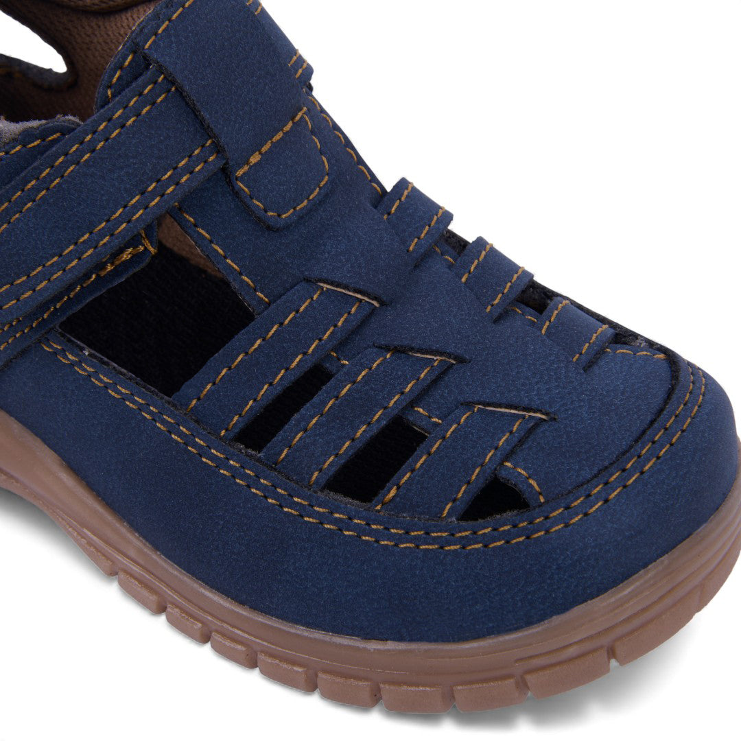 Sandalia casual cerrada color marino con detalles bordados y látigo con contactel; ligera, cómoda y perfecta para uso diario o looks relajados.