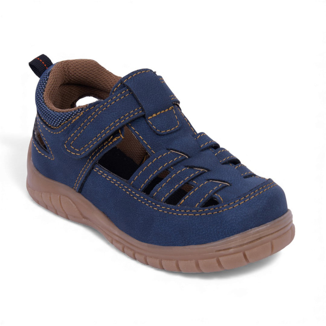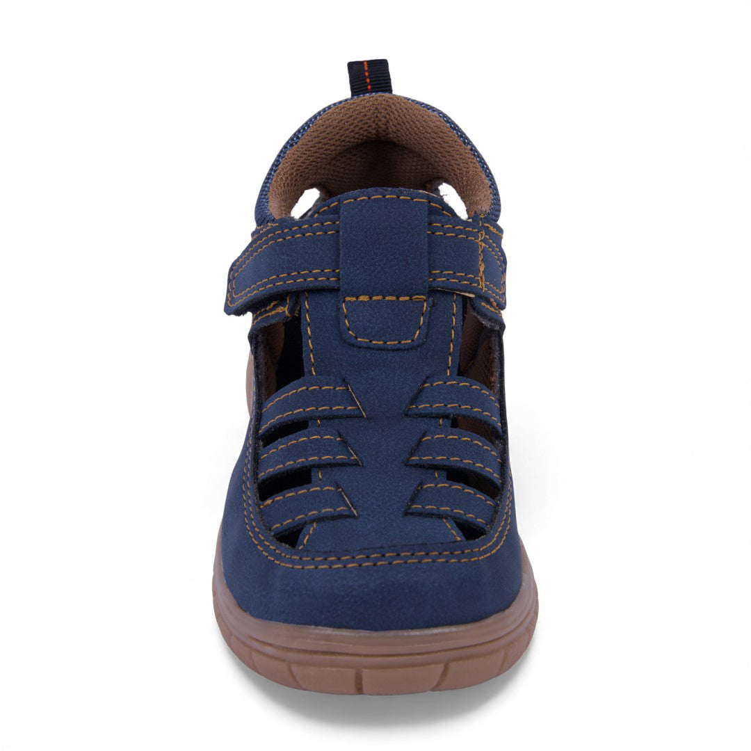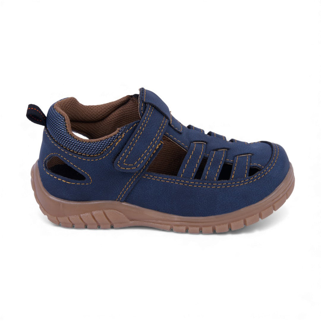Sandalia casual cerrada color marino con detalles bordados y látigo con contactel; ligera, cómoda y perfecta para uso diario o looks relajados.