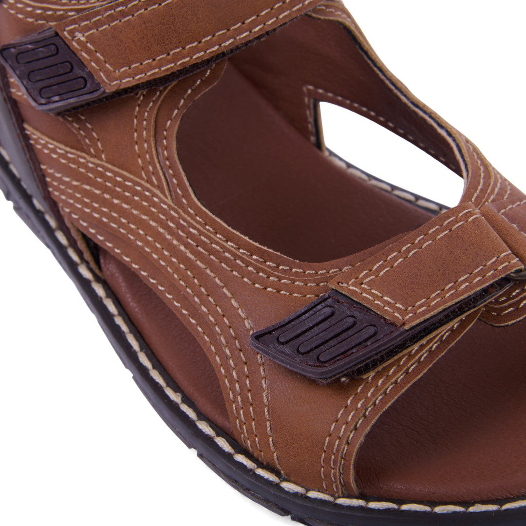 Sandalia casual color miel con látigos ajustables mediante velcro y finos detalles bordados. Ligera, cómoda y perfecta para looks frescos y combinables.