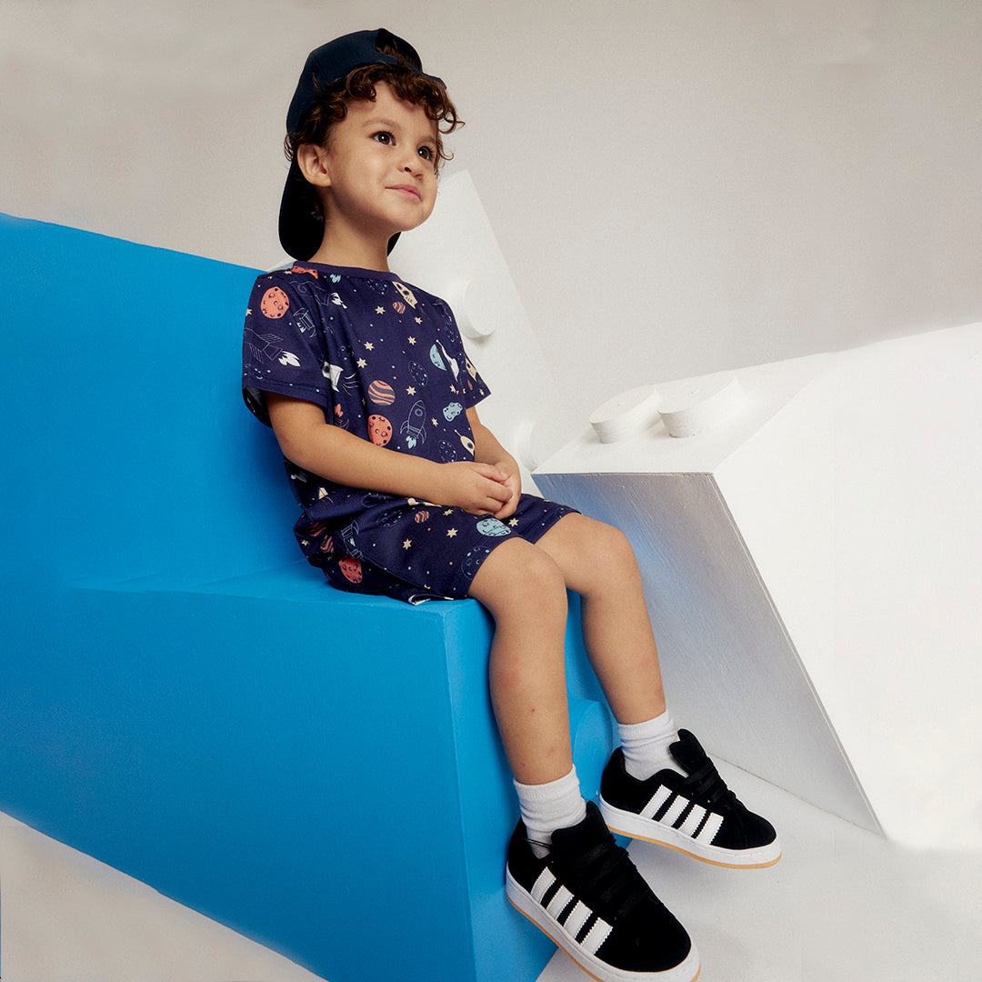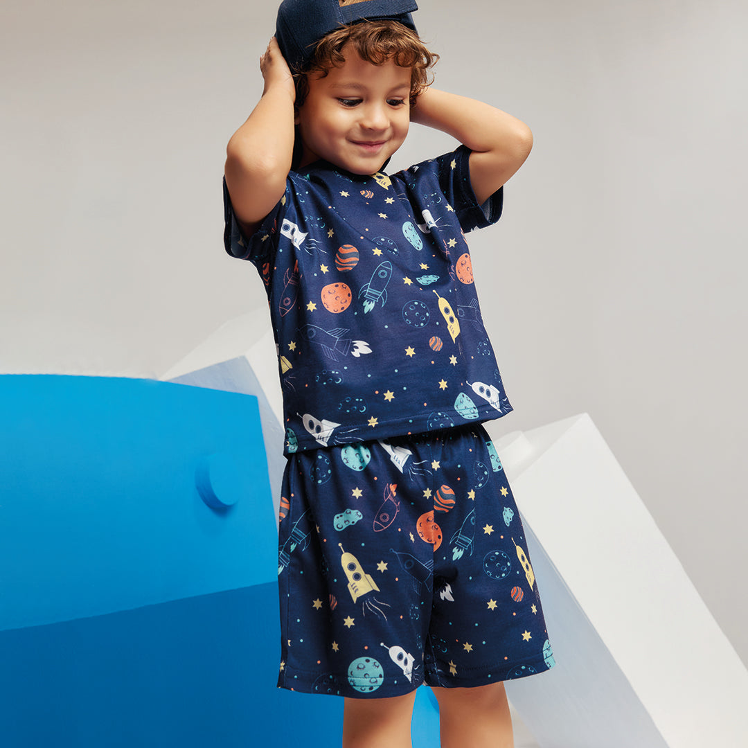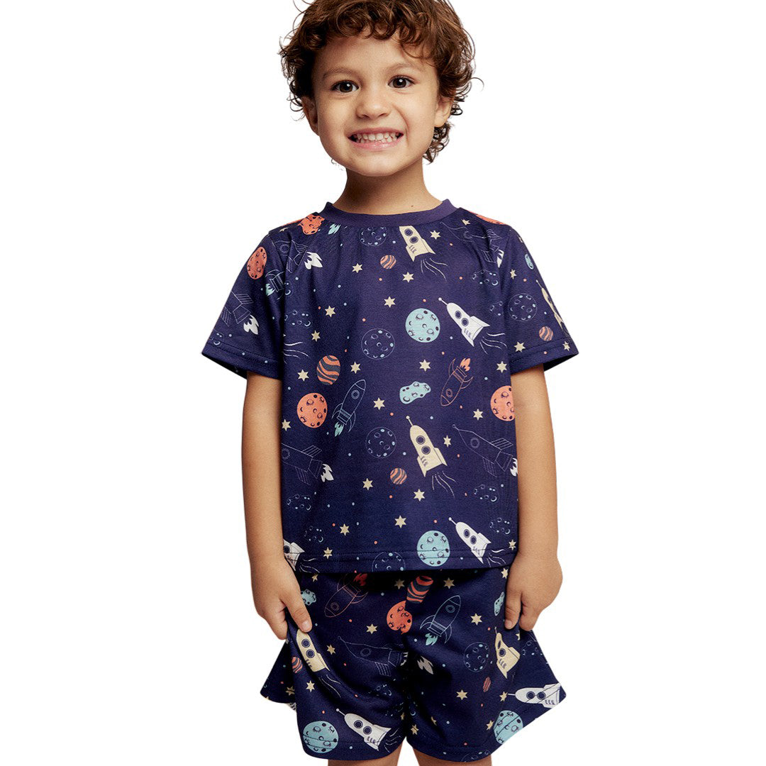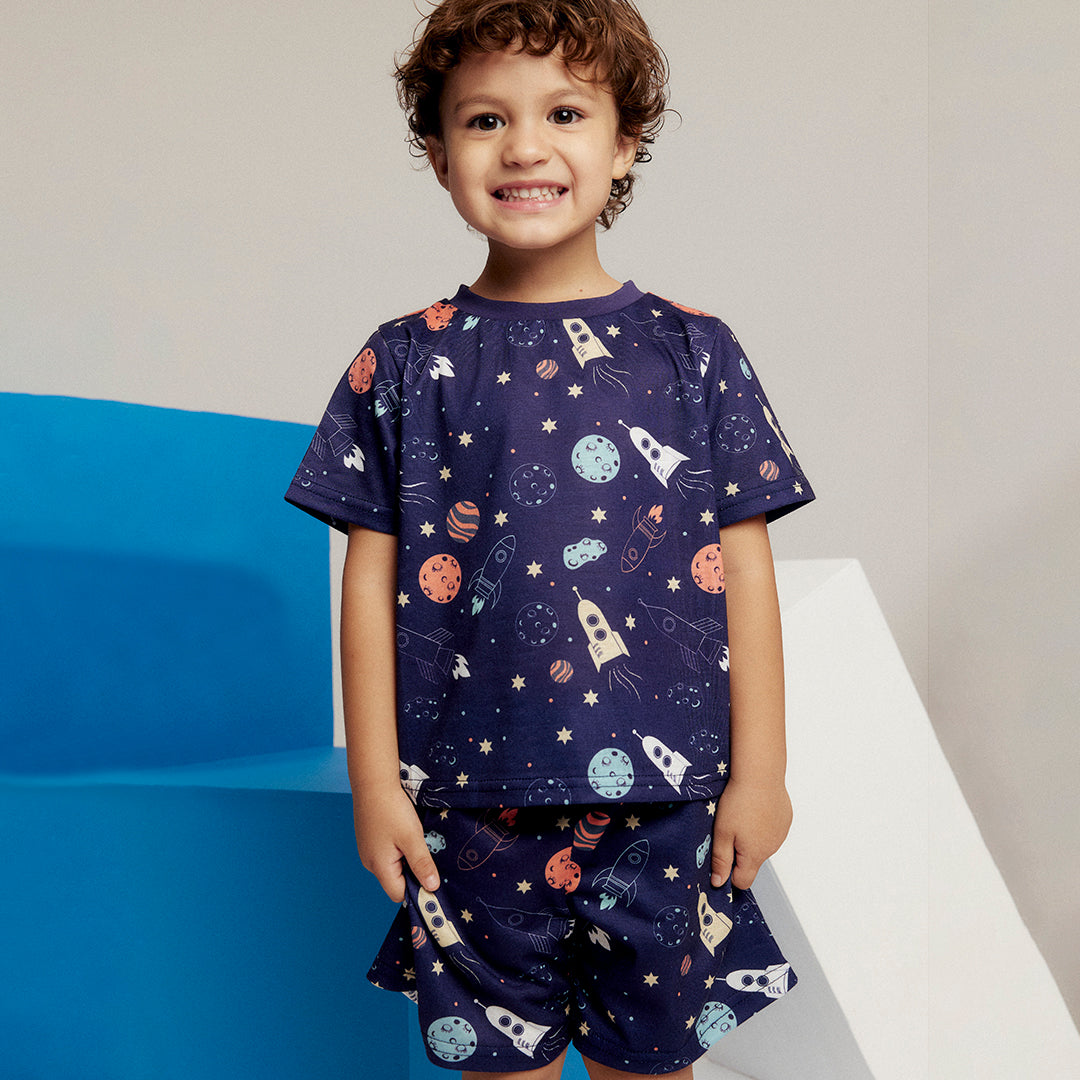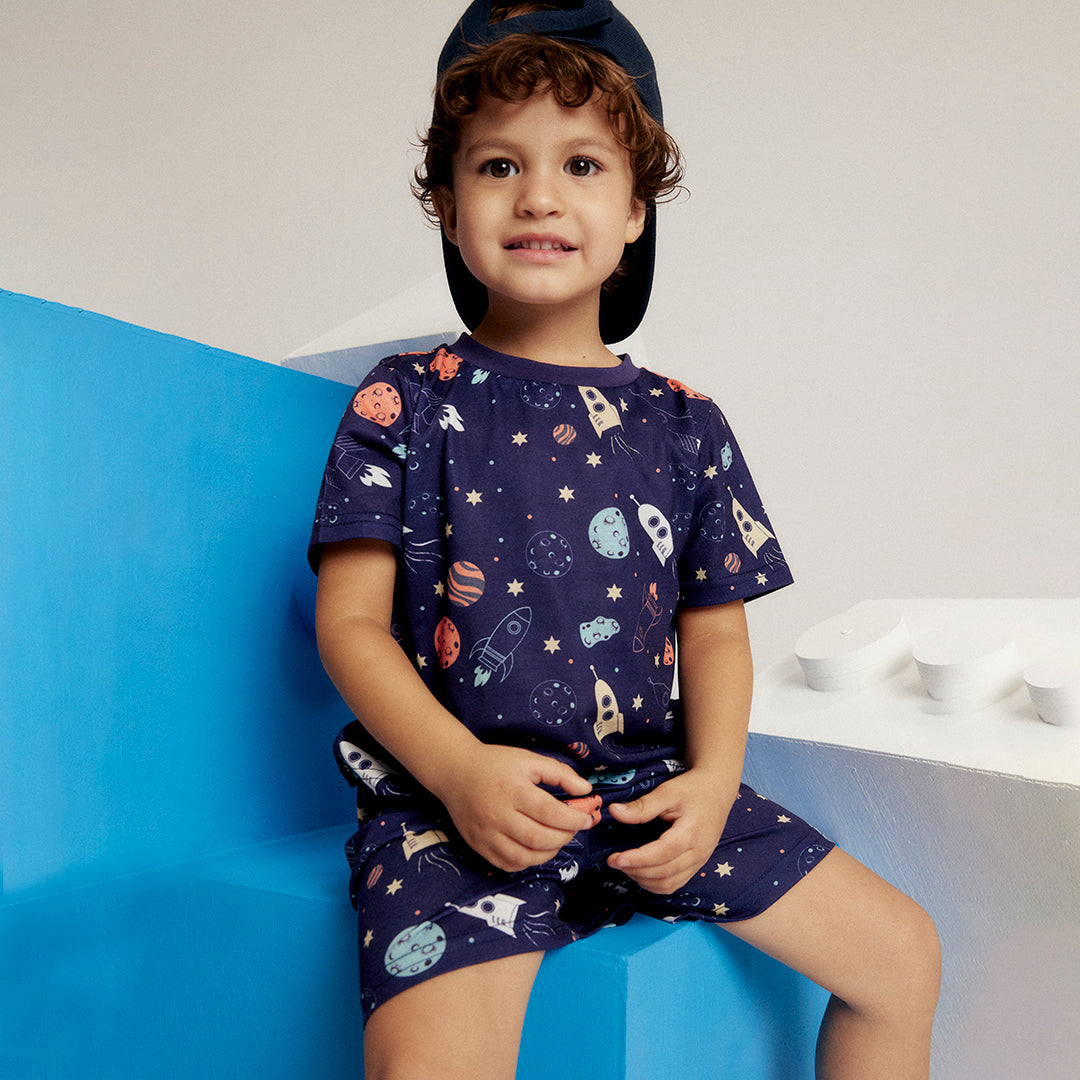 Set infantil multicolor con playera estampada de astronautas, cuello redondo, manga corta y short con pretina elástica; cómodo, divertido e ideal para actividades diarias.