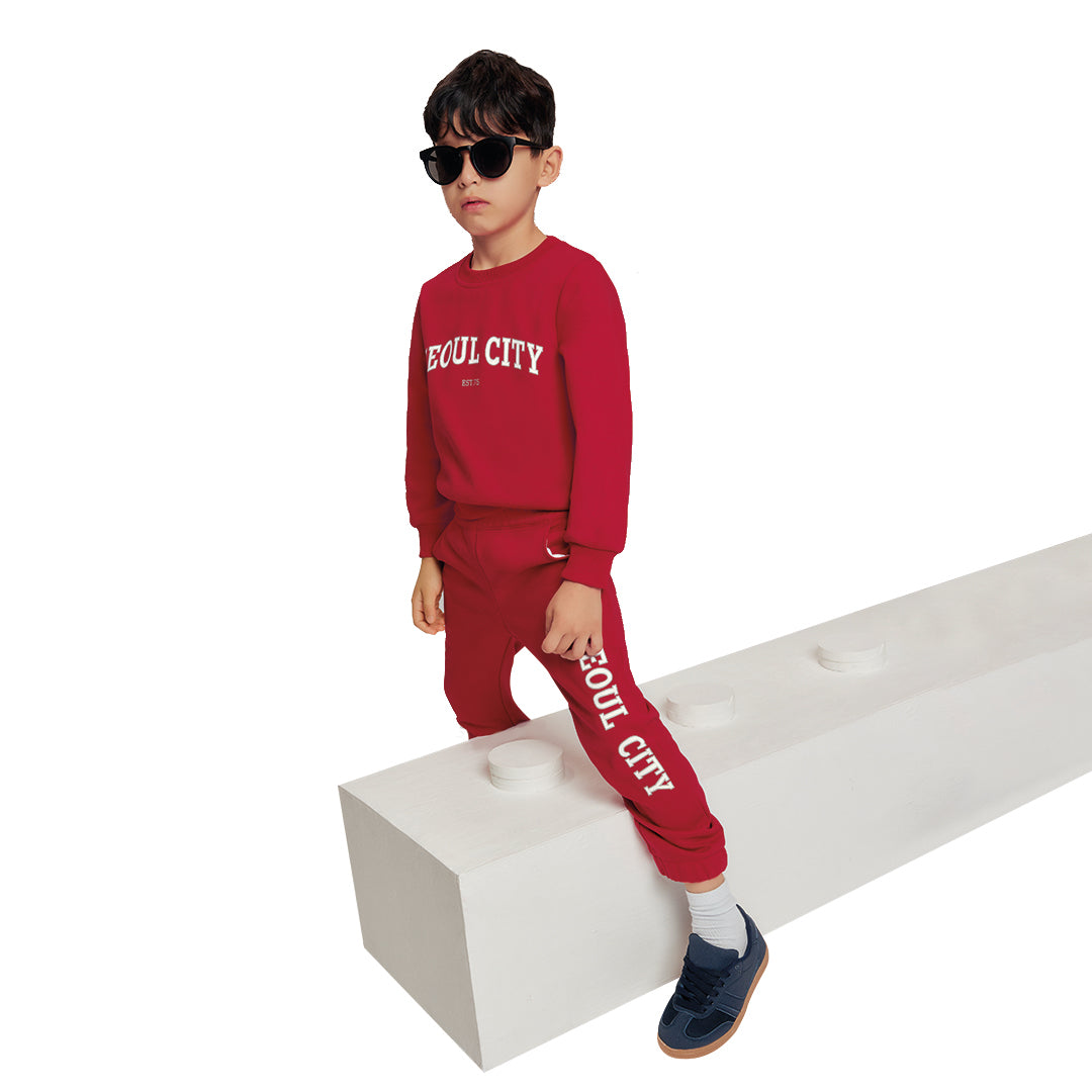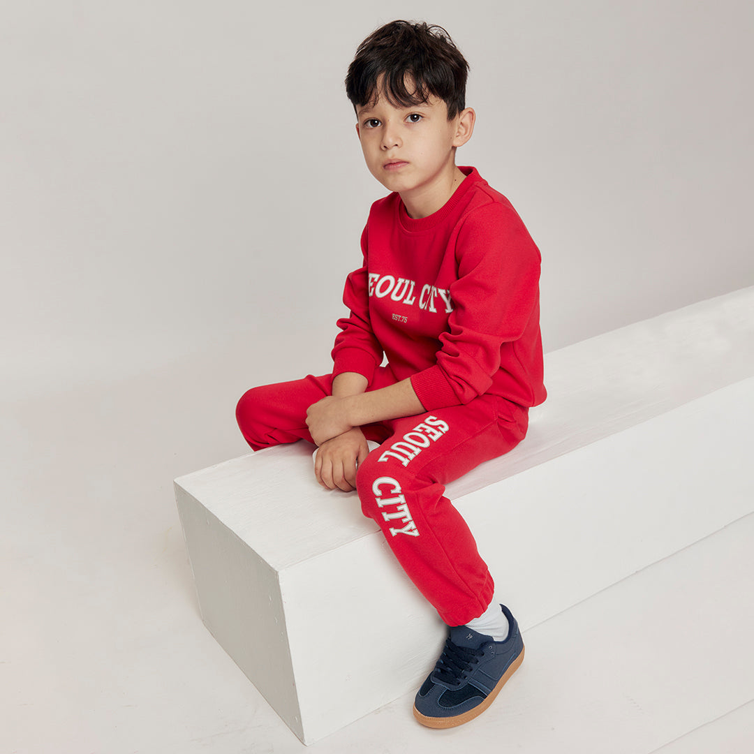 Sudadera roja con estampado frontal, cuello y puños tipo cárdigan, corte regular y tela suave ideal para uso diario; cómoda, cálida y perfecta para outfits casuales infantiles.