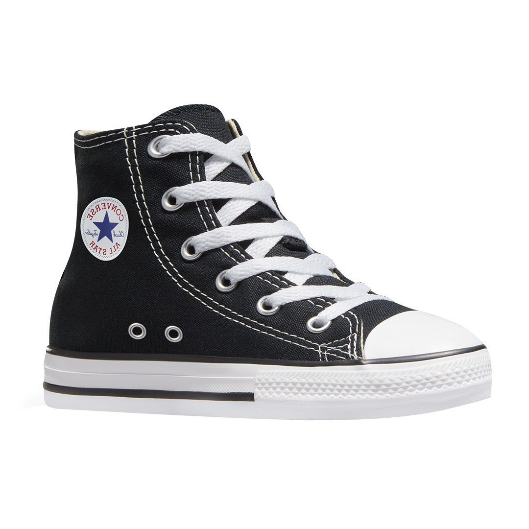 Tenis tipo bota Converse Chuck Taylor de color negro con cinta ajustable; detalle de dos ojales en lateral con logo de la marca estampado y suela con textura de diamantes.