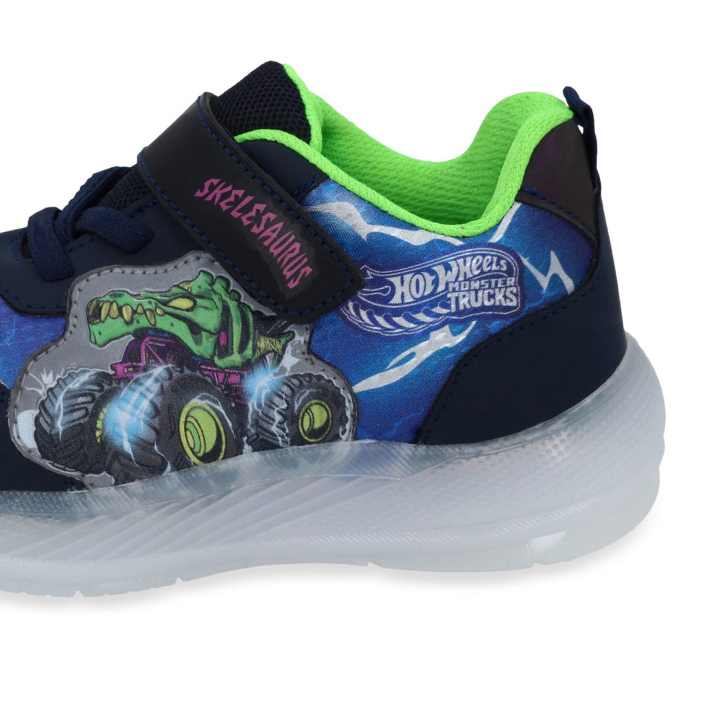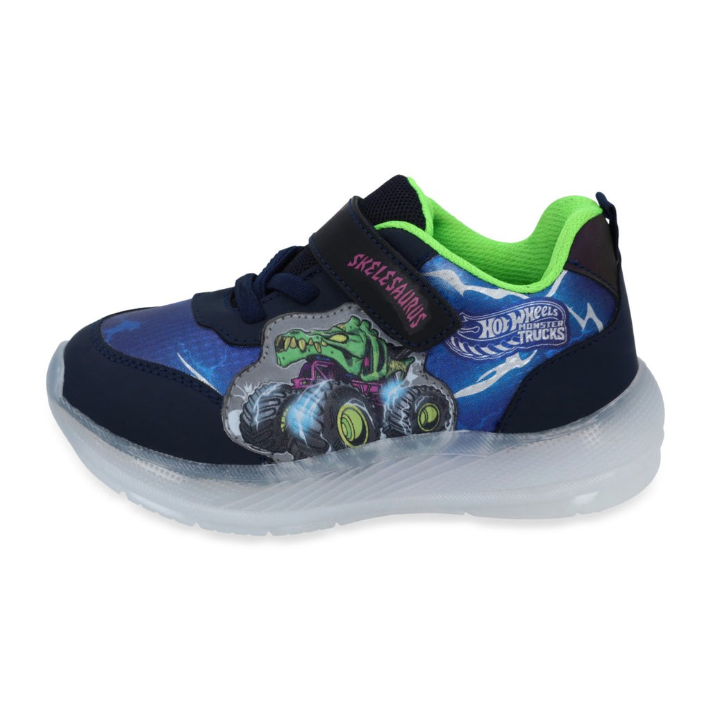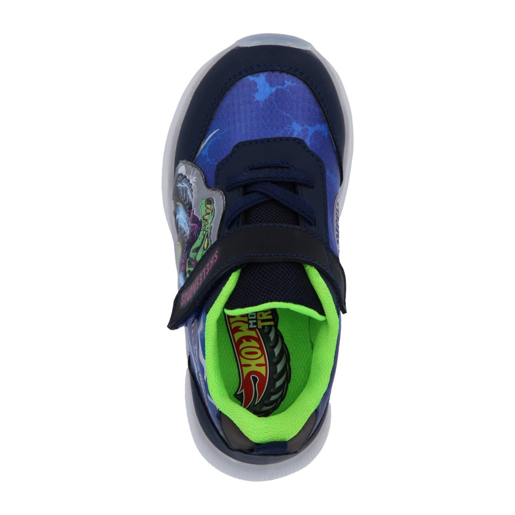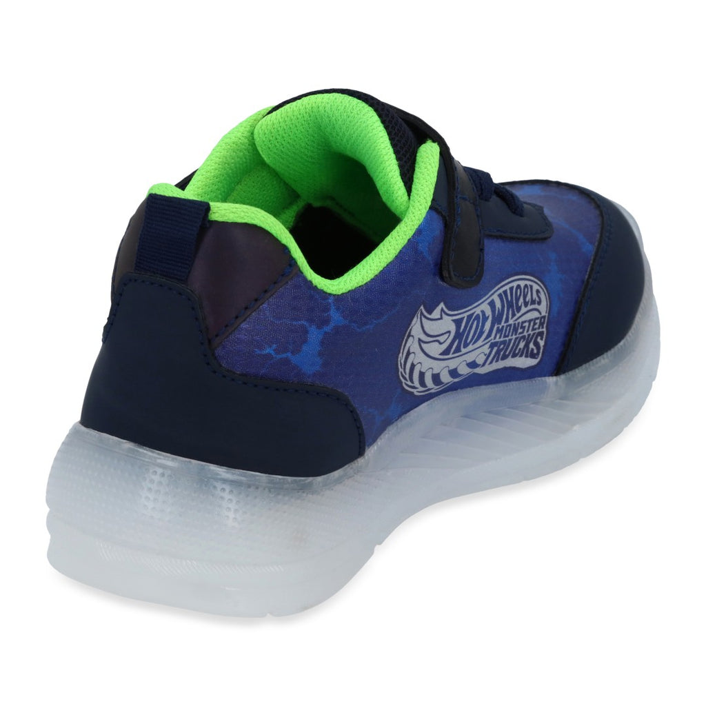 Tenis deportivo color azul, con estampado de HOT WHEELS, cintas elásticas y contactel, calzado con luces. Plantilla: Textil. Material: Sintético.