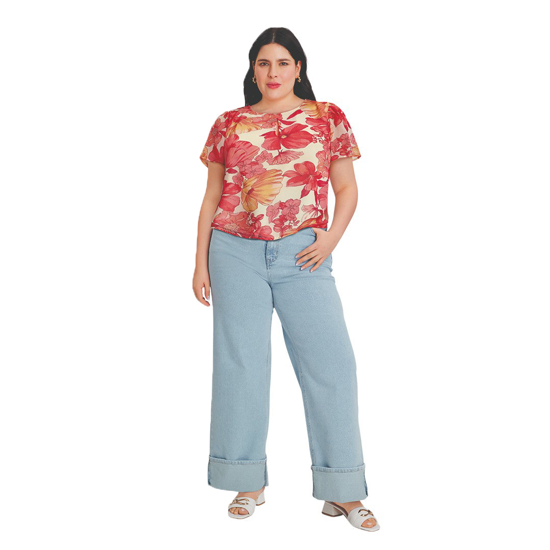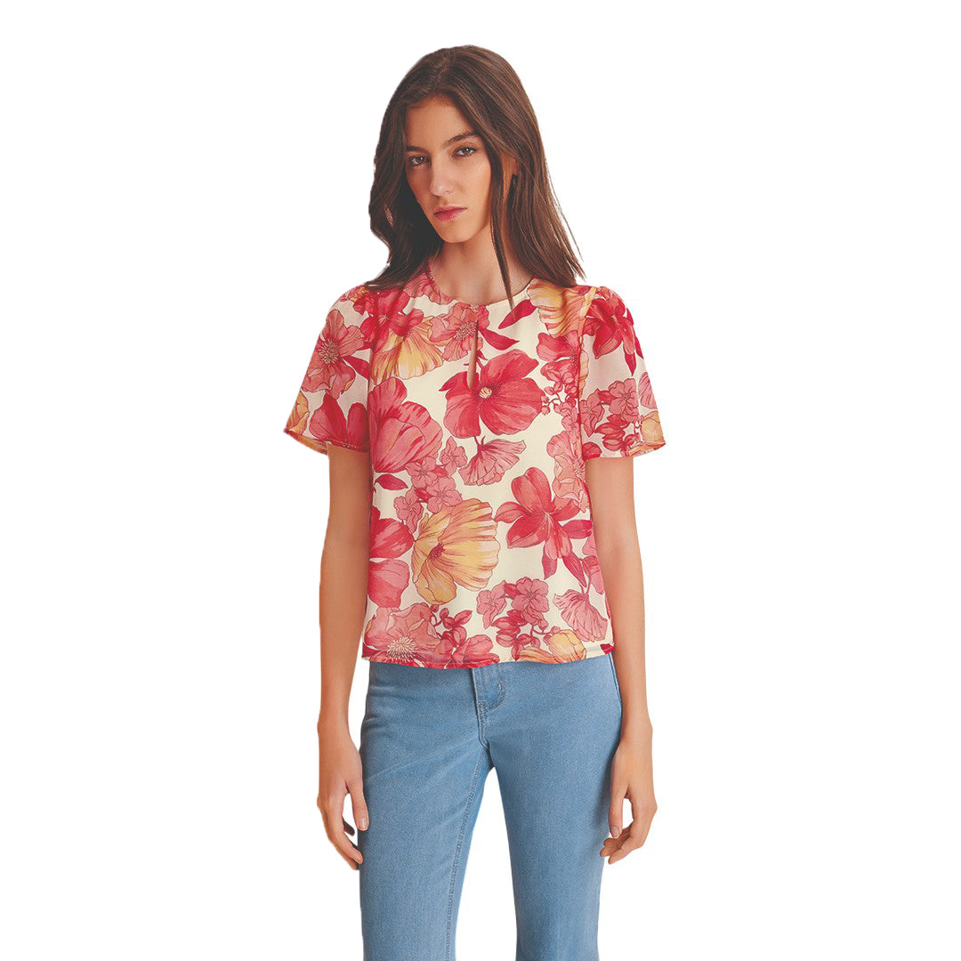 Blusa multicolor floral con cuello redondo, escote ojal, manga farol y espalda con abertura. Moderna, fresca y femenina.