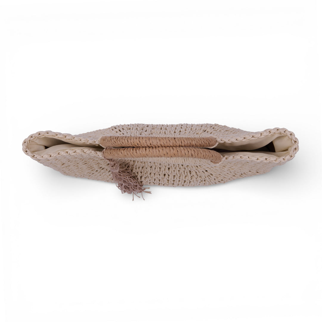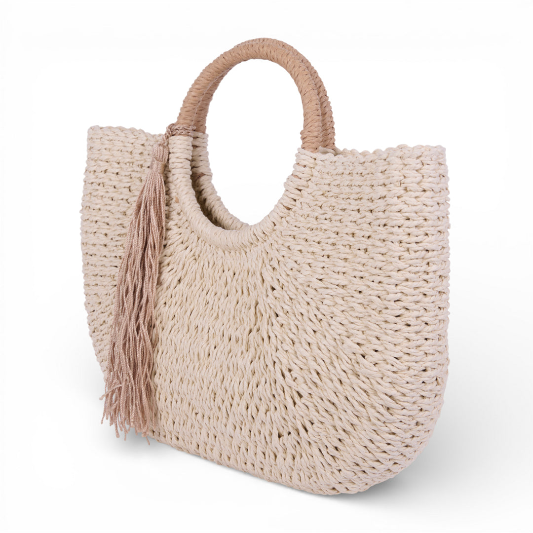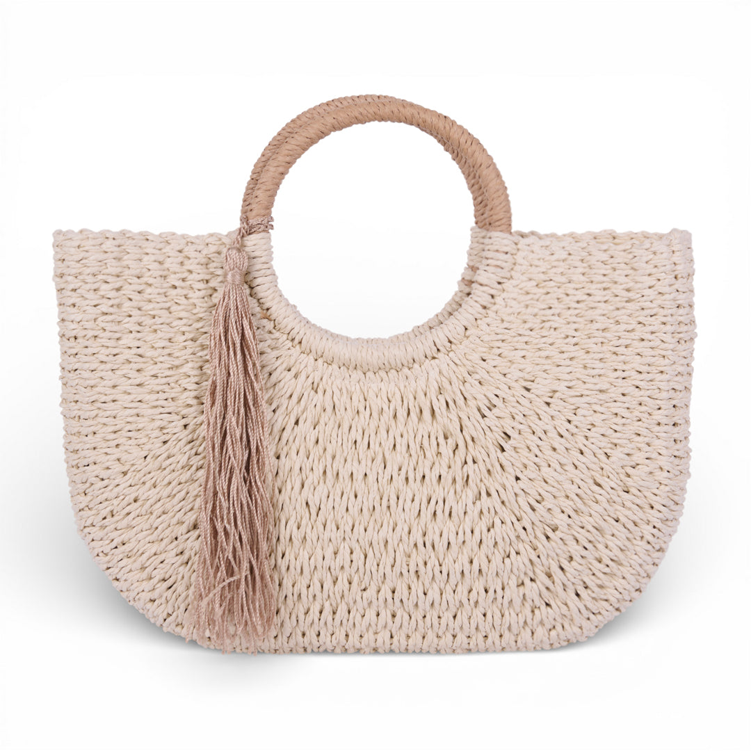 Bolso tejido en material sintético con diseño semicircular y asa redonda integrada. Incluye detalle decorativo de borla lateral. Color beige uniforme. Estilo casual, ideal para verano, salidas y uso diario.