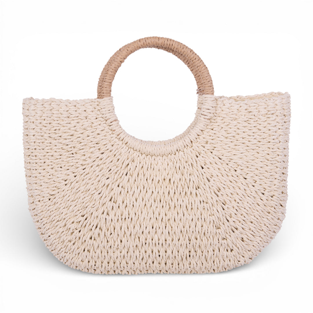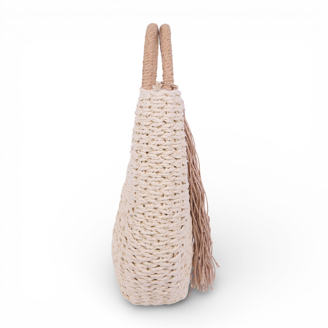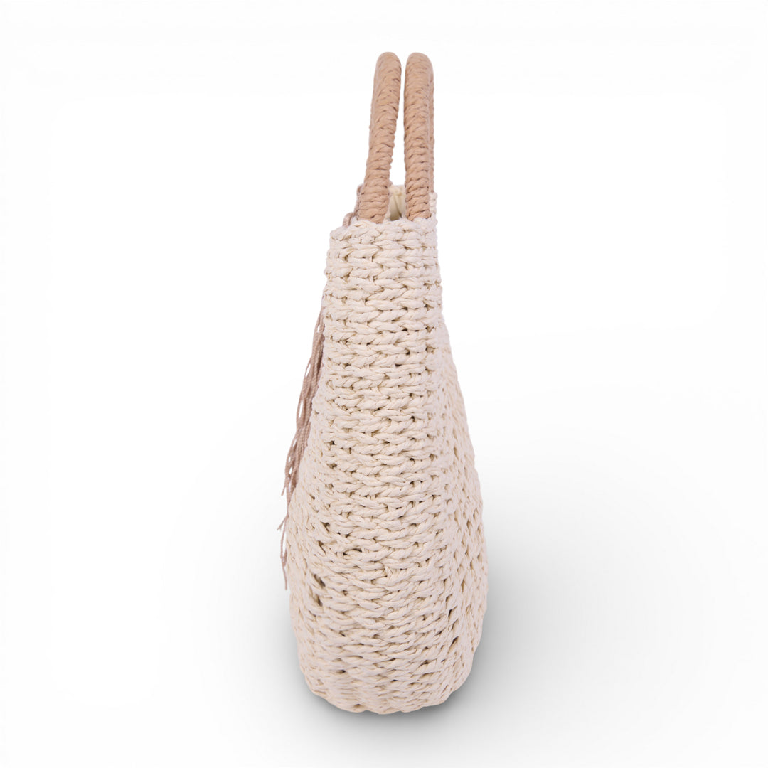 Bolso tejido en material sintético con diseño semicircular y asa redonda integrada. Incluye detalle decorativo de borla lateral. Color beige uniforme. Estilo casual, ideal para verano, salidas y uso diario.