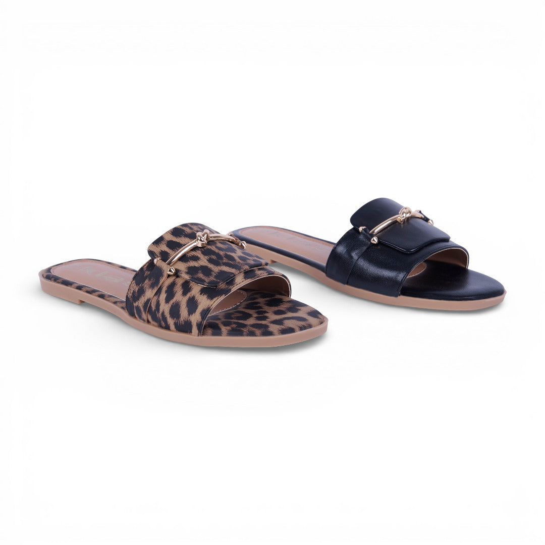 El dúo 192 inlcuye 2 pares de sandalias con exterior, interior y suela de material sintético. Diseño de tira ancha con hebilla metálica decorativa. Suela plana baja. Colores negro y animal print. Estilo casual para uso diario. Comodidad y versatilidad