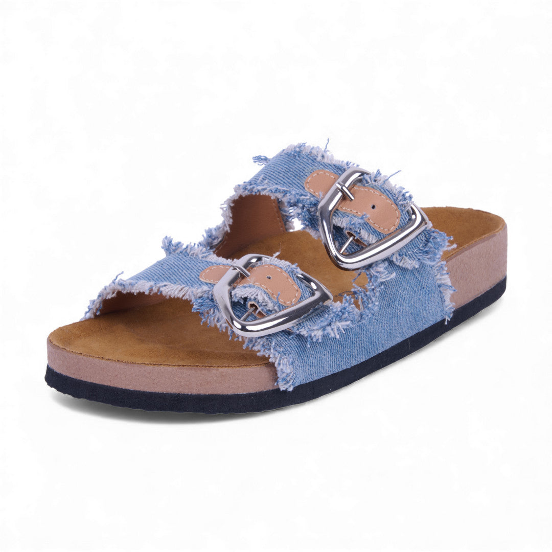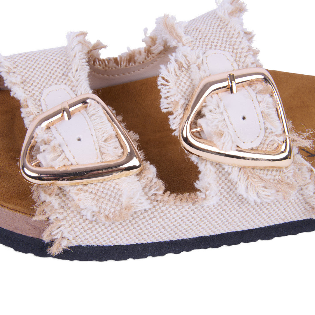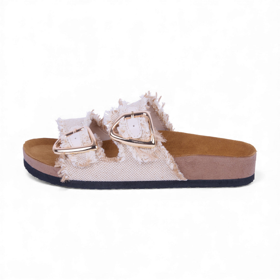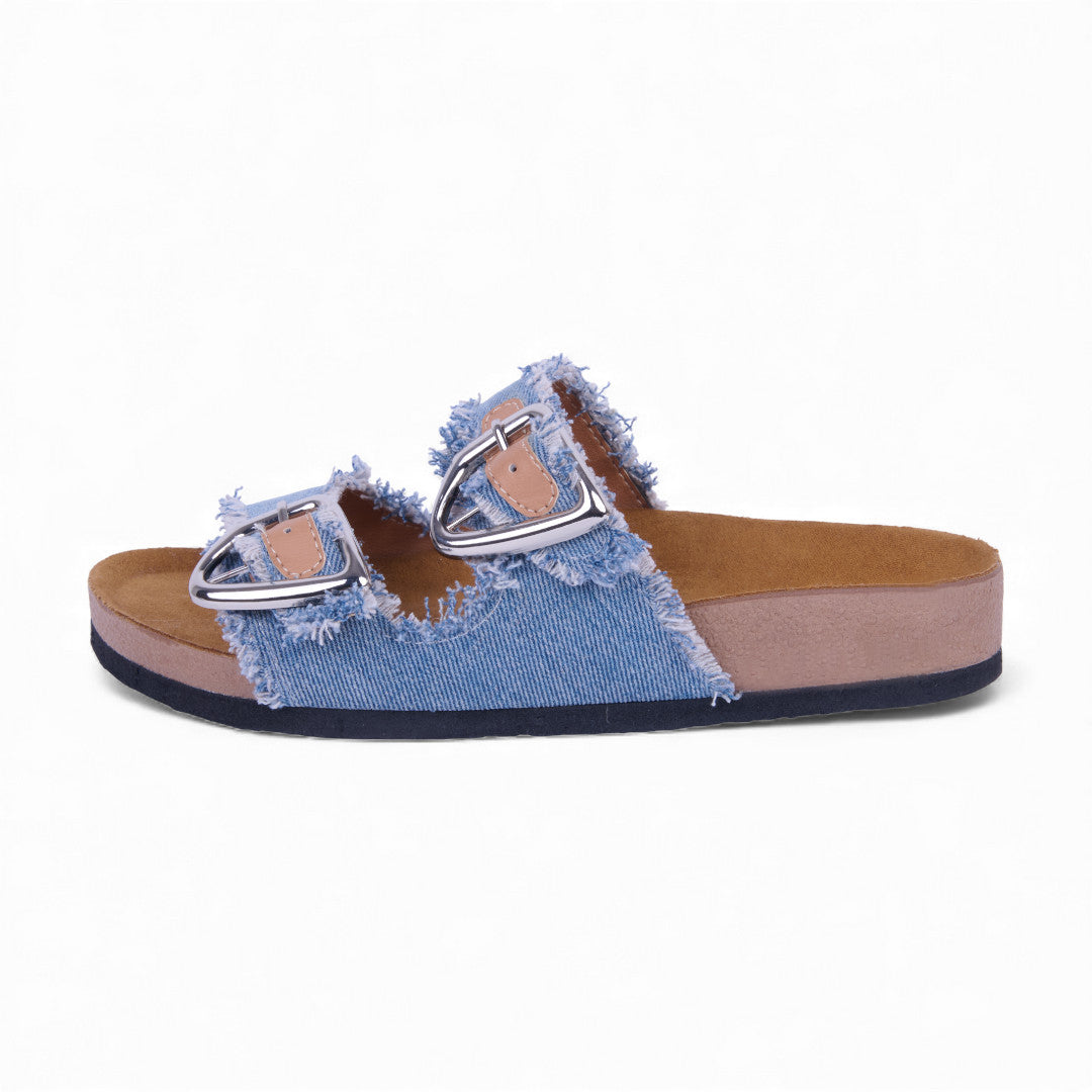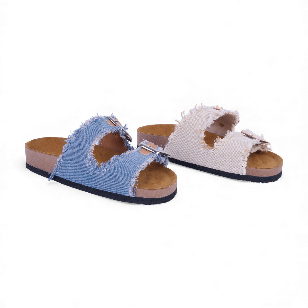 Dúo de sandalias de piso tipo Birkenstock con látigos ajustables y hebilla dorada, que brindan ajuste perfecto y estilo sofisticado. Plantilla sintética acolchada para comodidad prolongada. Colores hueso y mezclilla versátiles. Ideales para looks casuales, urbanos y modernos.