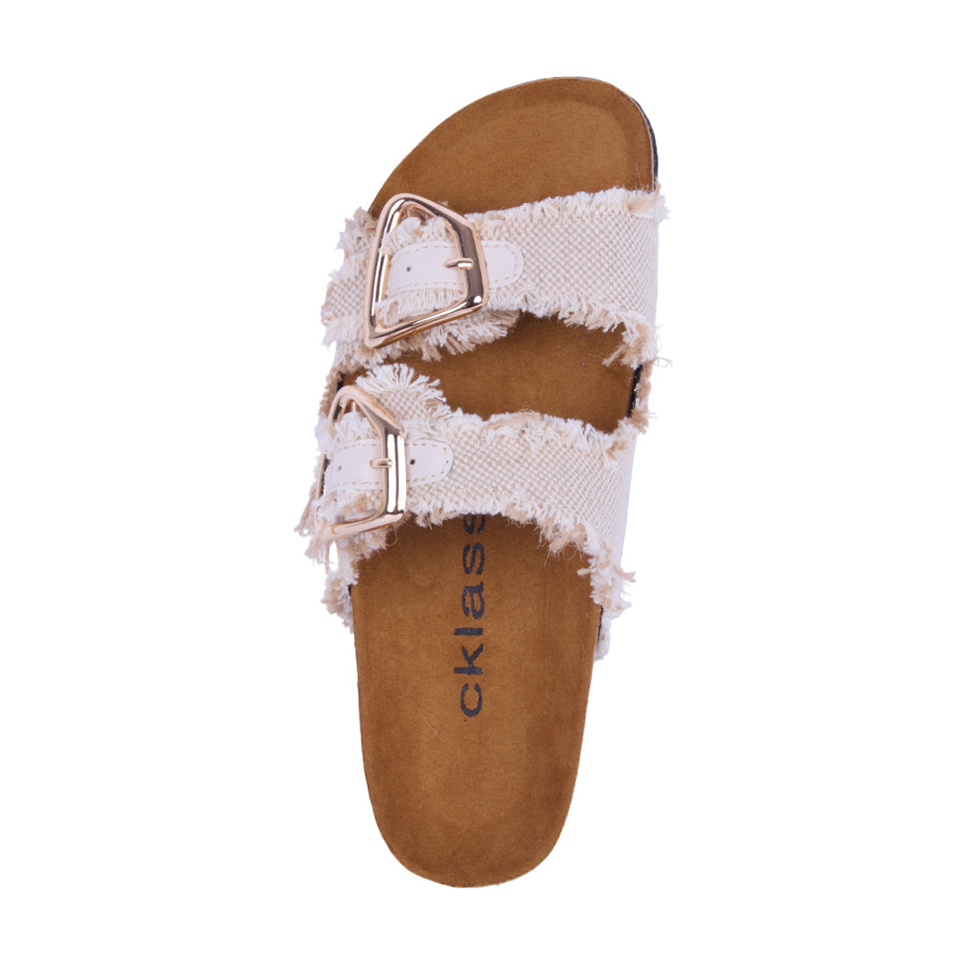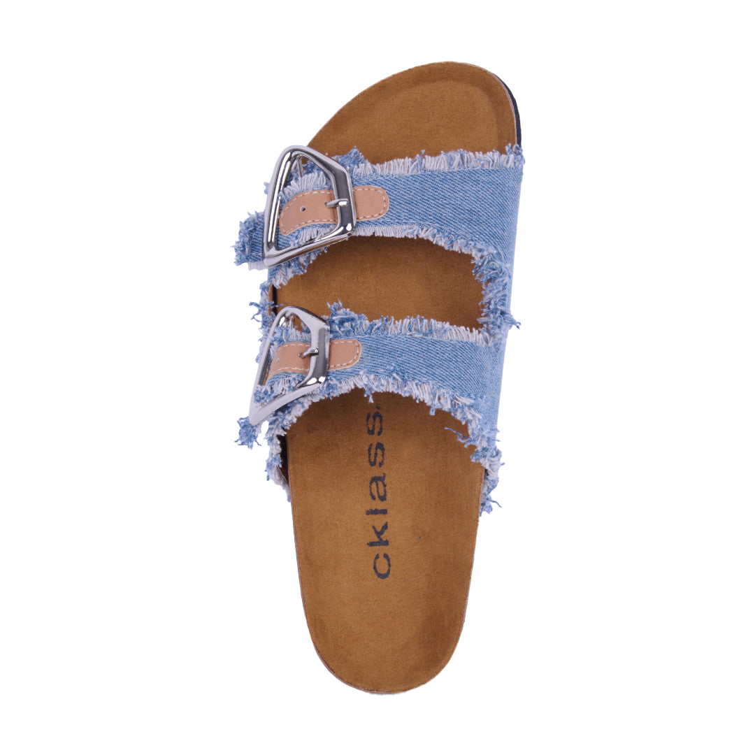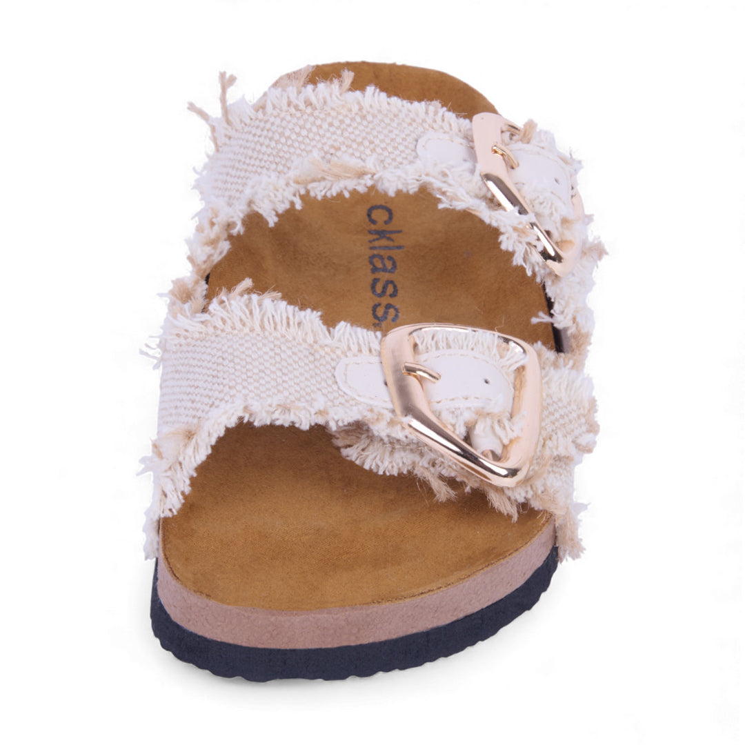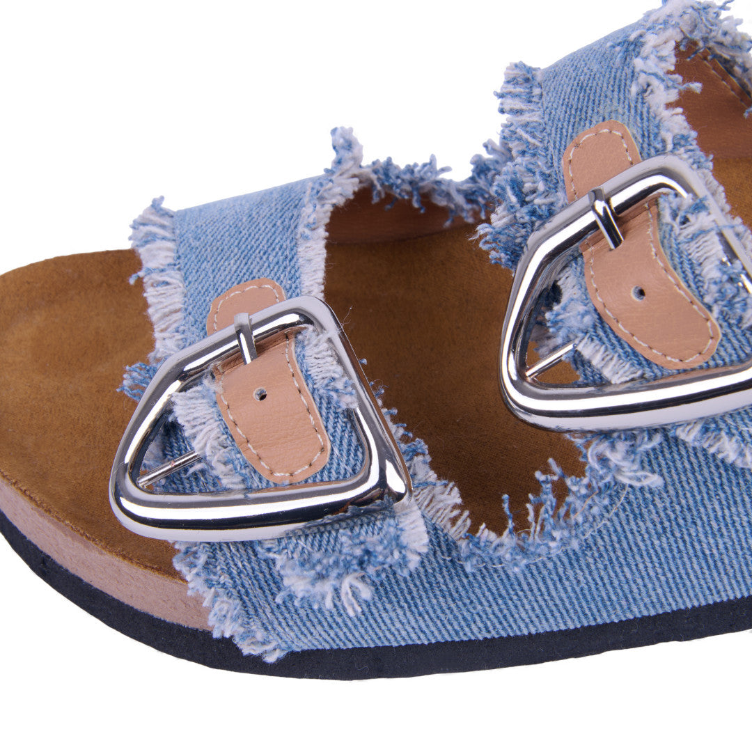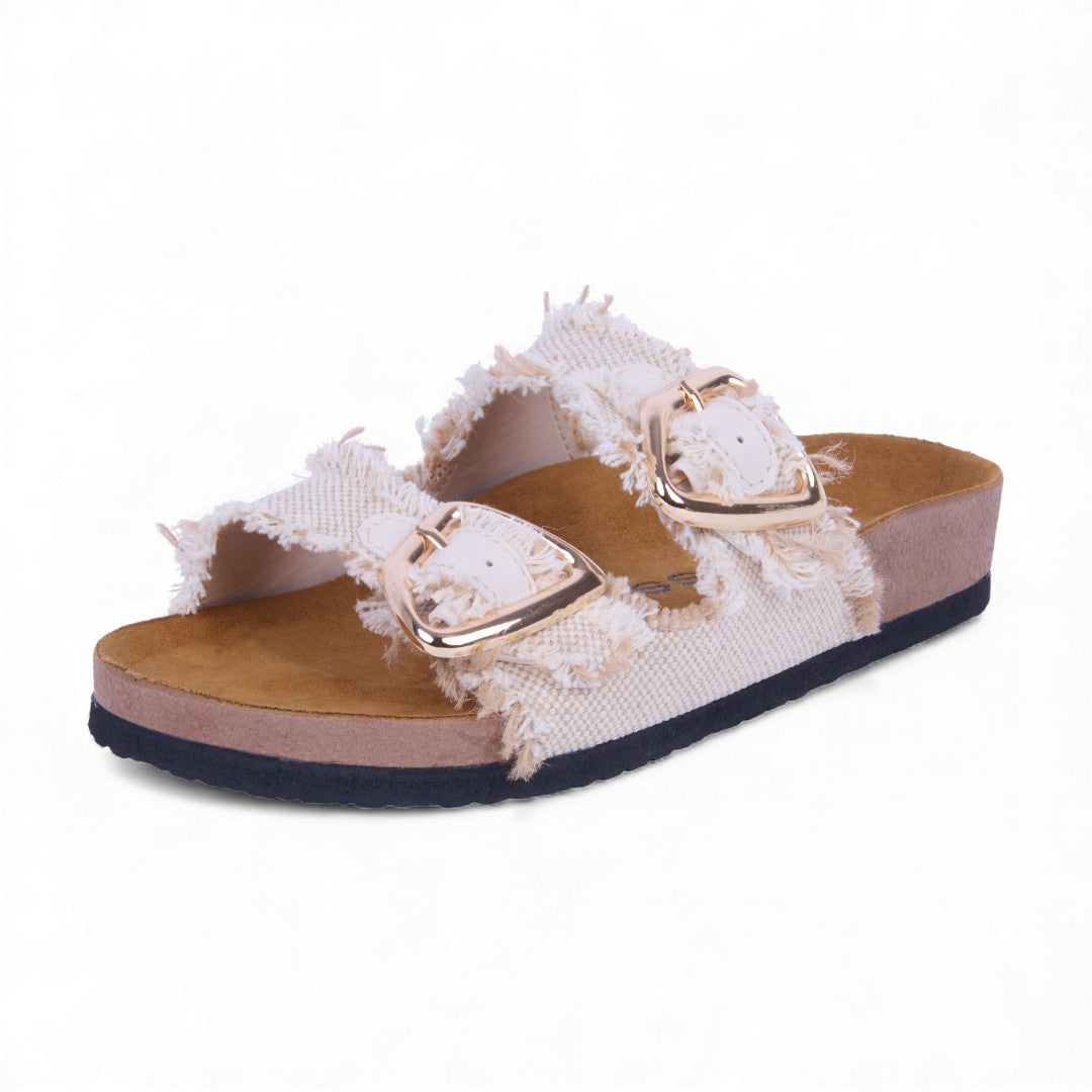 Dúo de sandalias de piso tipo Birkenstock con látigos ajustables y hebilla dorada, que brindan ajuste perfecto y estilo sofisticado. Plantilla sintética acolchada para comodidad prolongada. Colores hueso y mezclilla versátiles. Ideales para looks casuales, urbanos y modernos.