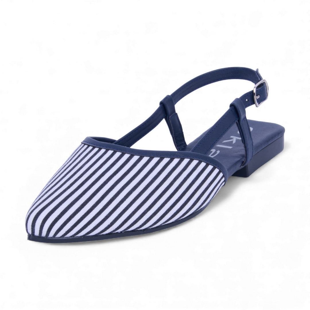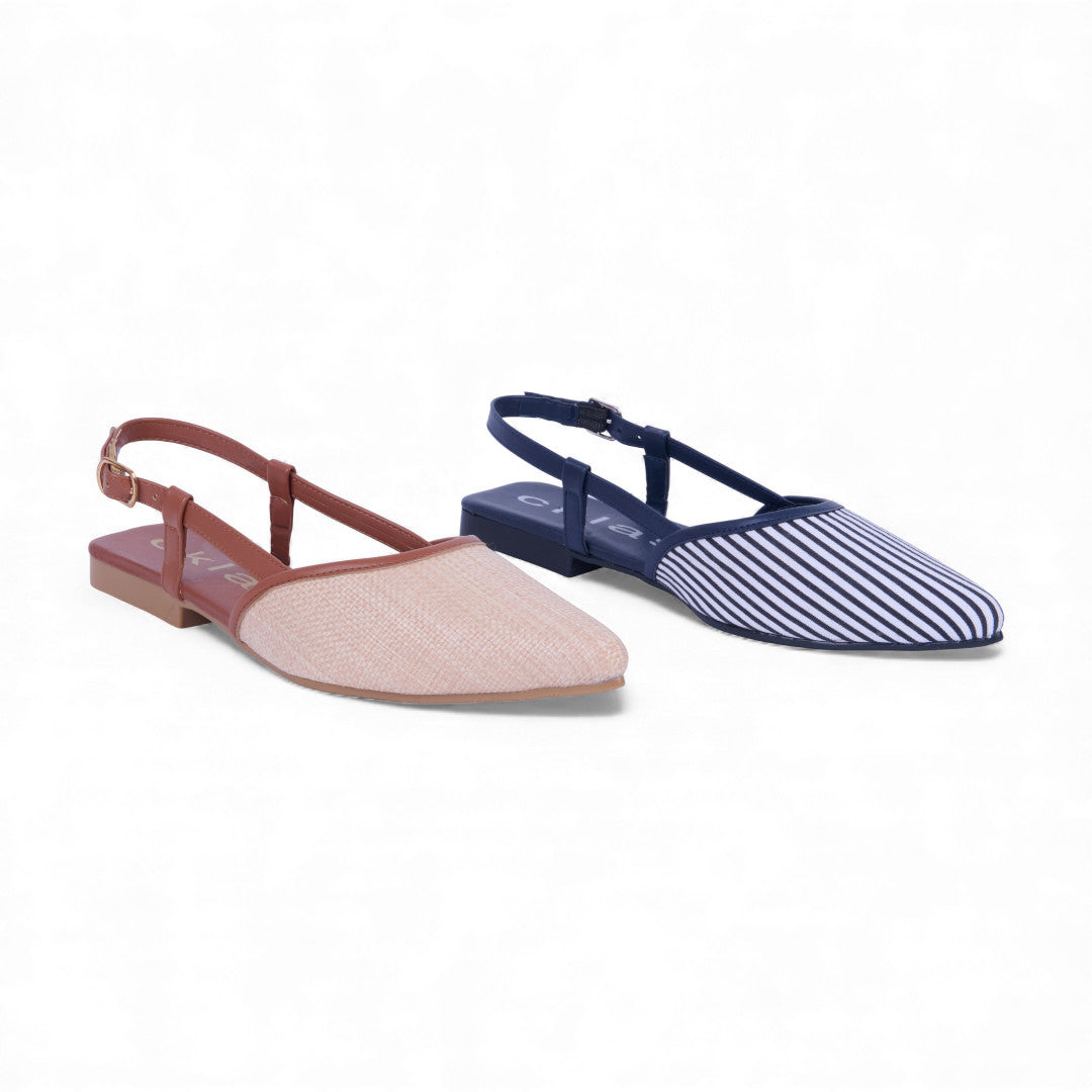 Dúo de ballerinas de piso con estampado moderno y pulsera ajustable destalonada. Plantilla sintética cómoda y suela resistente. Colores beige y marino versátiles y elegantes. Ideales para outfits casuales, paseos y eventos con estilo femenino y sofisticado.