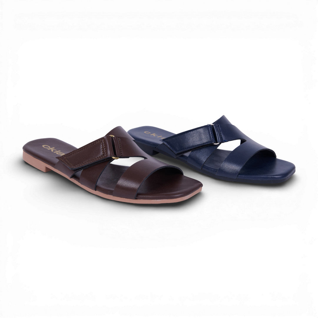 El dúo 599 incluye 2 pares de sandalias con exterior, interior y suela de material sintético. Diseño de doble tira ancha. Suela plana baja. Colores café y marino. Estilo casual para uso diario. Comodidad y versatilidad.