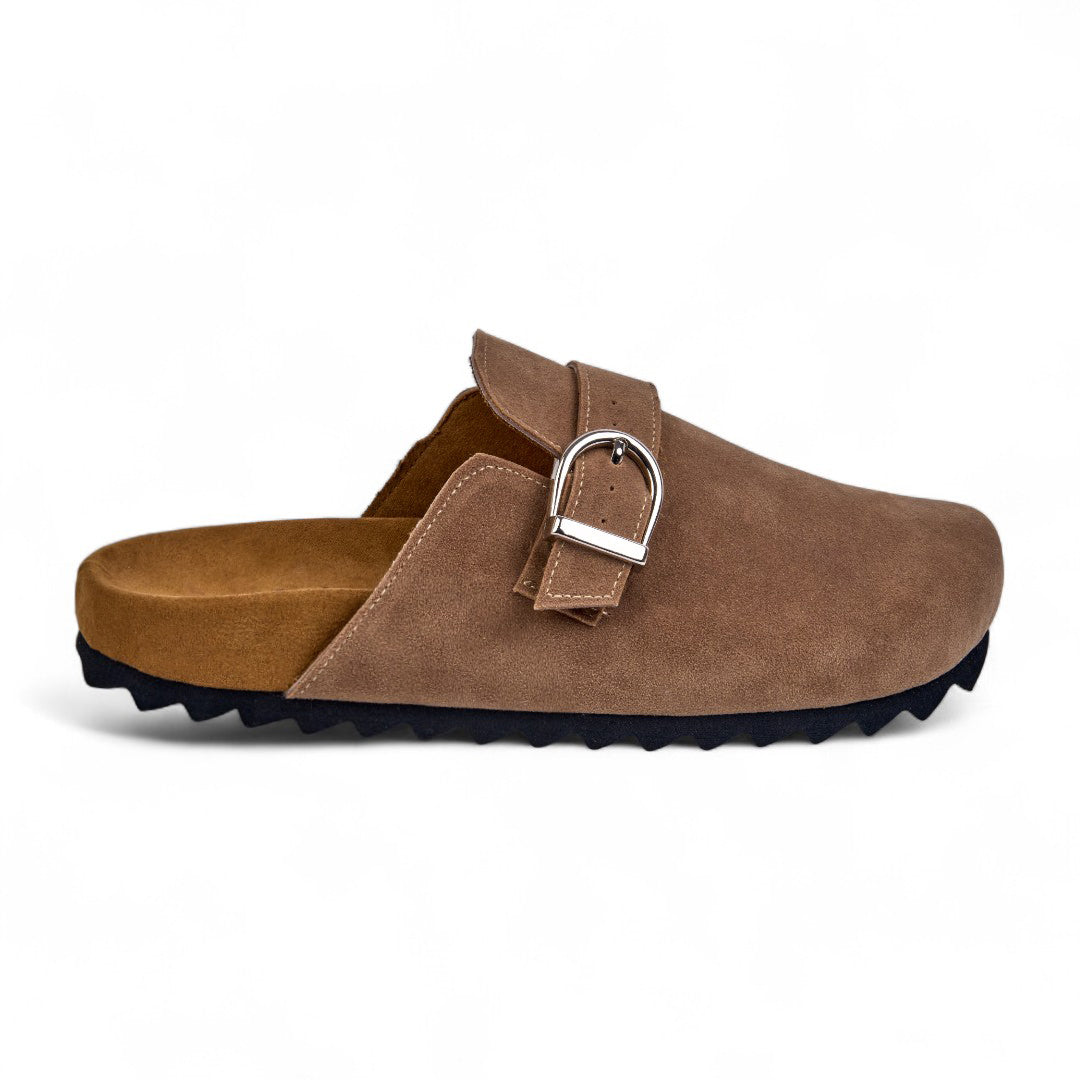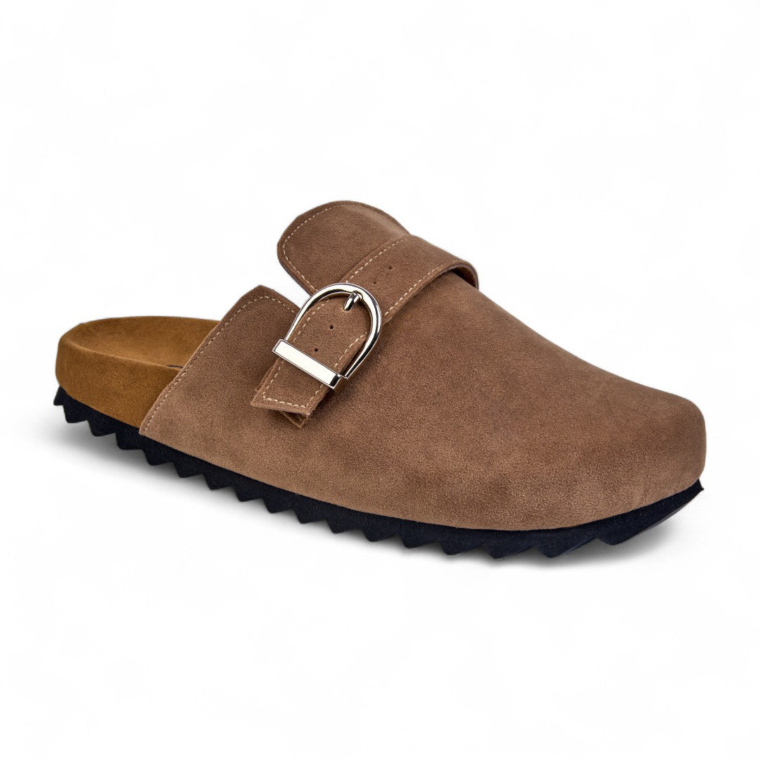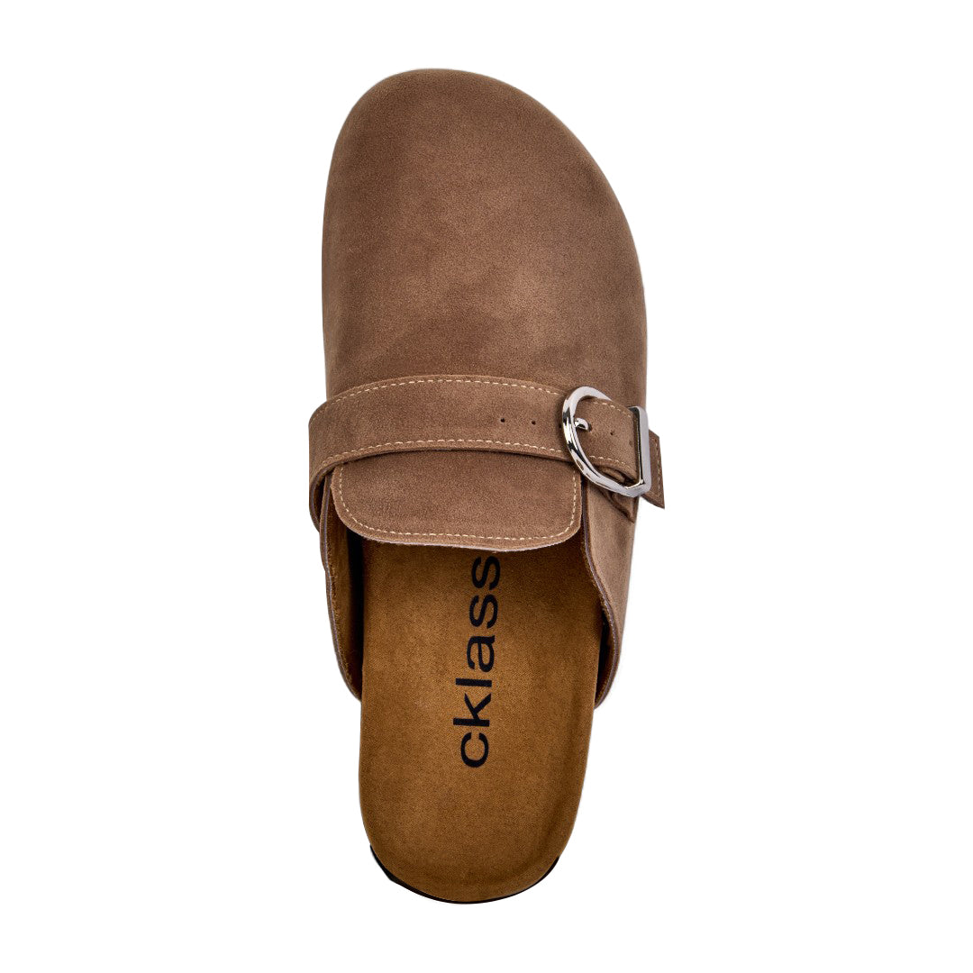 Sandalia de piso beige estilo birkenstock con herraje plateado; cómoda, ligera y perfecta para looks relajados o uso diario.