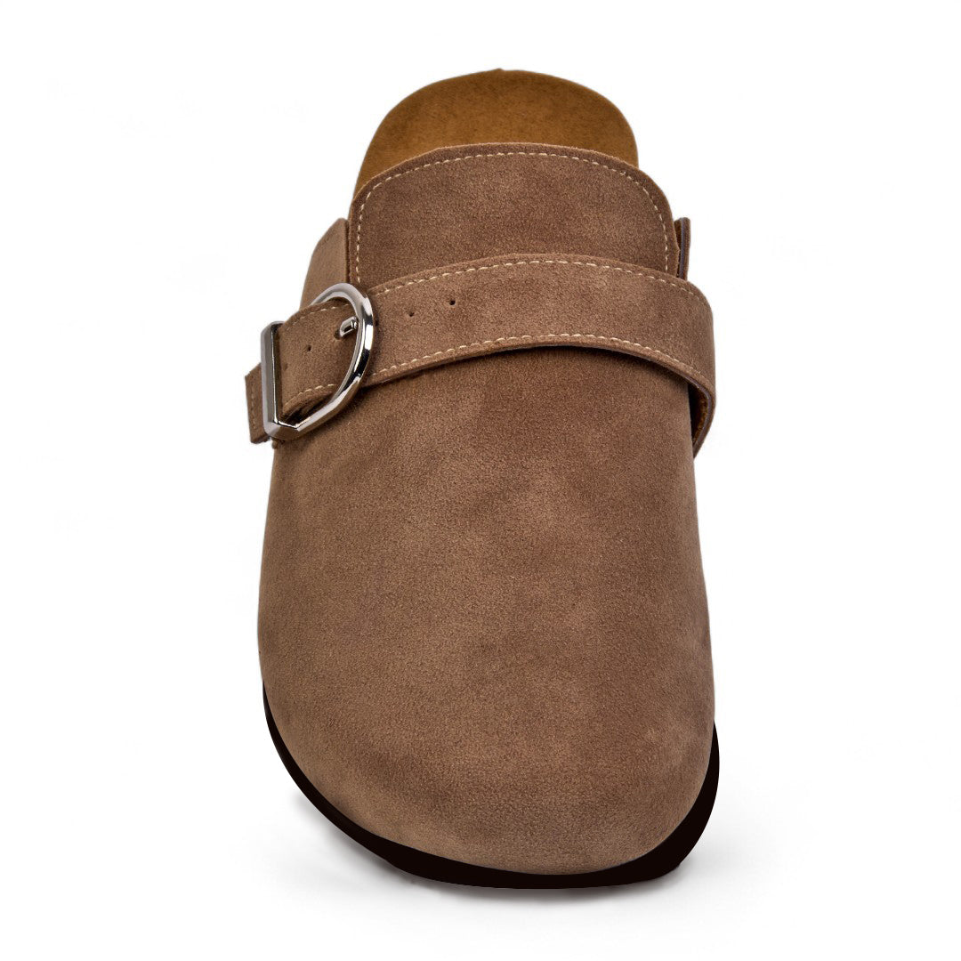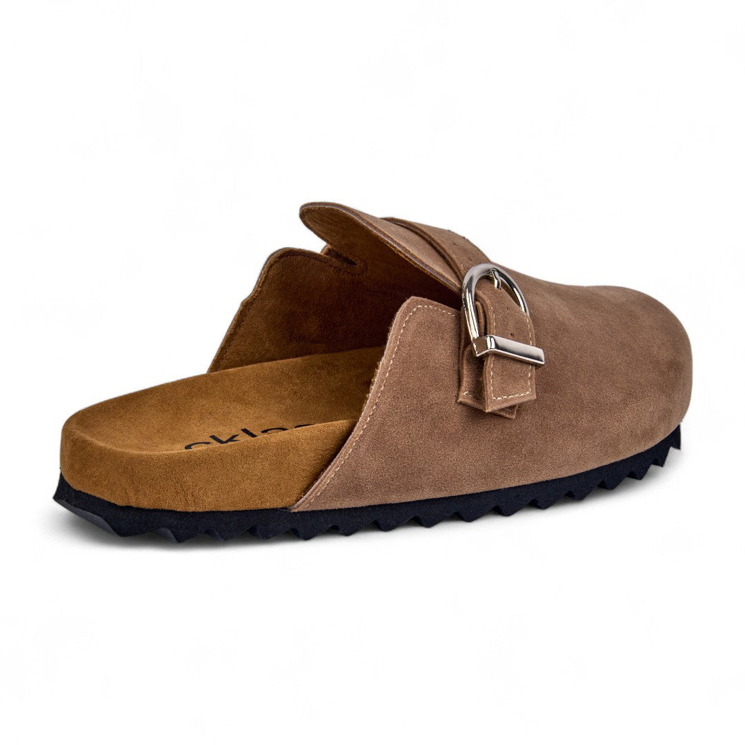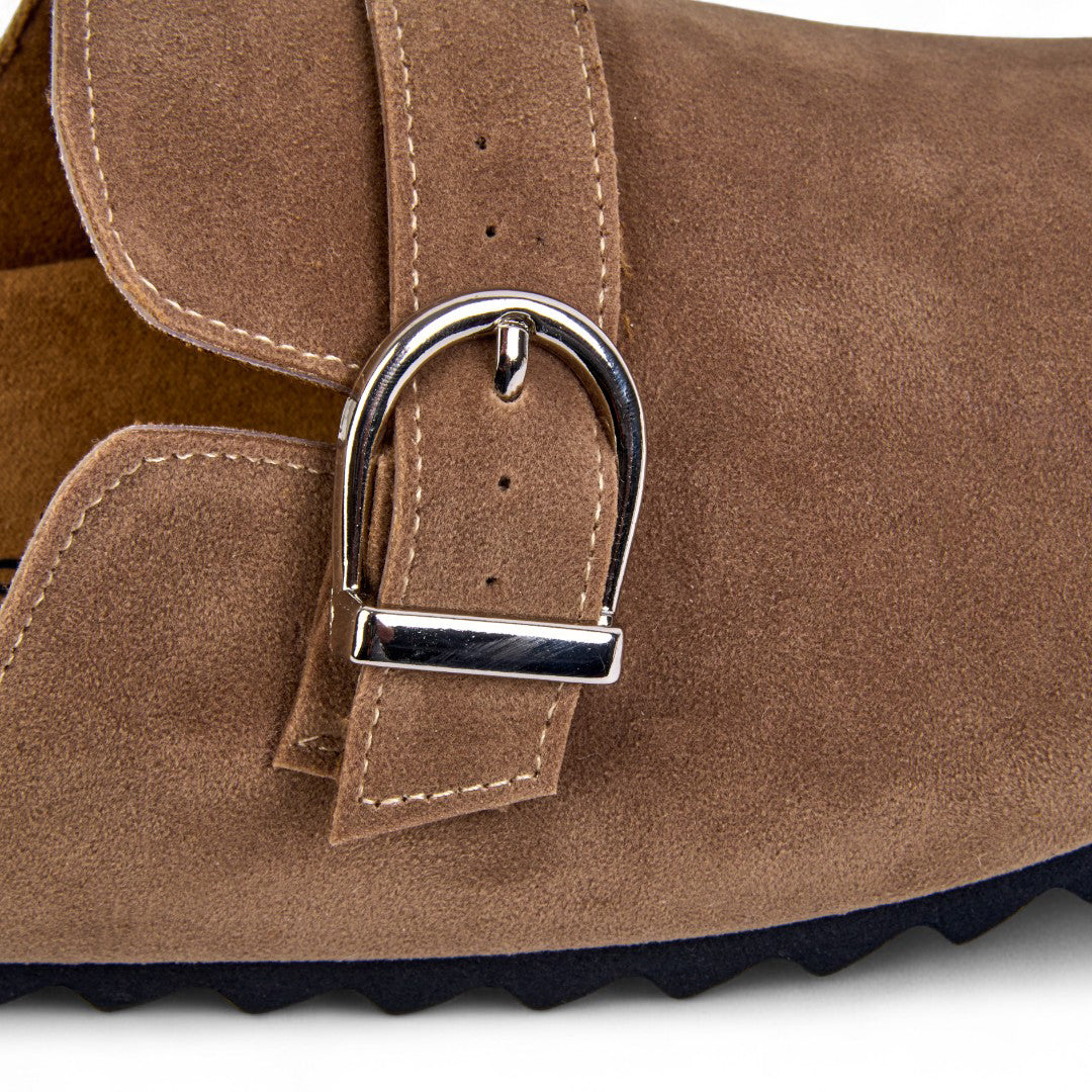 Sandalia de piso beige estilo birkenstock con herraje plateado; cómoda, ligera y perfecta para looks relajados o uso diario.