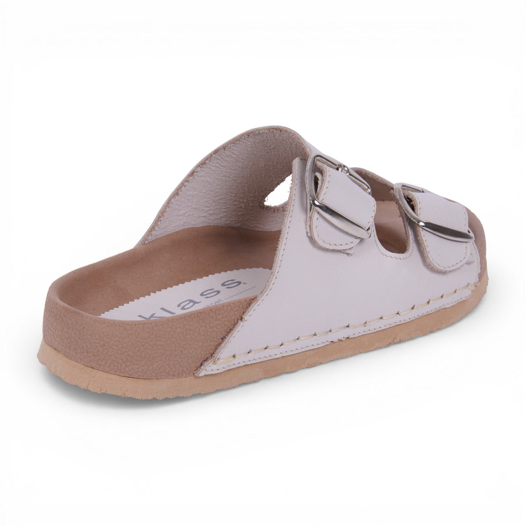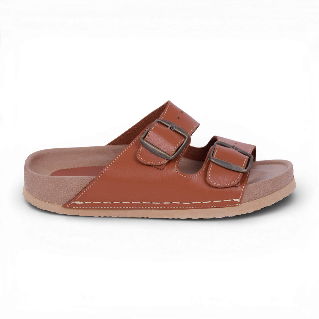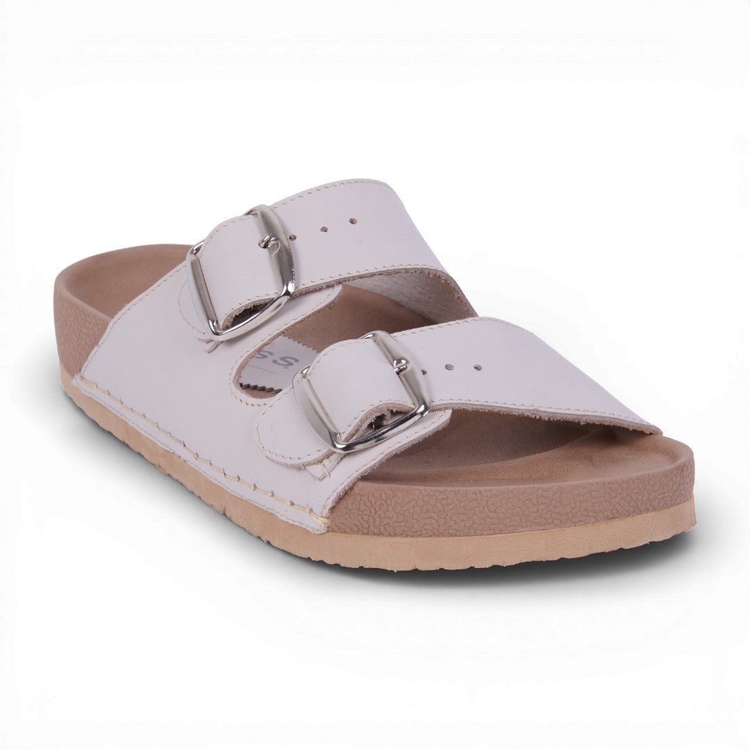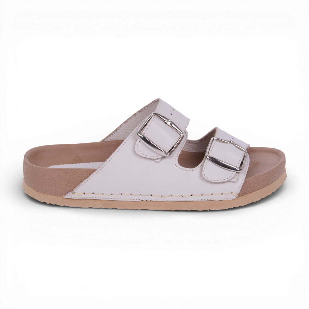 Sandalia de piso elaborada en piel, con interior y suela sintética. Diseño de doble hebilla ajustable y costuras visibles. Suela plana tipo anatómica. Disponible en dos colores: miel y hueso. Estilo casual cómodo, resistente y versátil.