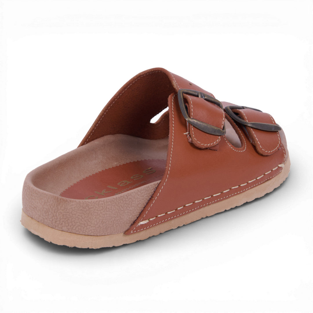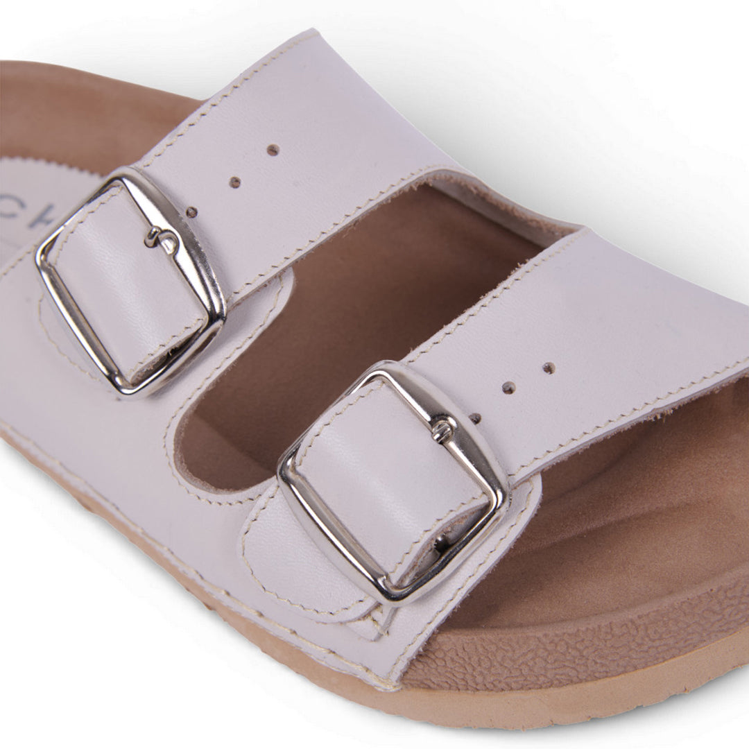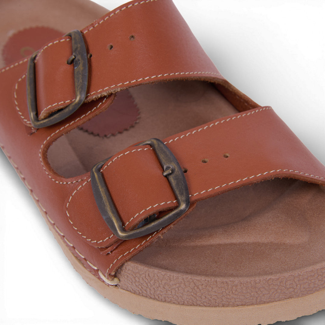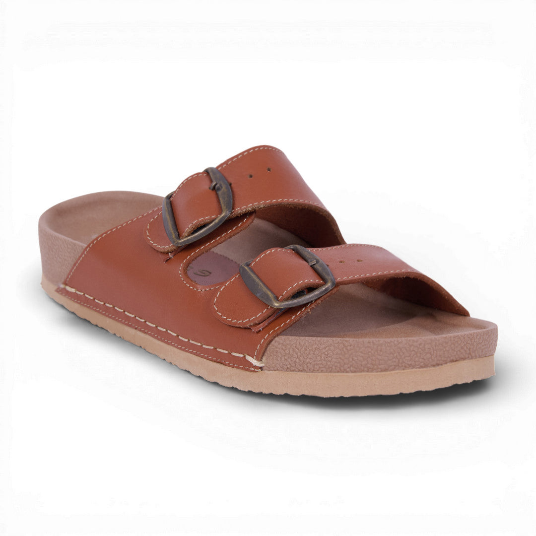Sandalia de piso elaborada en piel, con interior y suela sintética. Diseño de doble hebilla ajustable y costuras visibles. Suela plana tipo anatómica. Disponible en dos colores: miel y hueso. Estilo casual cómodo, resistente y versátil.