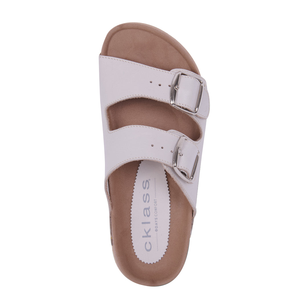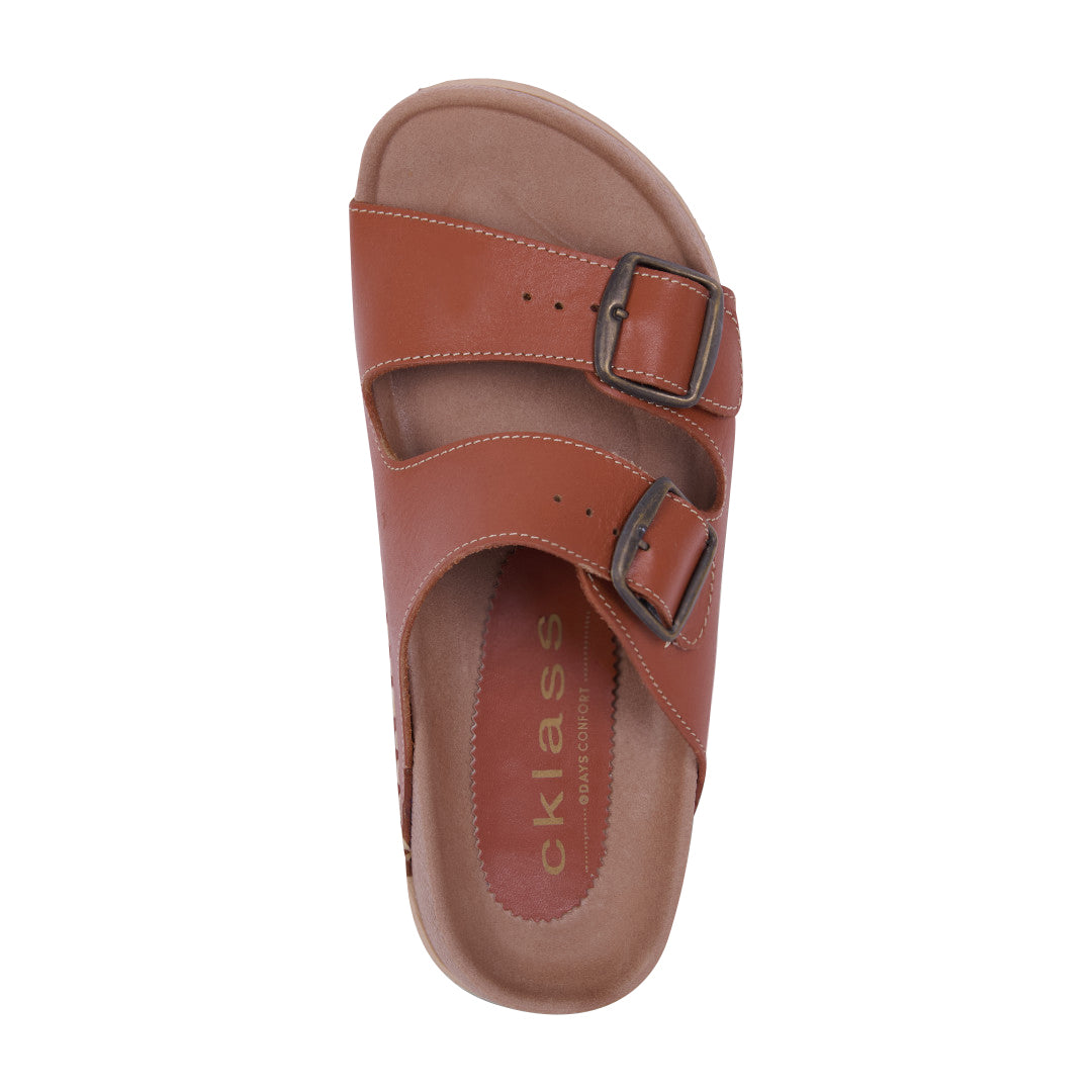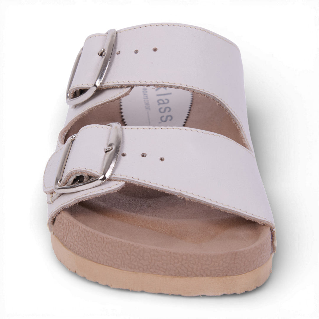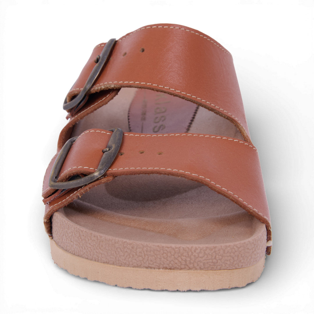 Sandalia de piso elaborada en piel, con interior y suela sintética. Diseño de doble hebilla ajustable y costuras visibles. Suela plana tipo anatómica. Disponible en dos colores: miel y hueso. Estilo casual cómodo, resistente y versátil.